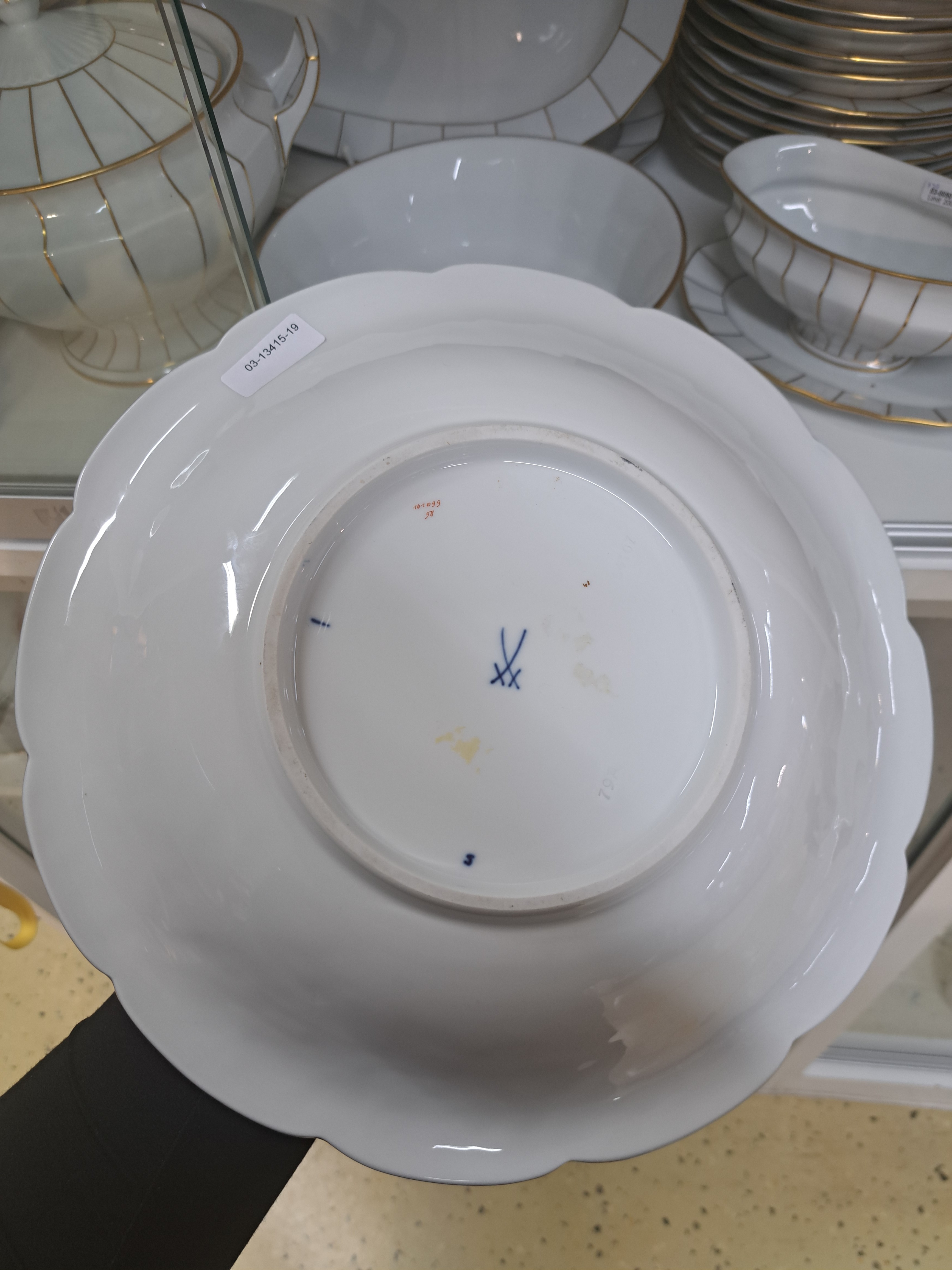 | Beschreibung | Magnificent bowl, Meissen, 2nd half of the 20th century, cobalt blue background, flag with leaf relief, matt and full gilding, colorful flower bouquet painting in the mirror, d.ca. 30 cm, 2nd choice |