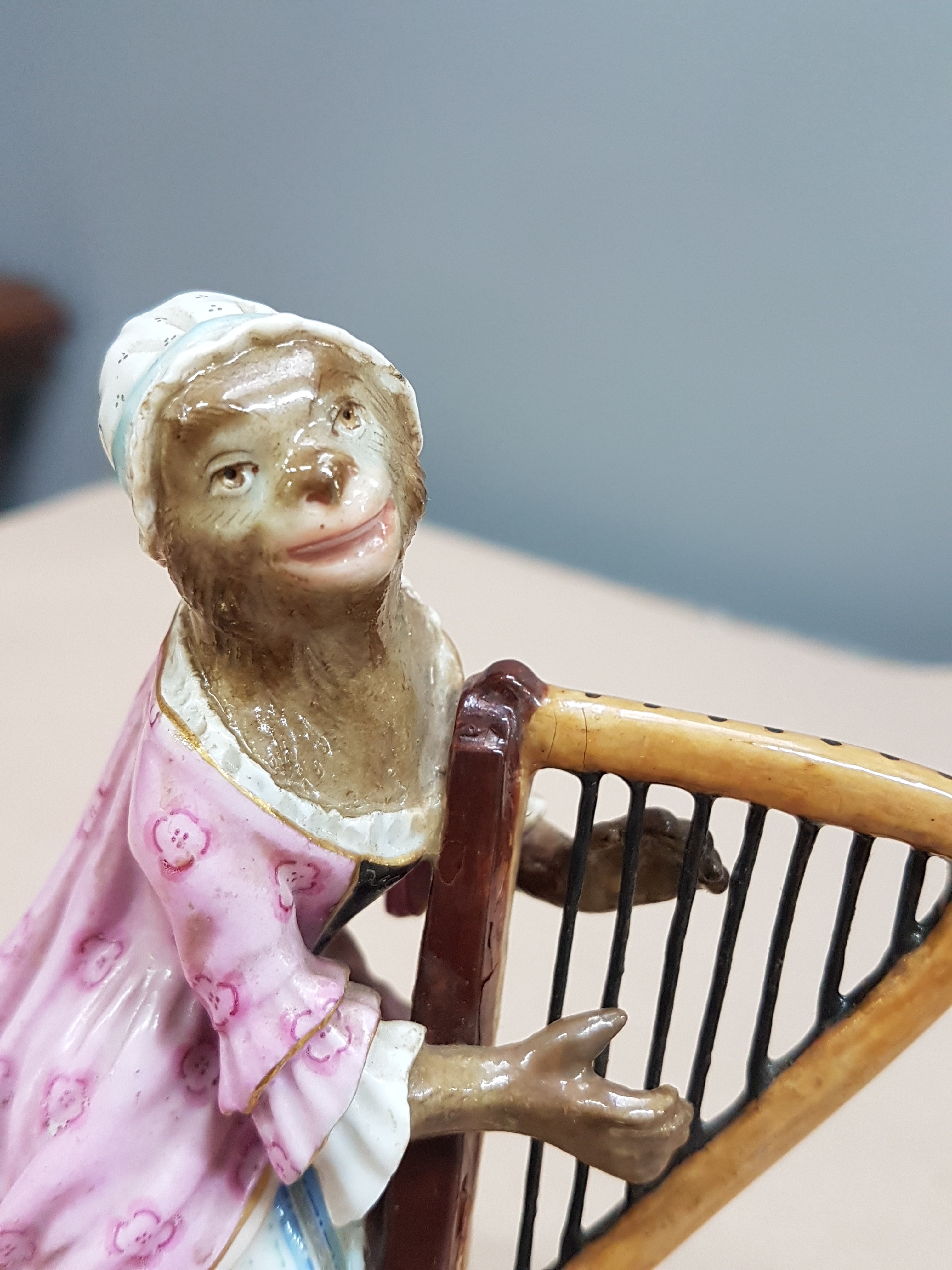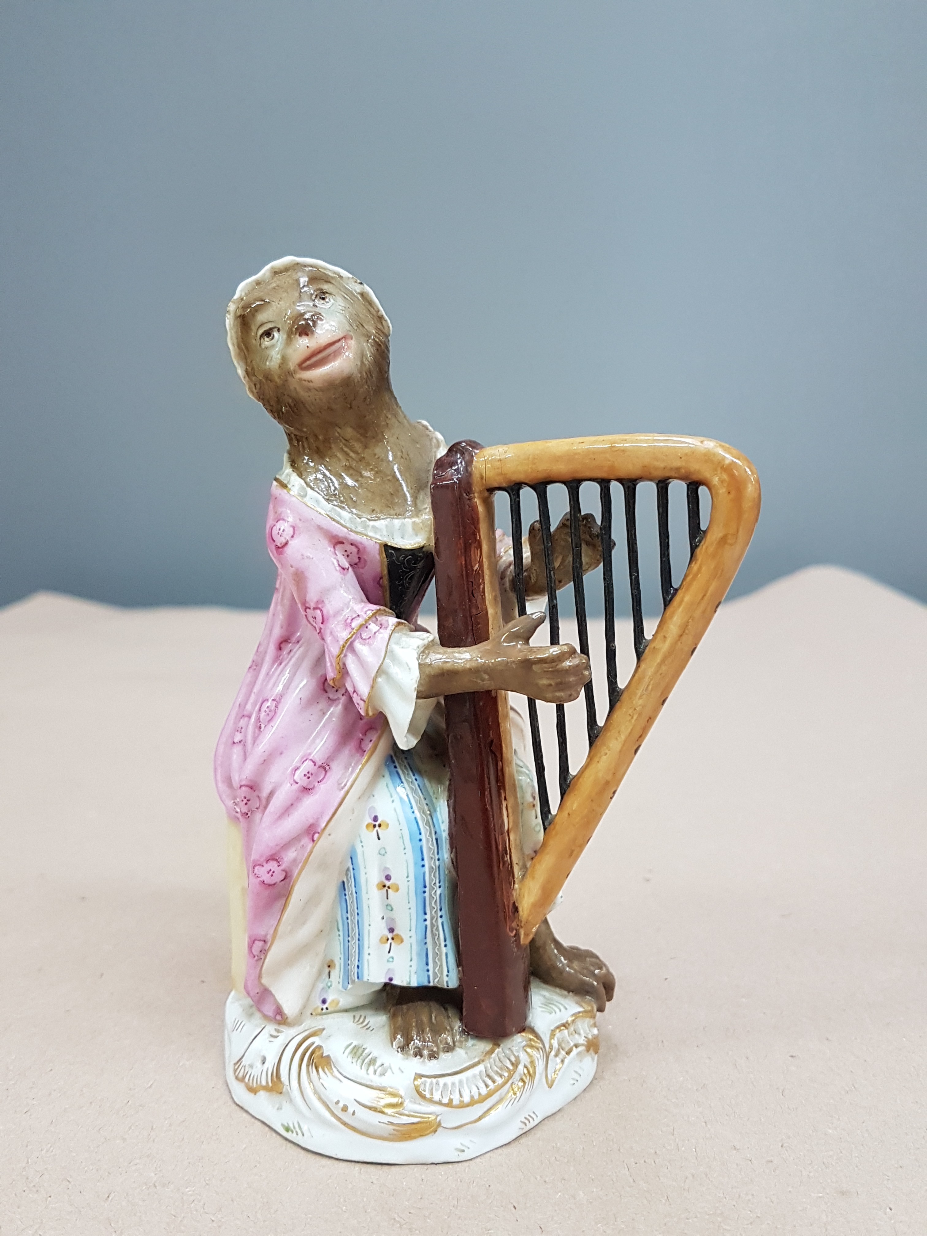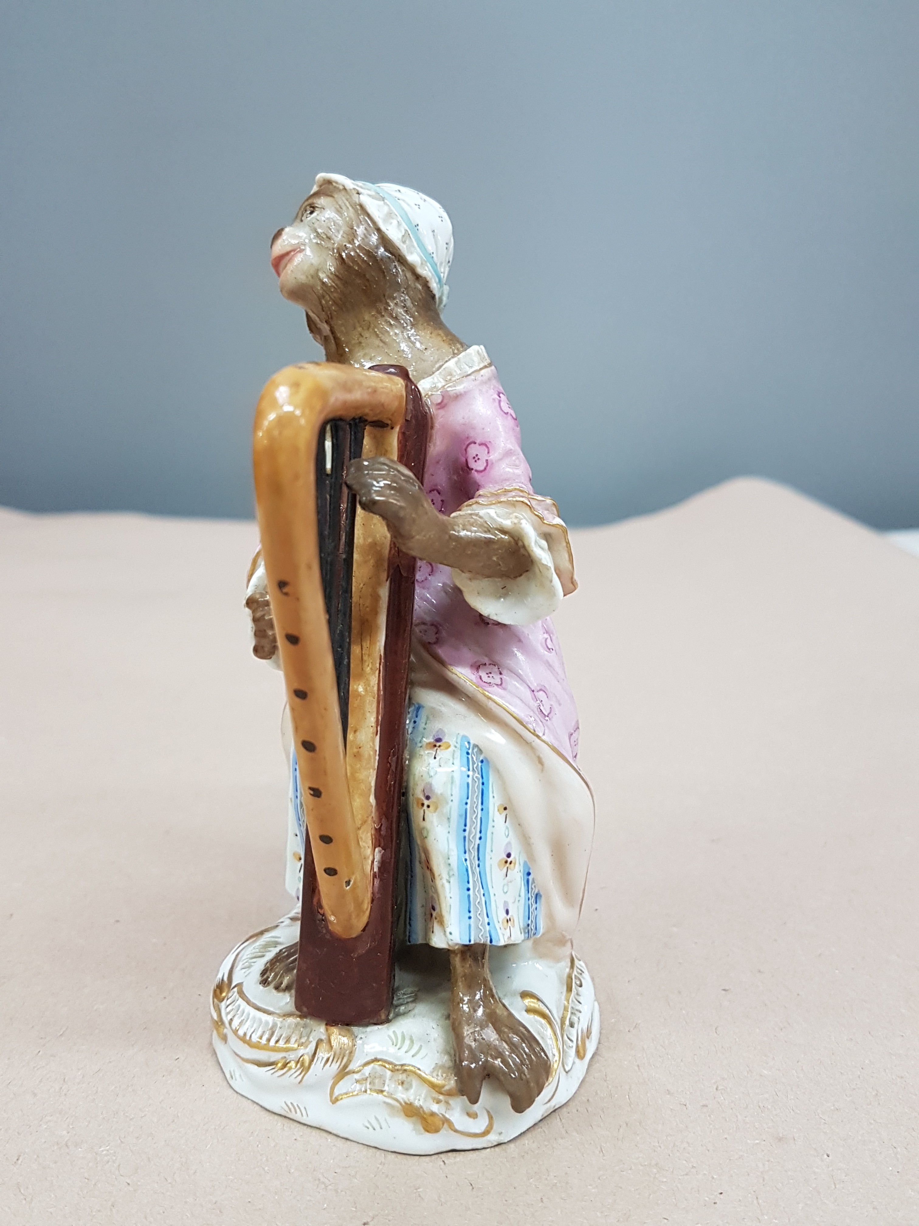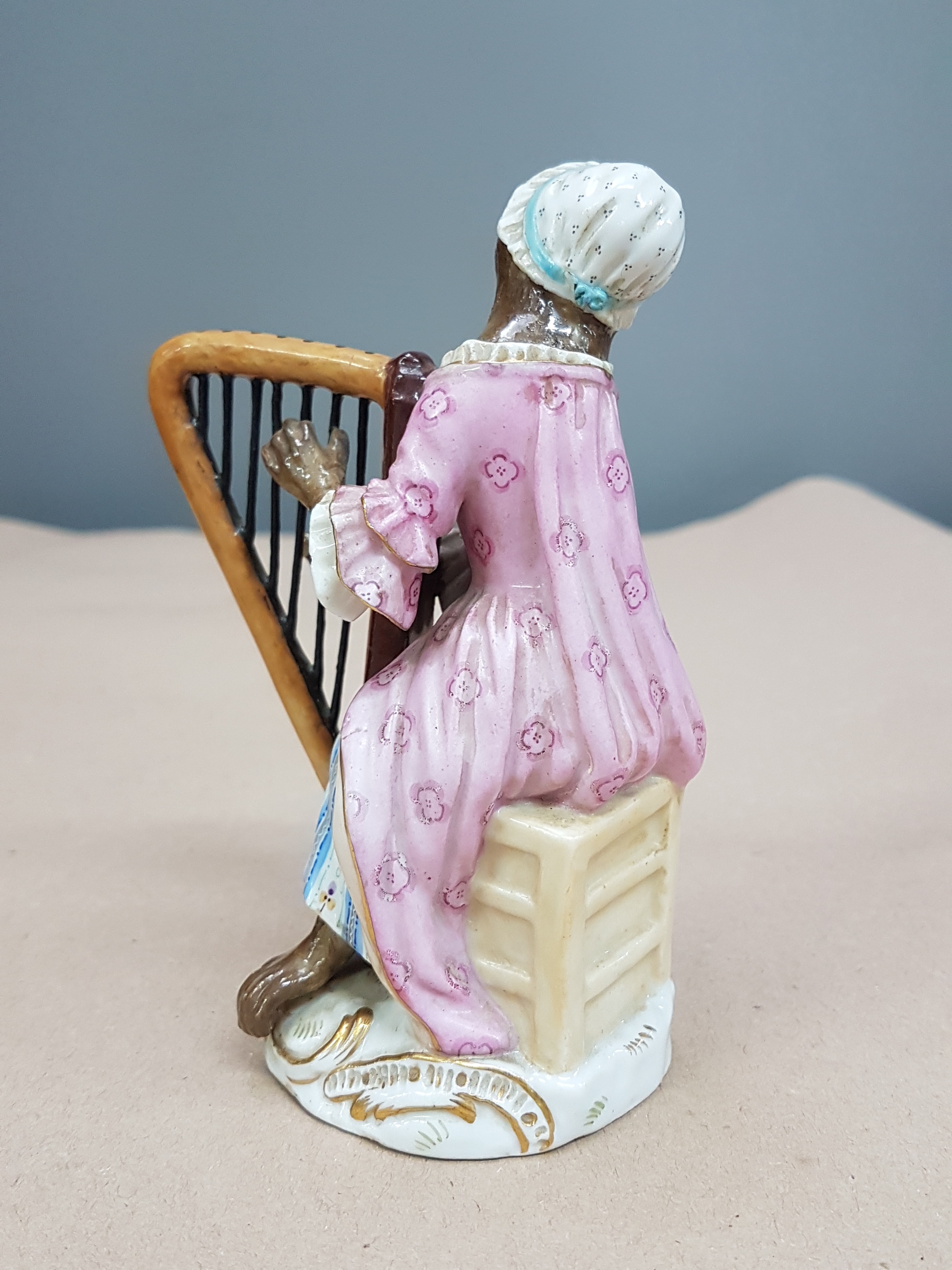 | Beschreibung | Porcelain figure, probably Meissen, around 1820/30, figure from the monkey band, harpist, model number 20, designed by J.J. Kaendler and Peter Reinicke, restored, swords only faintly visible |