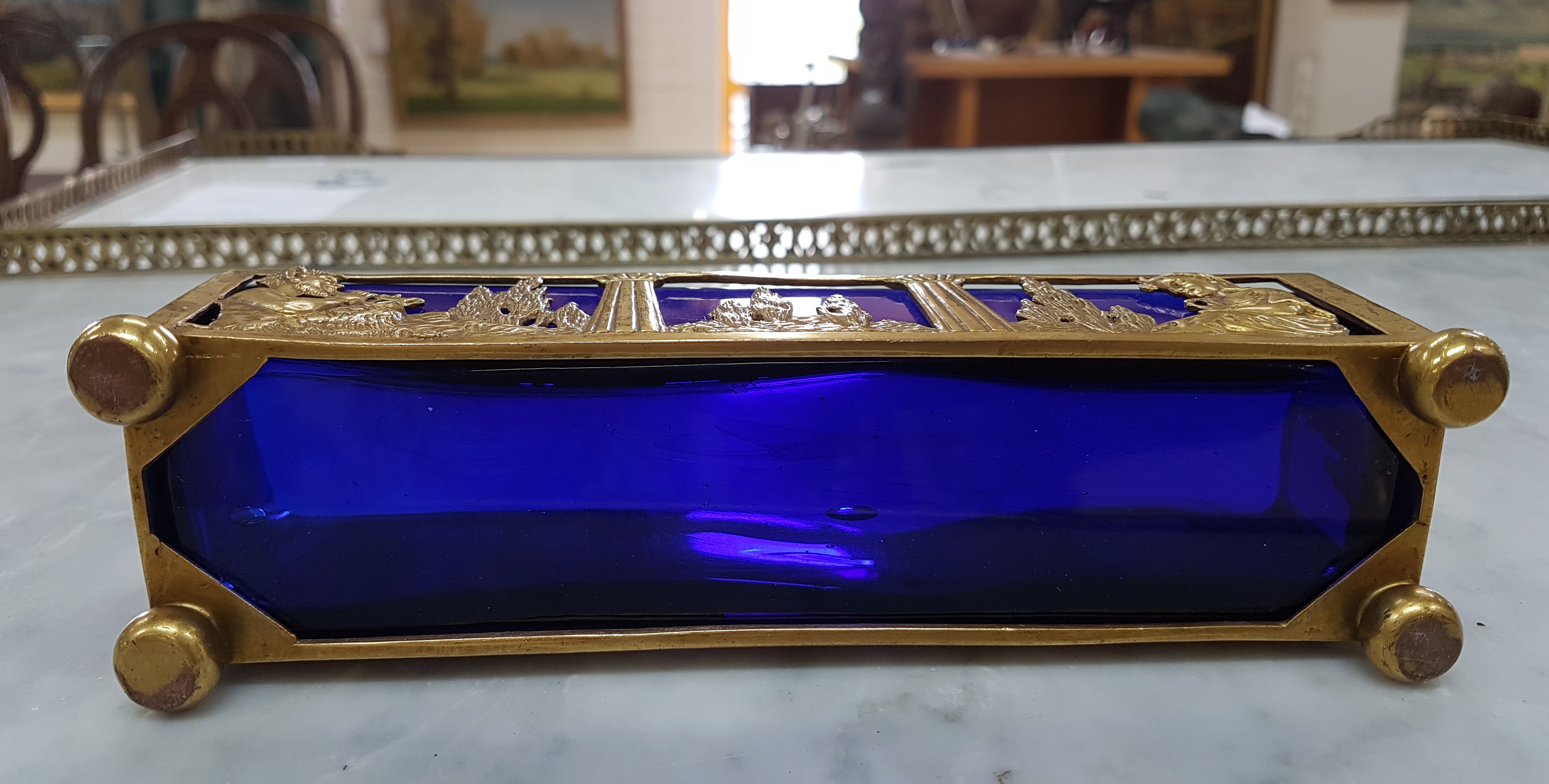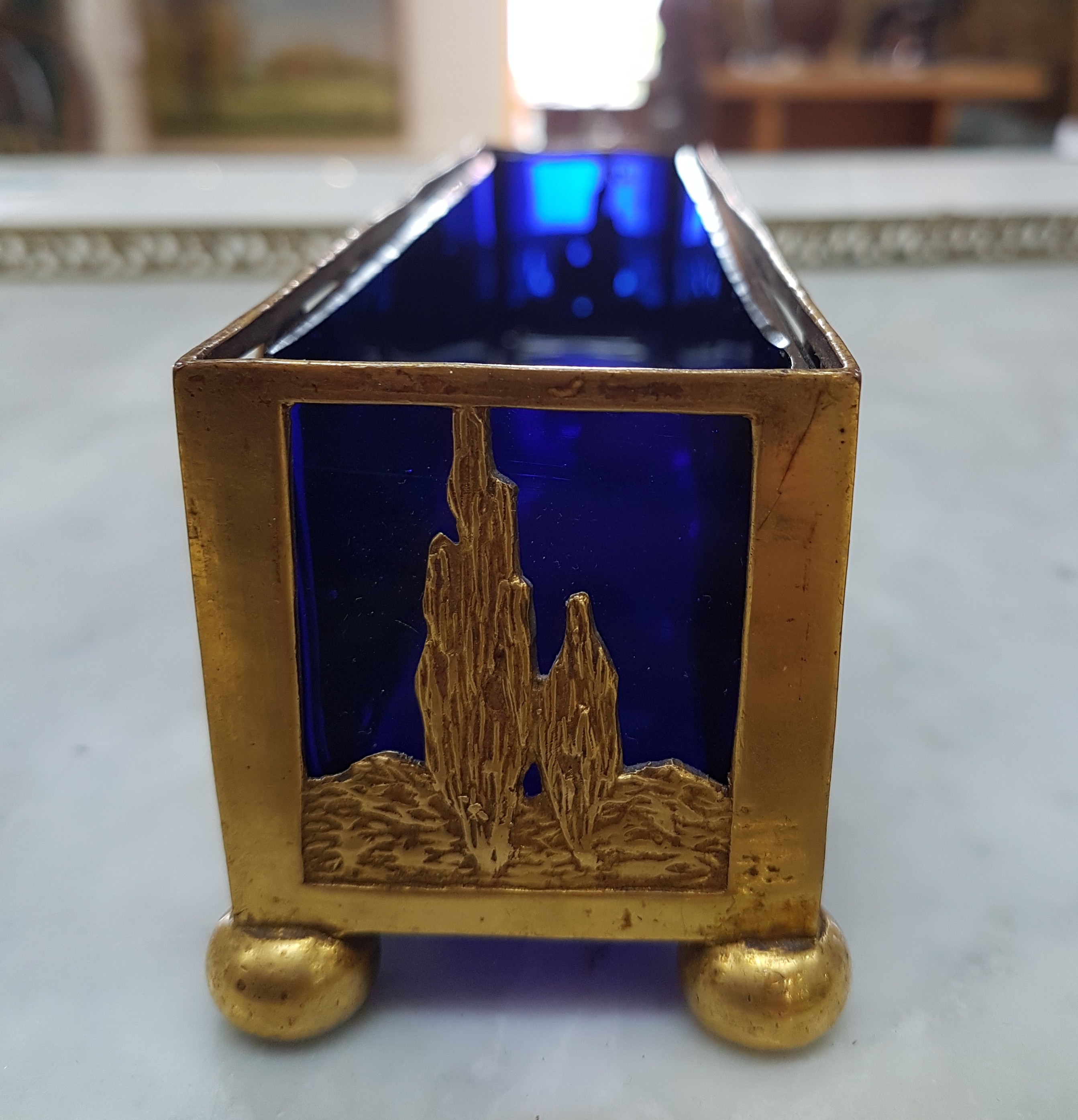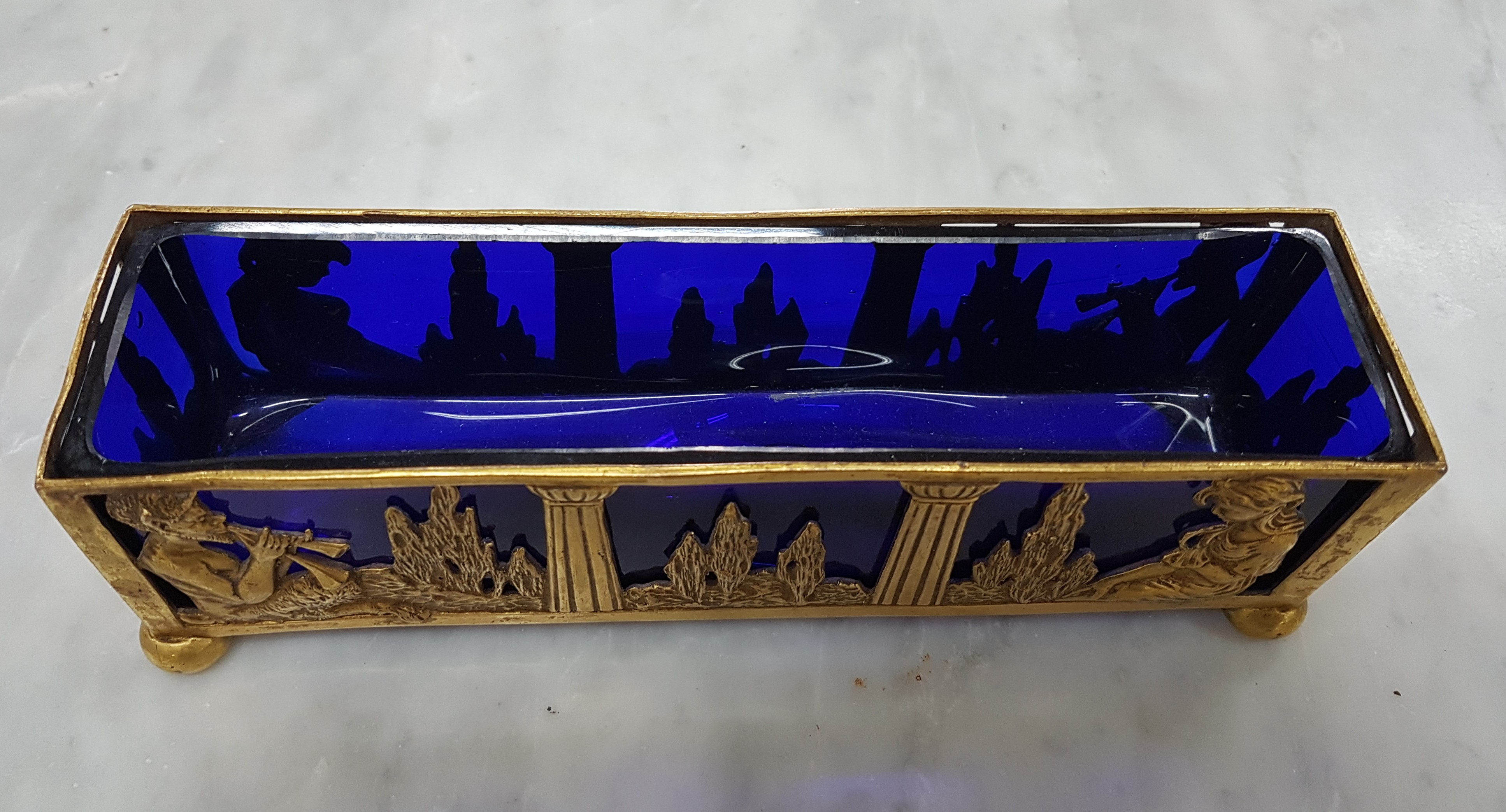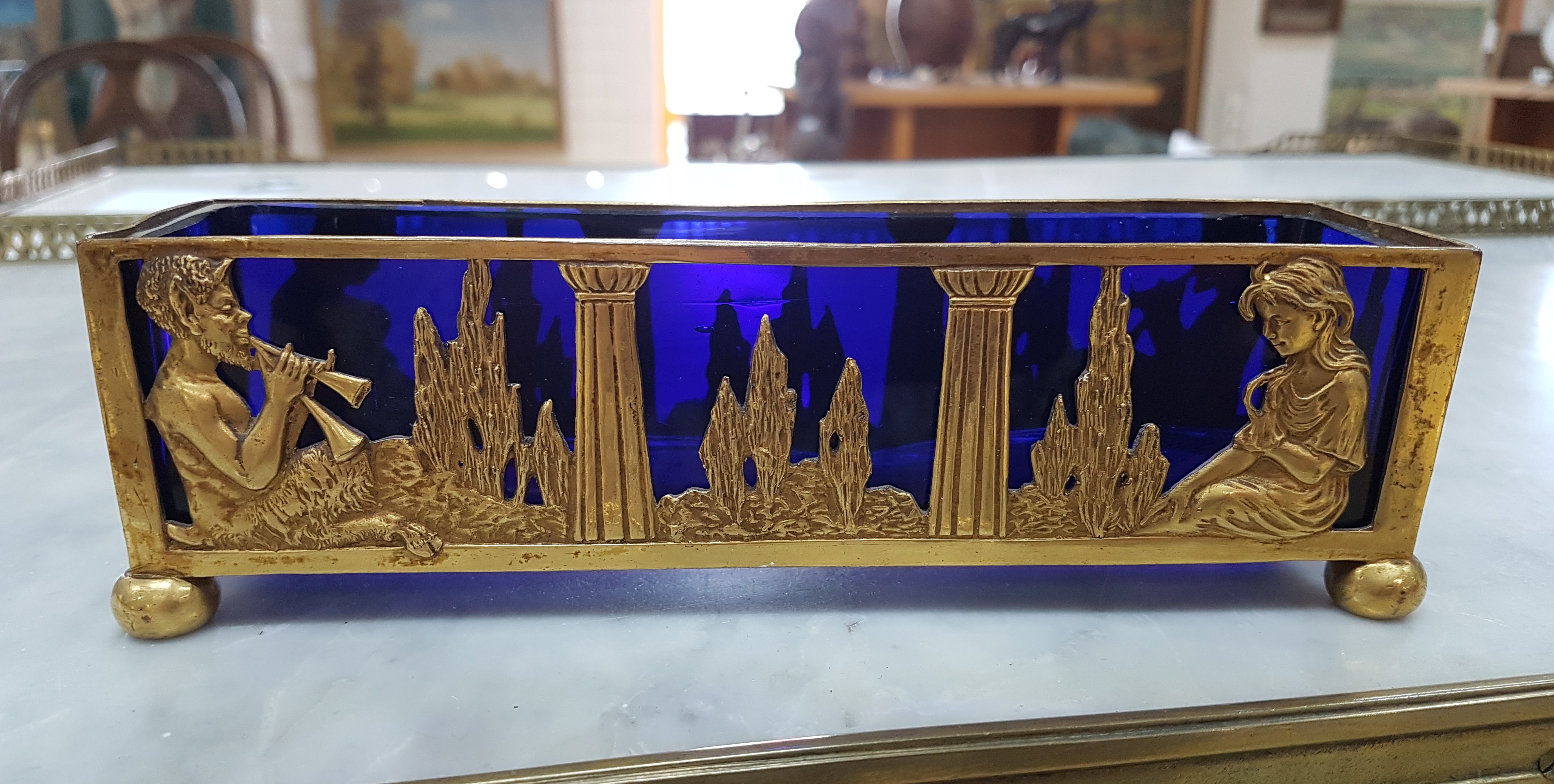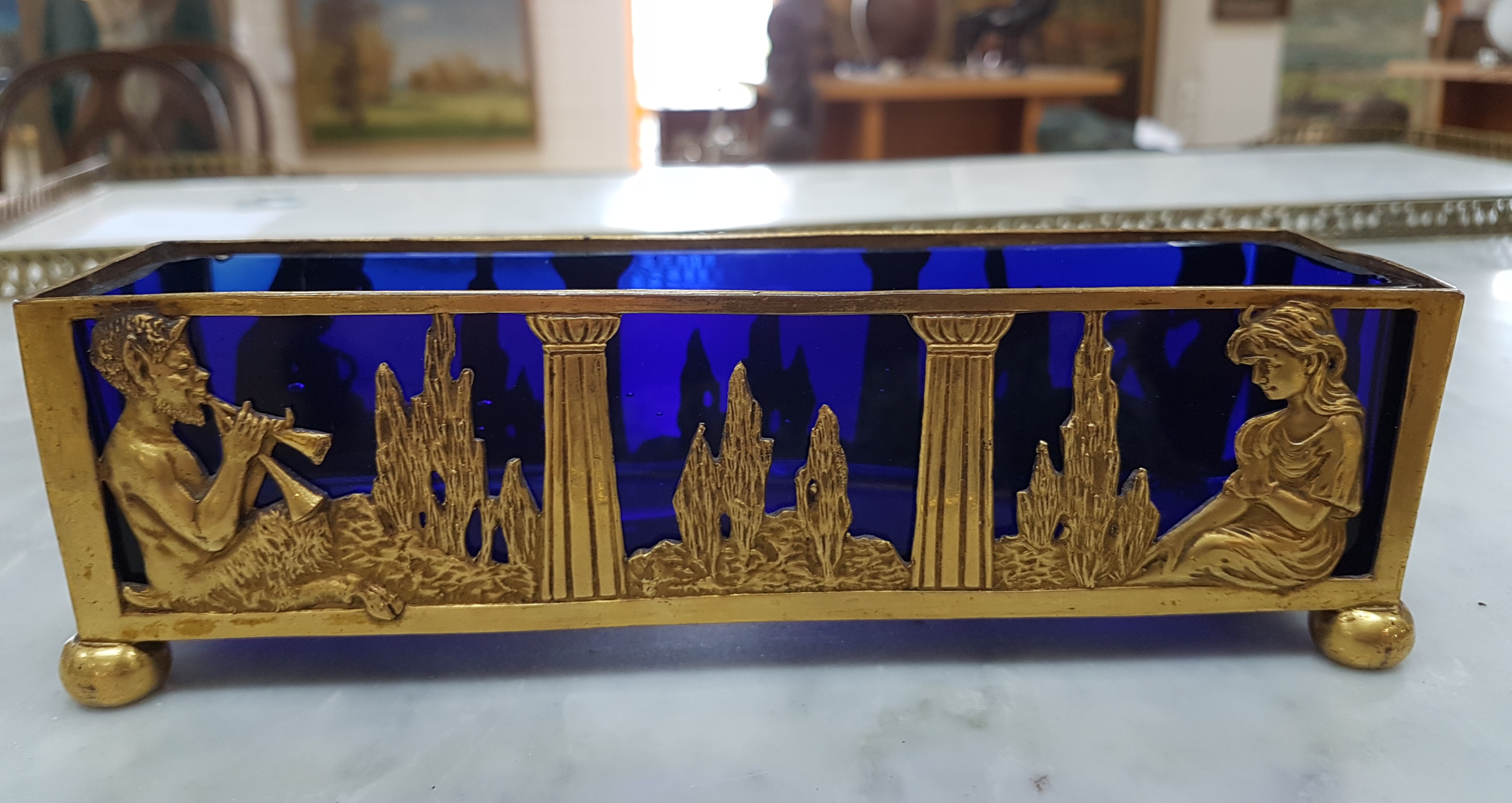 Small Jardiniere, France, around 1900, brass, landscape with Pan playing the flute and a young woman, blue glass insert, approx. 5.5x19x5cm