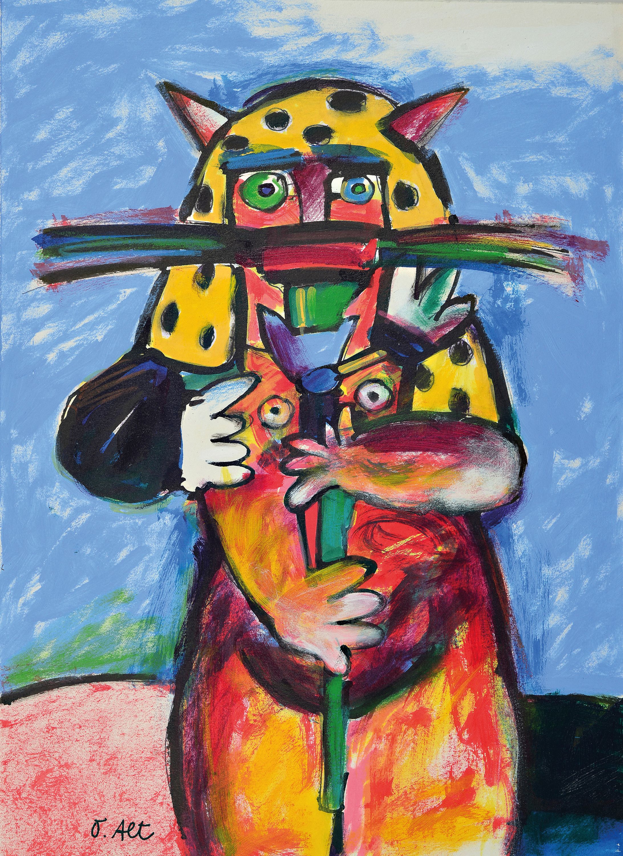 auf Zeichenpapier, ungerahmt, 40x30 cm, zirkusartig gestaltete Katzenbraut vor blauem