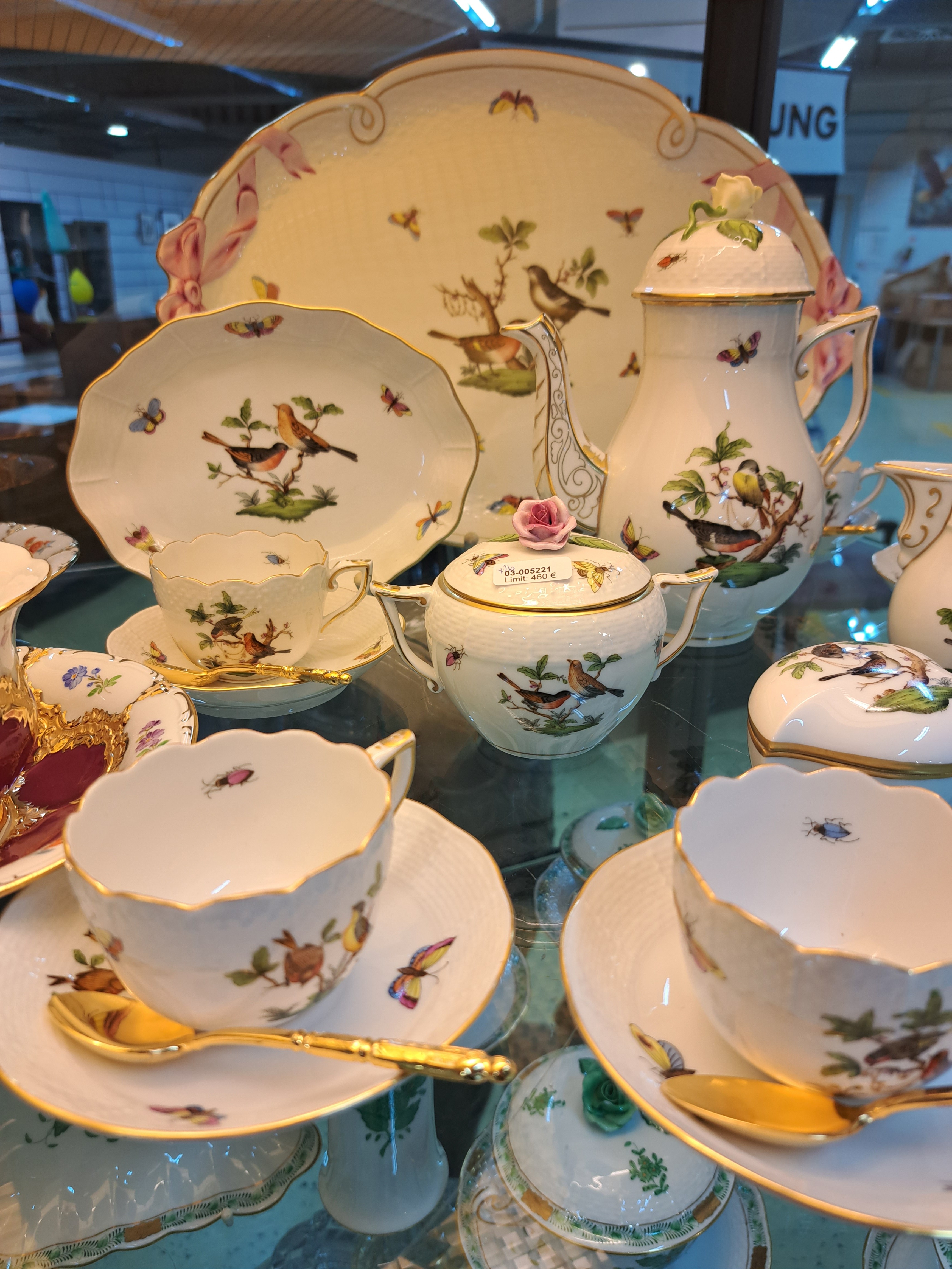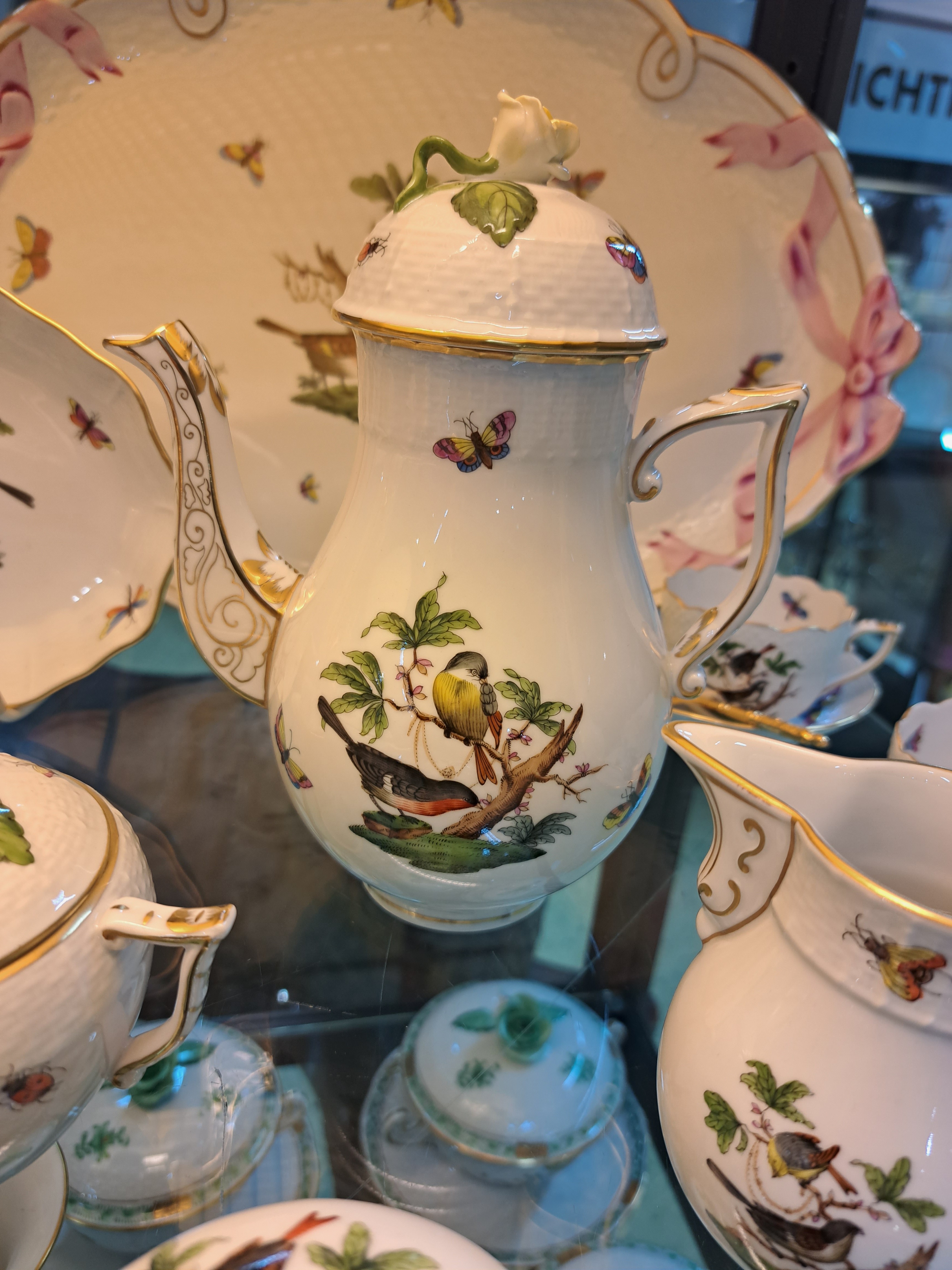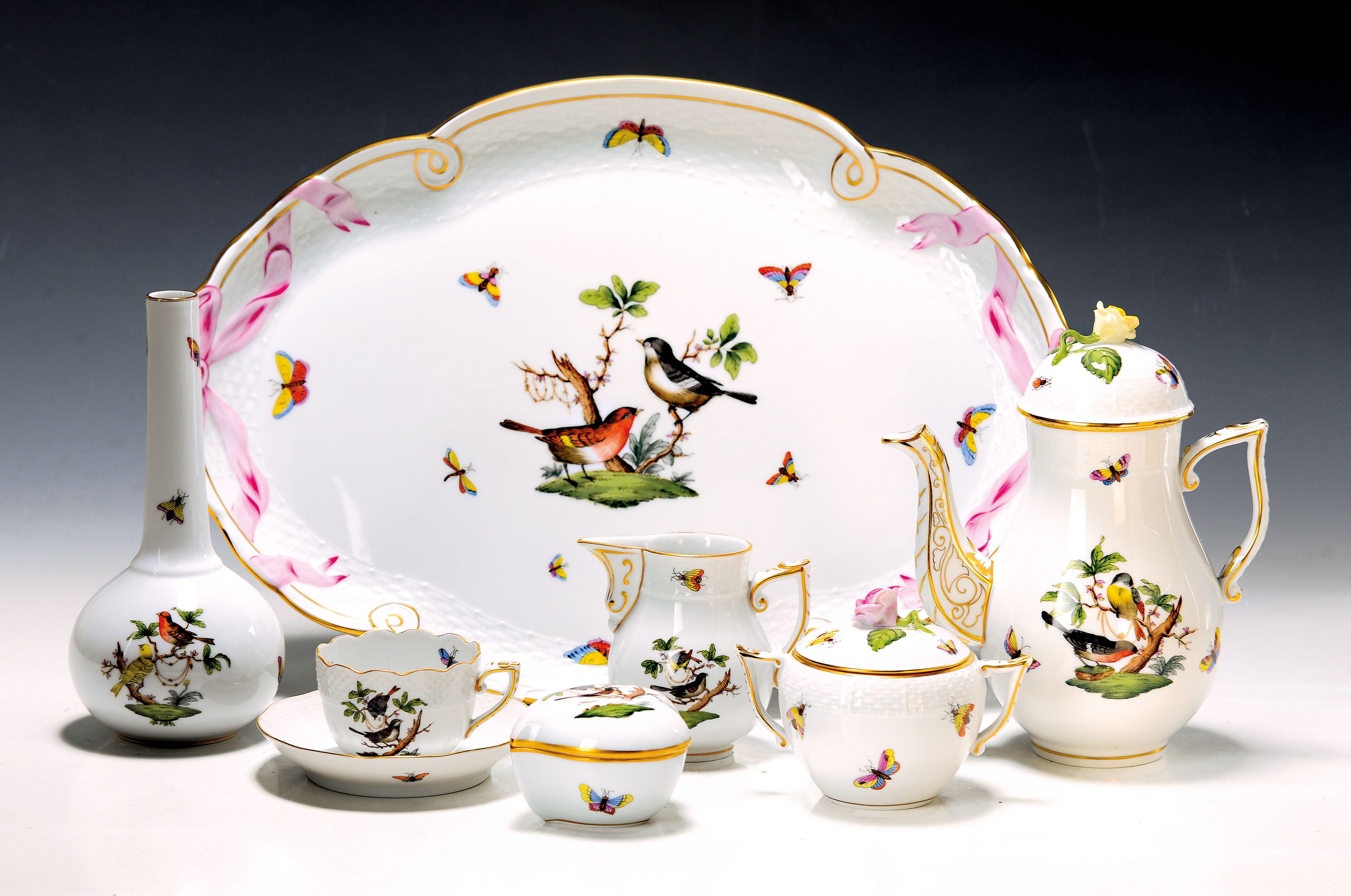 Mokkaservice, Herend, um 1970/80, Porzellan, für 6 Personen, polychrom bemalt, Goldstaffage, Dekor Rothschild Oiseaux, 6 Tassen mit UT, großes ovales Tablett 41x28 cm, Mokkakanne, Sahnegießer, Zuckerdose, kl. Deckeldose, gr. u. kl. Vase, ovale Schale, Alterssp.