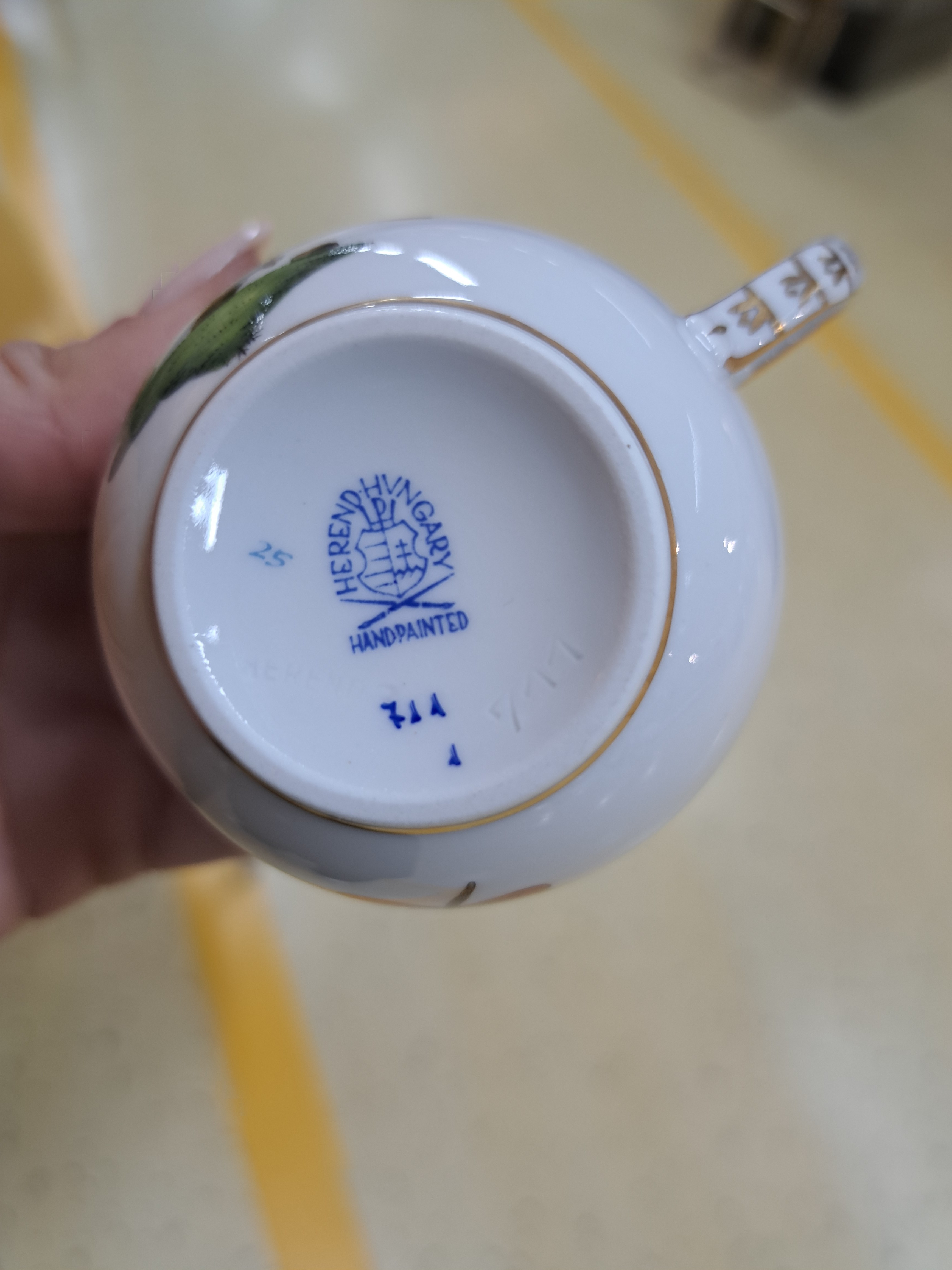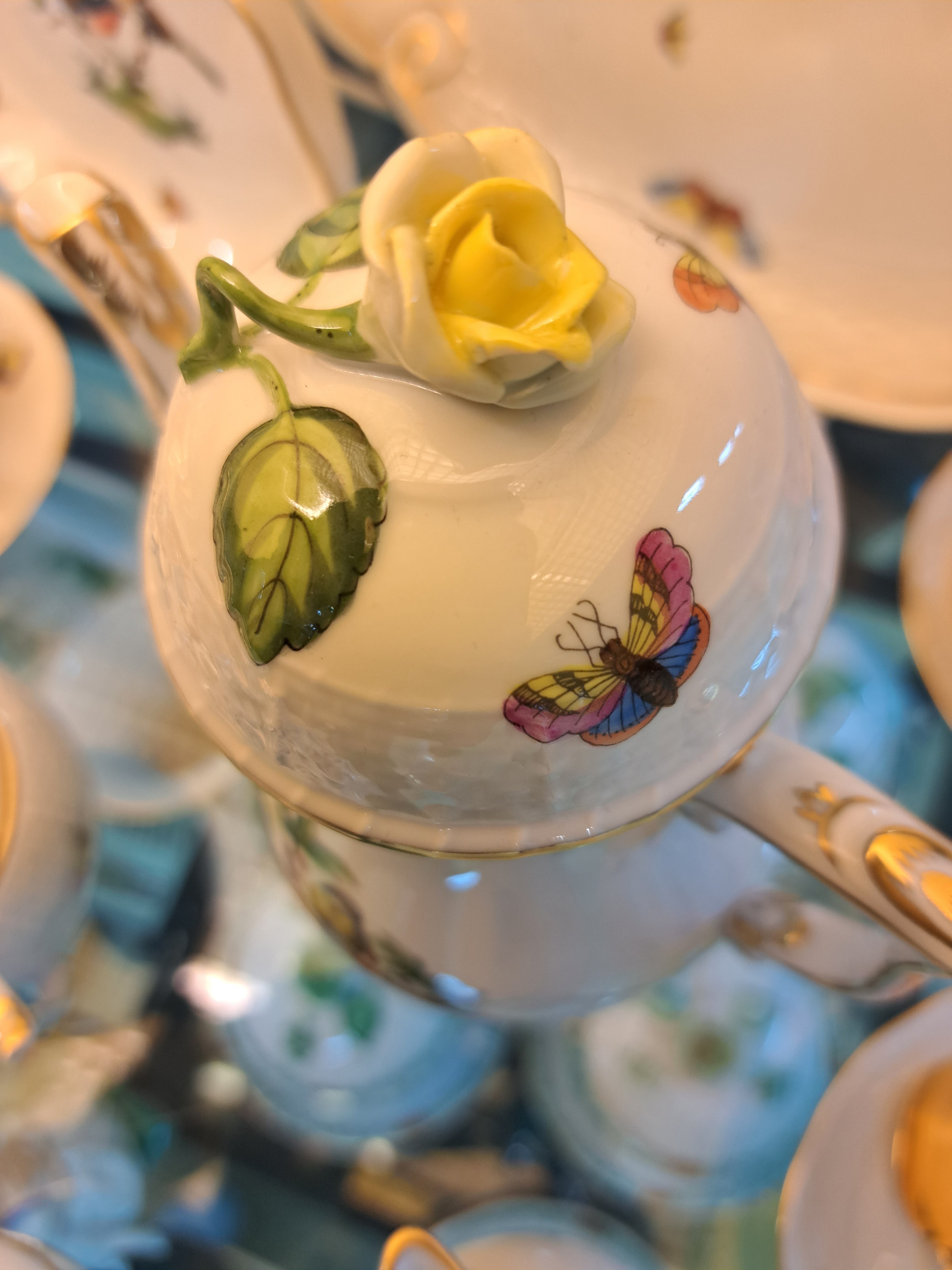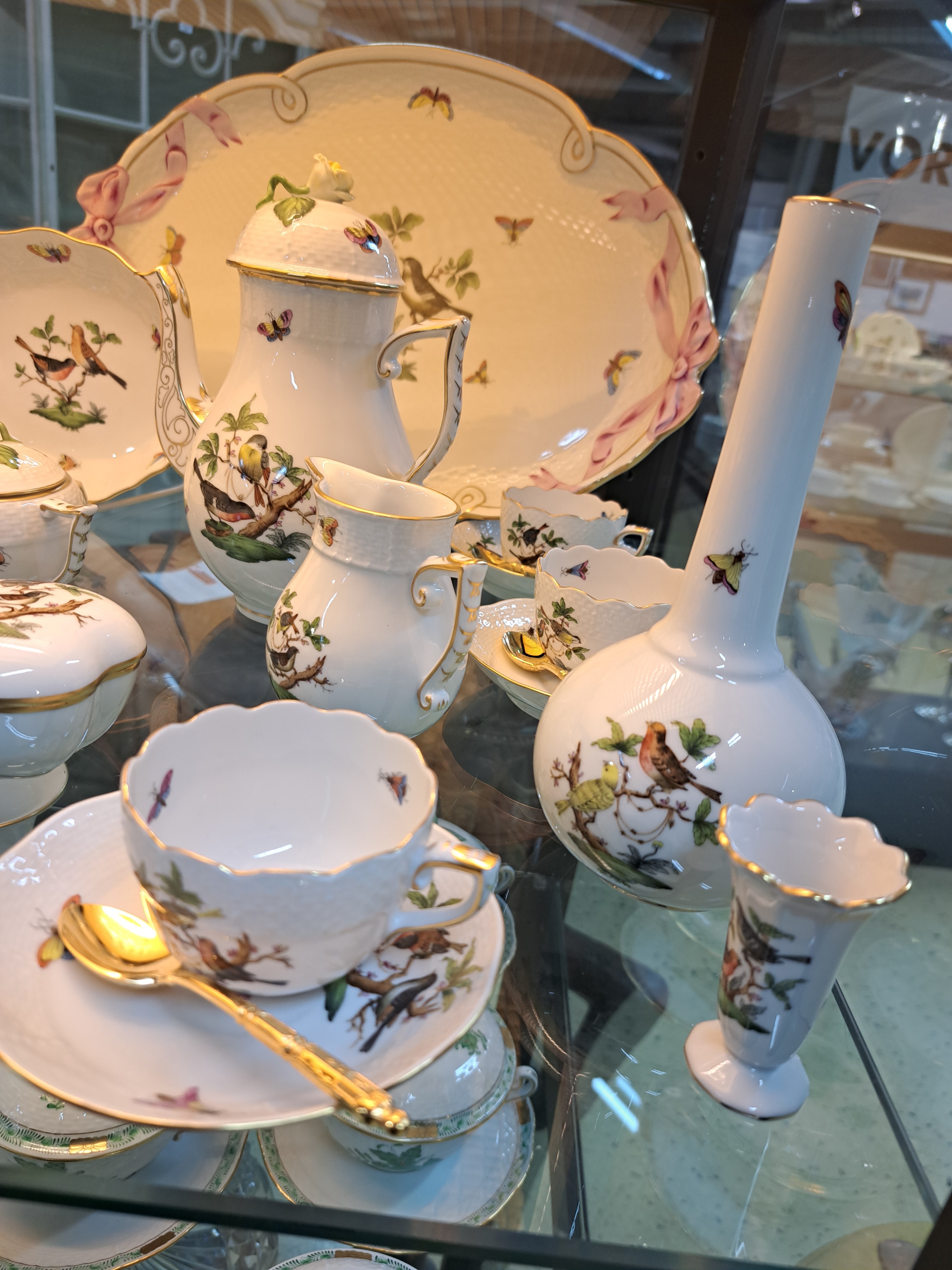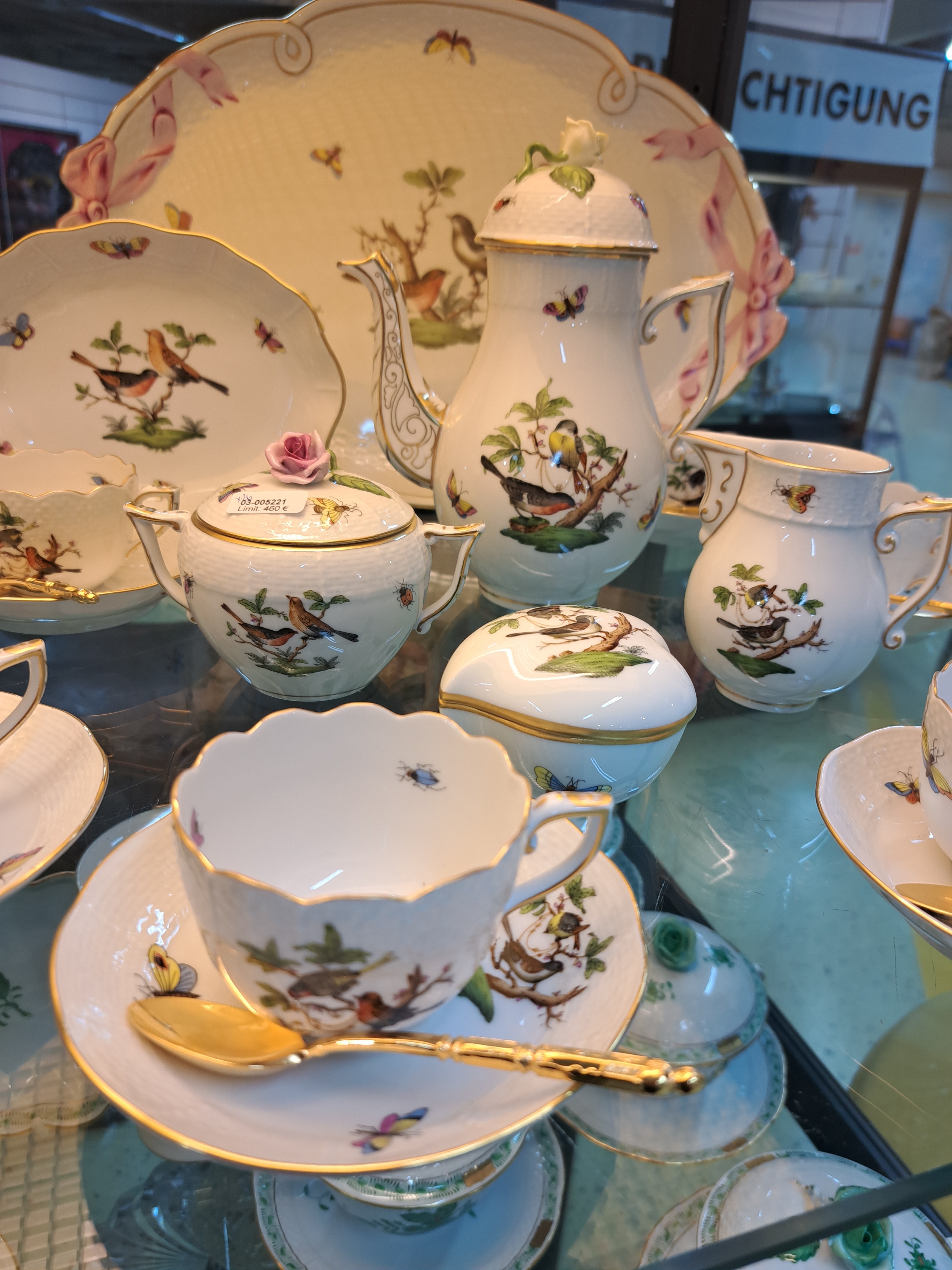Mokkaservice, Herend, um 1970/80, Porzellan, für 6 Personen, polychrom bemalt, Goldstaffage, Dekor Rothschild Oiseaux, 6 Tassen mit UT, großes ovales Tablett 41x28 cm, Mokkakanne, Sahnegießer, Zuckerdose, kl. Deckeldose, gr. u. kl. Vase, ovale Schale, Alterssp.