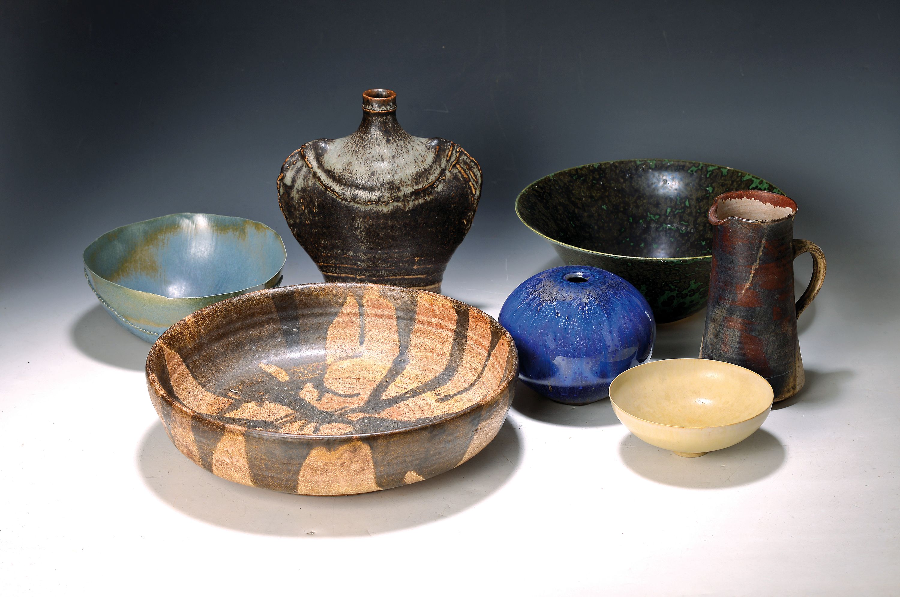 Konvolut Künstlerkeramik, deutsch, 1960-80er-Jahre, Steinzeug, Flügelvase mit grau-brauner