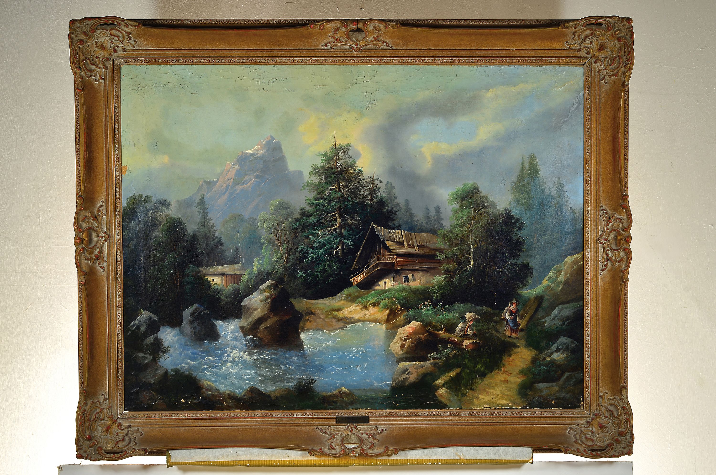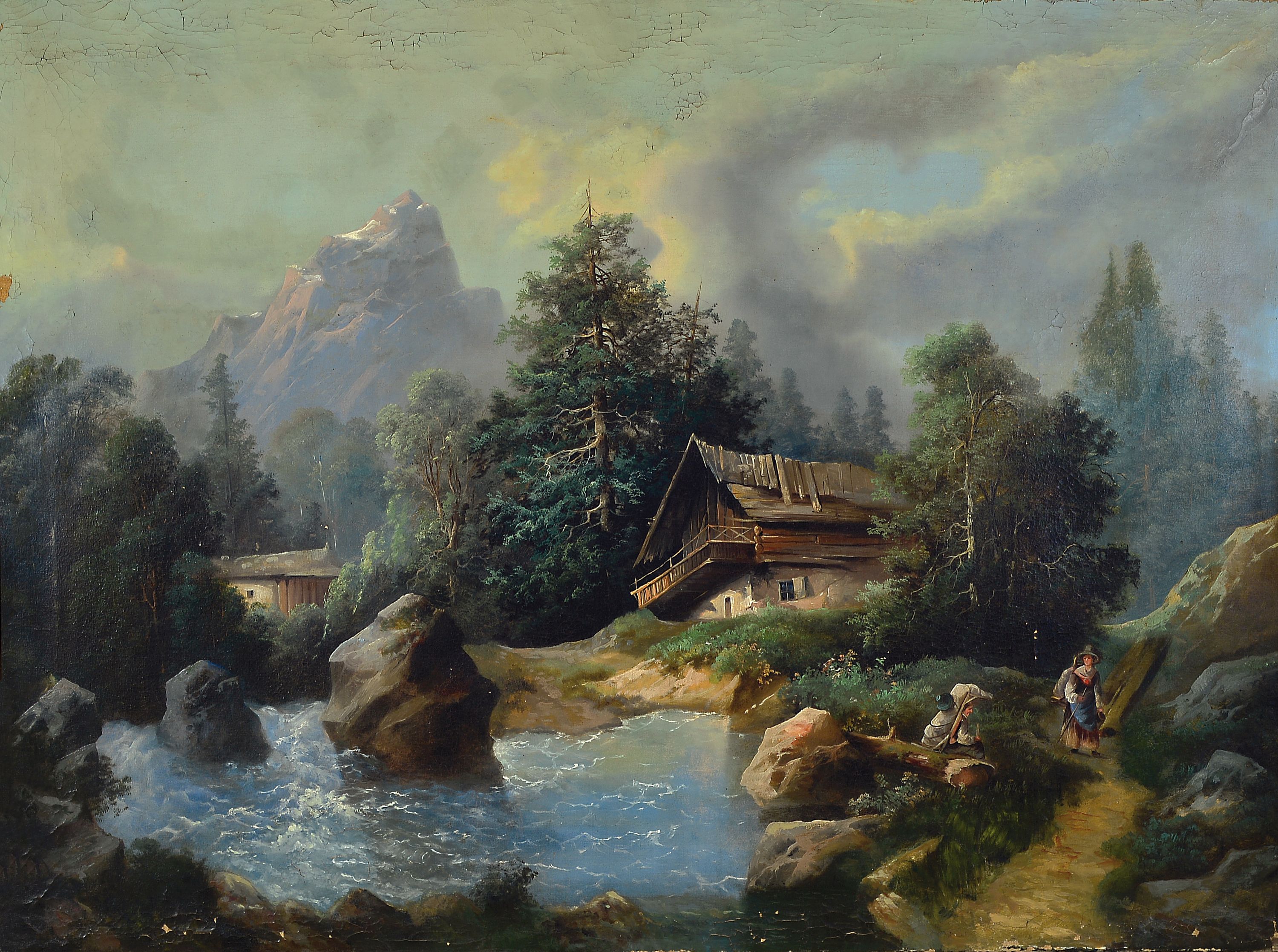 mit Gebirgsbach und Hütte, Figurenstaffage zweier Wanderer, unsigniert, Öl/Lwd,
