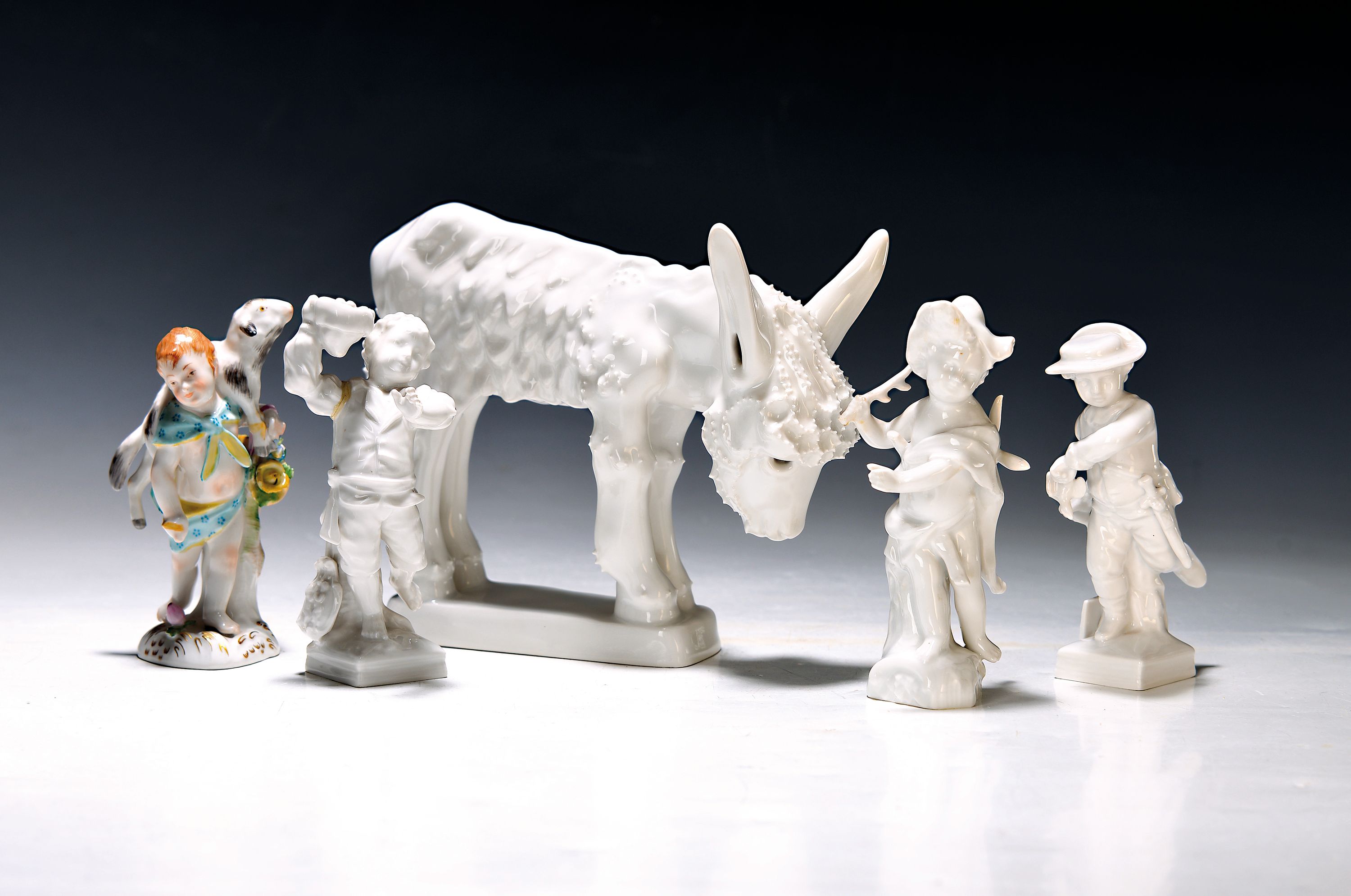 Fünf Porzellanfiguren, KPM Berlin, 20. Jh., Esel und vier allegorische Darstellungen,