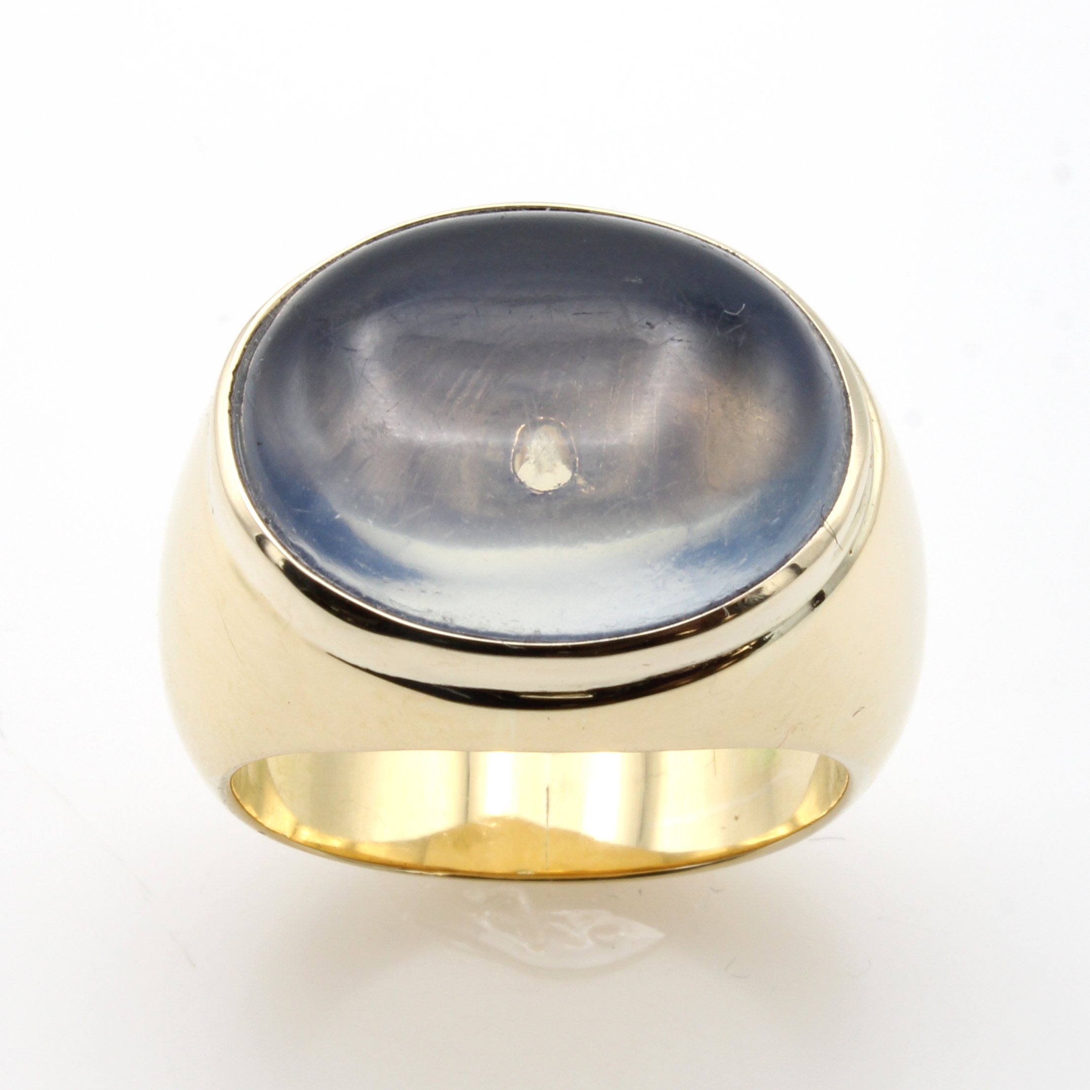 Ring mit Mondstein, GG 750/000, Mondstein- cabochon in Blau und Gold changierend, RW ca. 50 Schätzpreis: 2200, - EUR