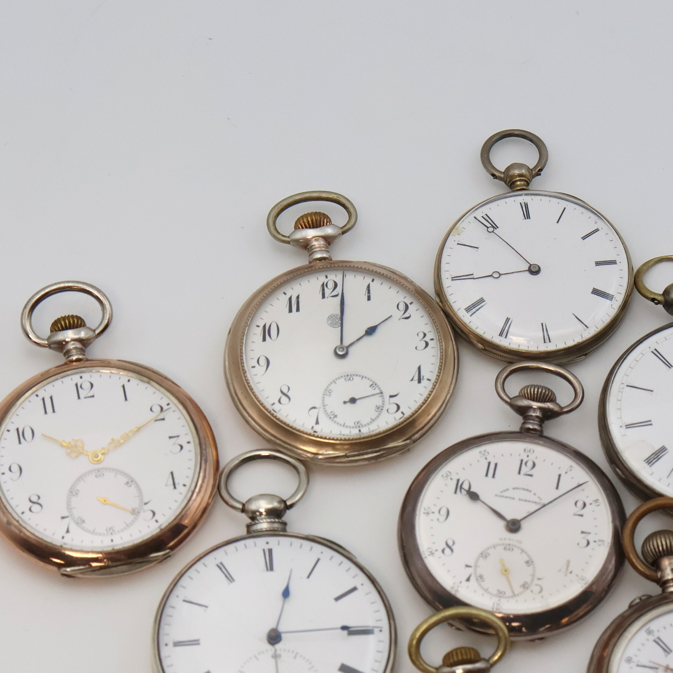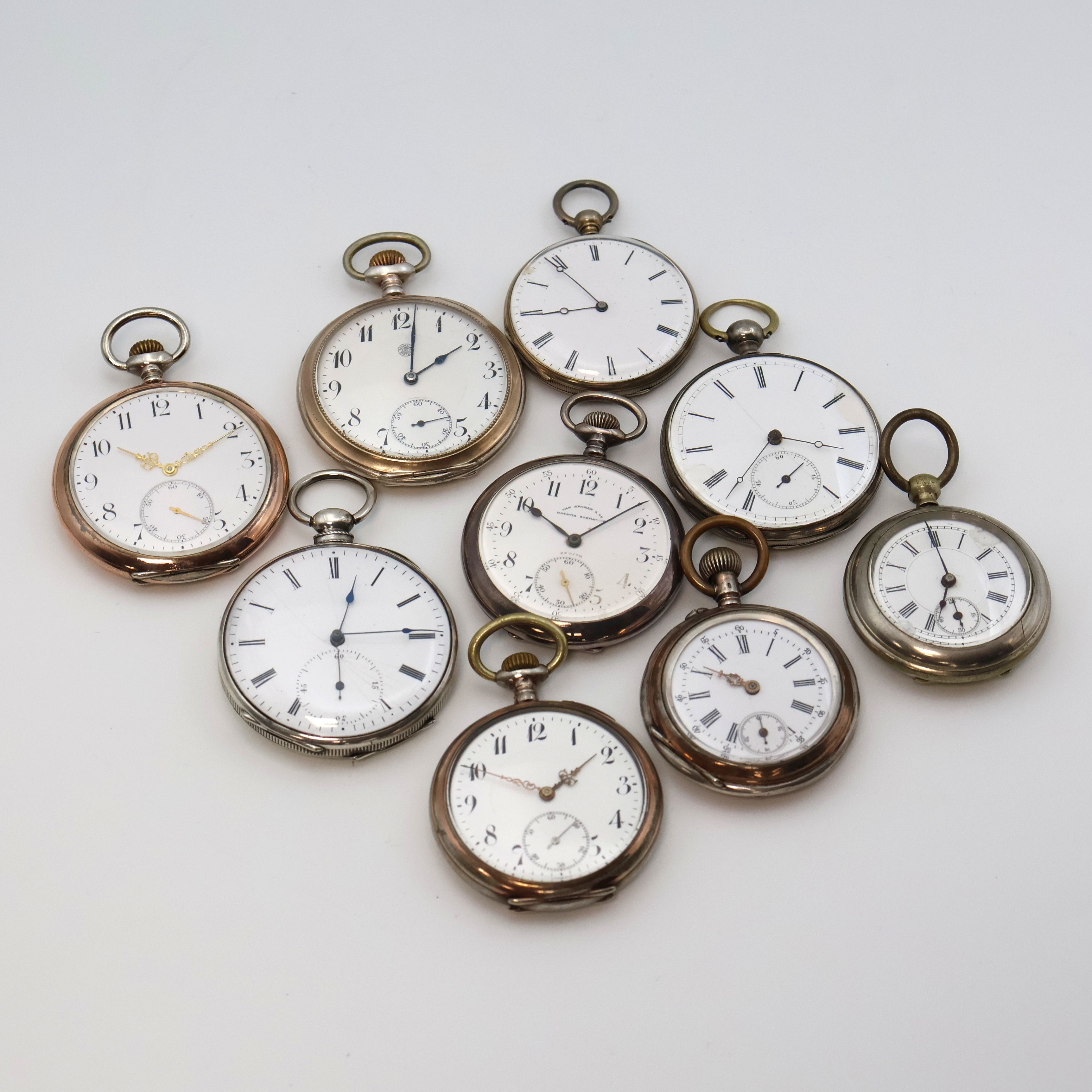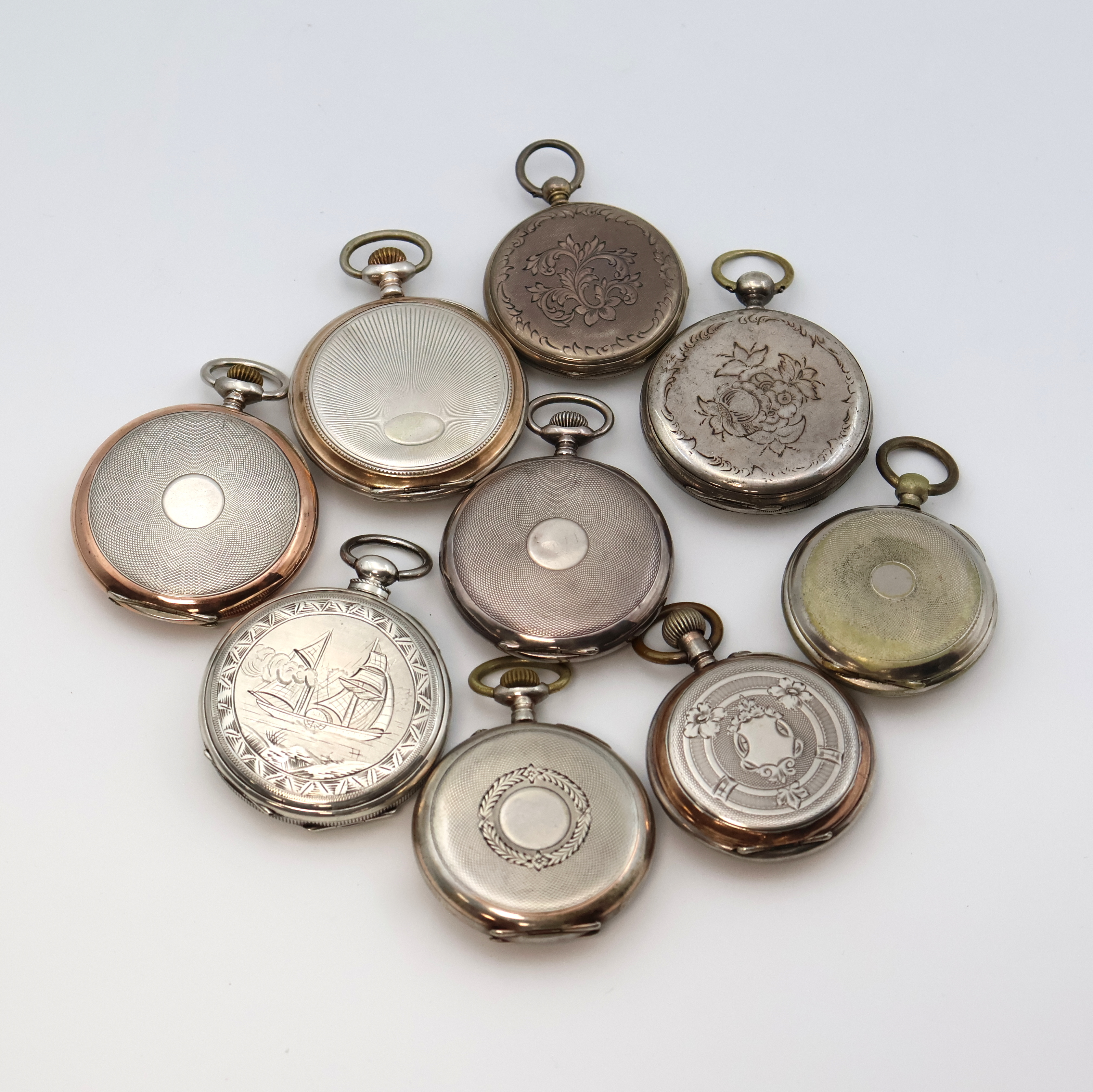 Konvolut: 9 offene Taschenuhren, Schweiz um 1860-1920, 8 teils schön grav. Geh.