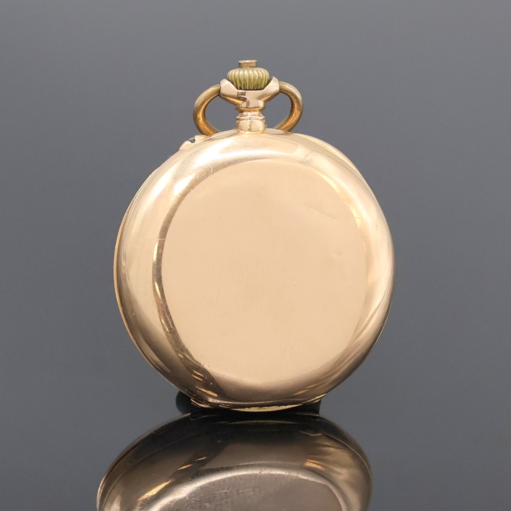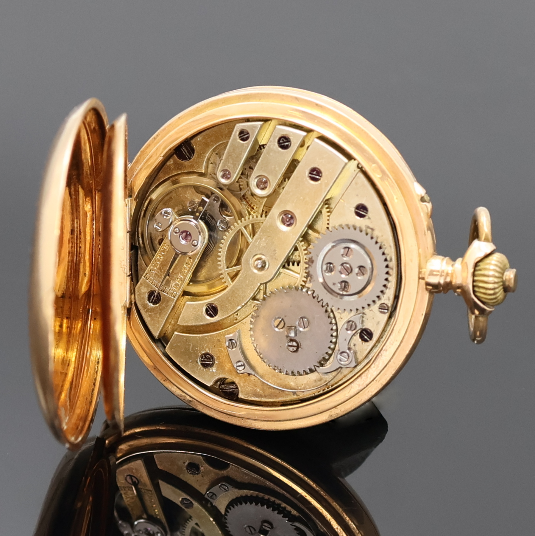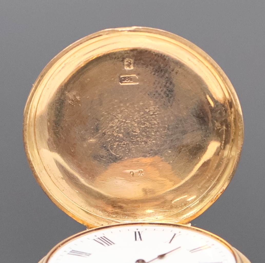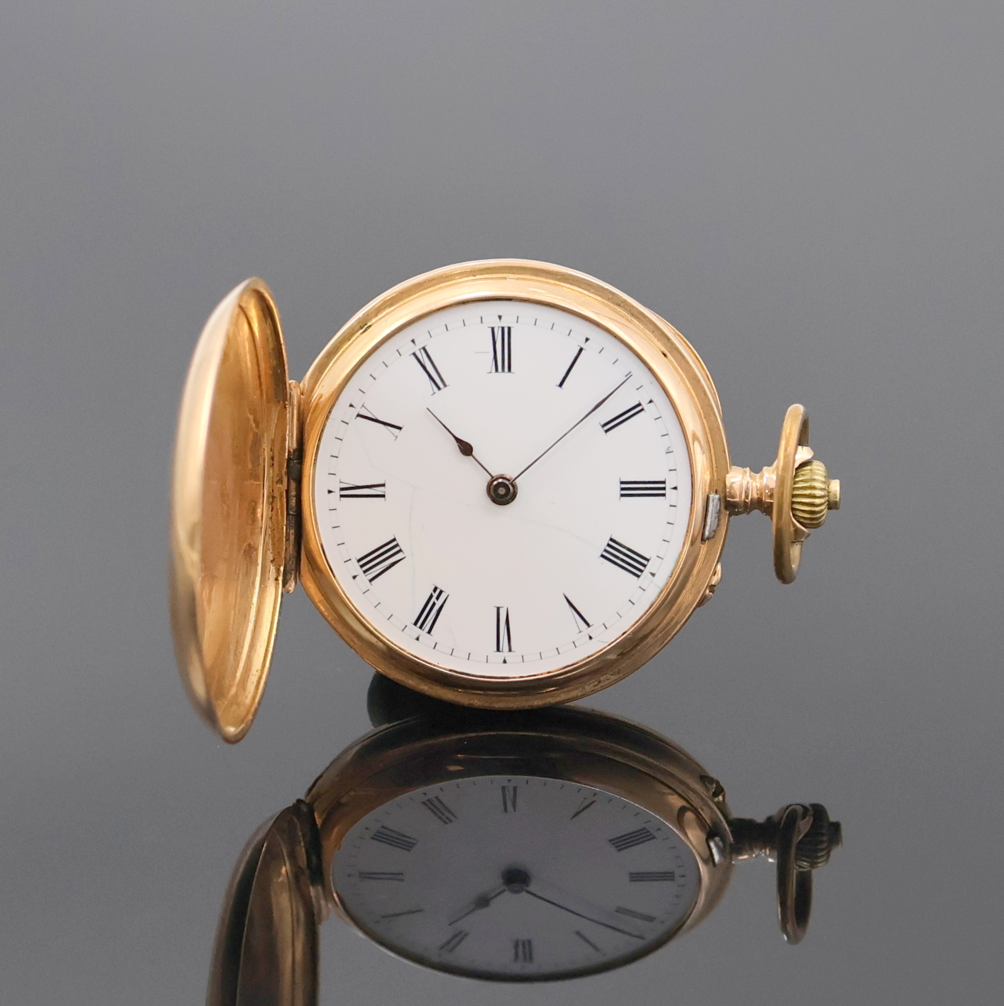 um 1880, glattes 3-Deckel Goldgeh. dell., Emailzifferbl. riss., röm. Zahlen, gebl.