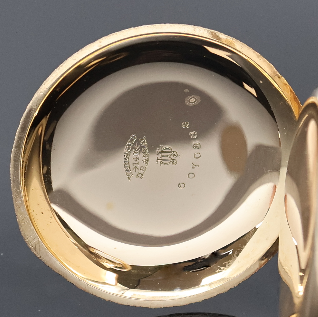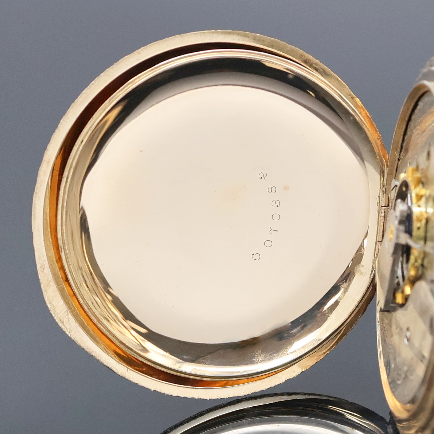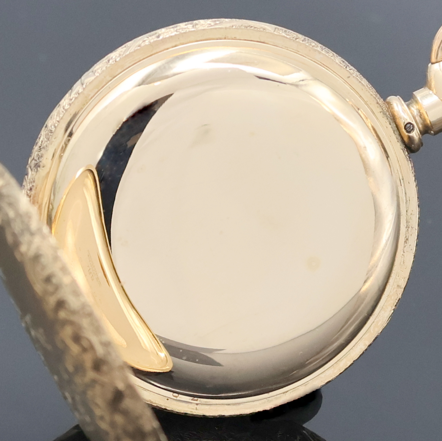 Sprung- u. Rückdeckel m. Monogrammspiegel, Emailzifferbl. m. arab. Zahlen, gebl.