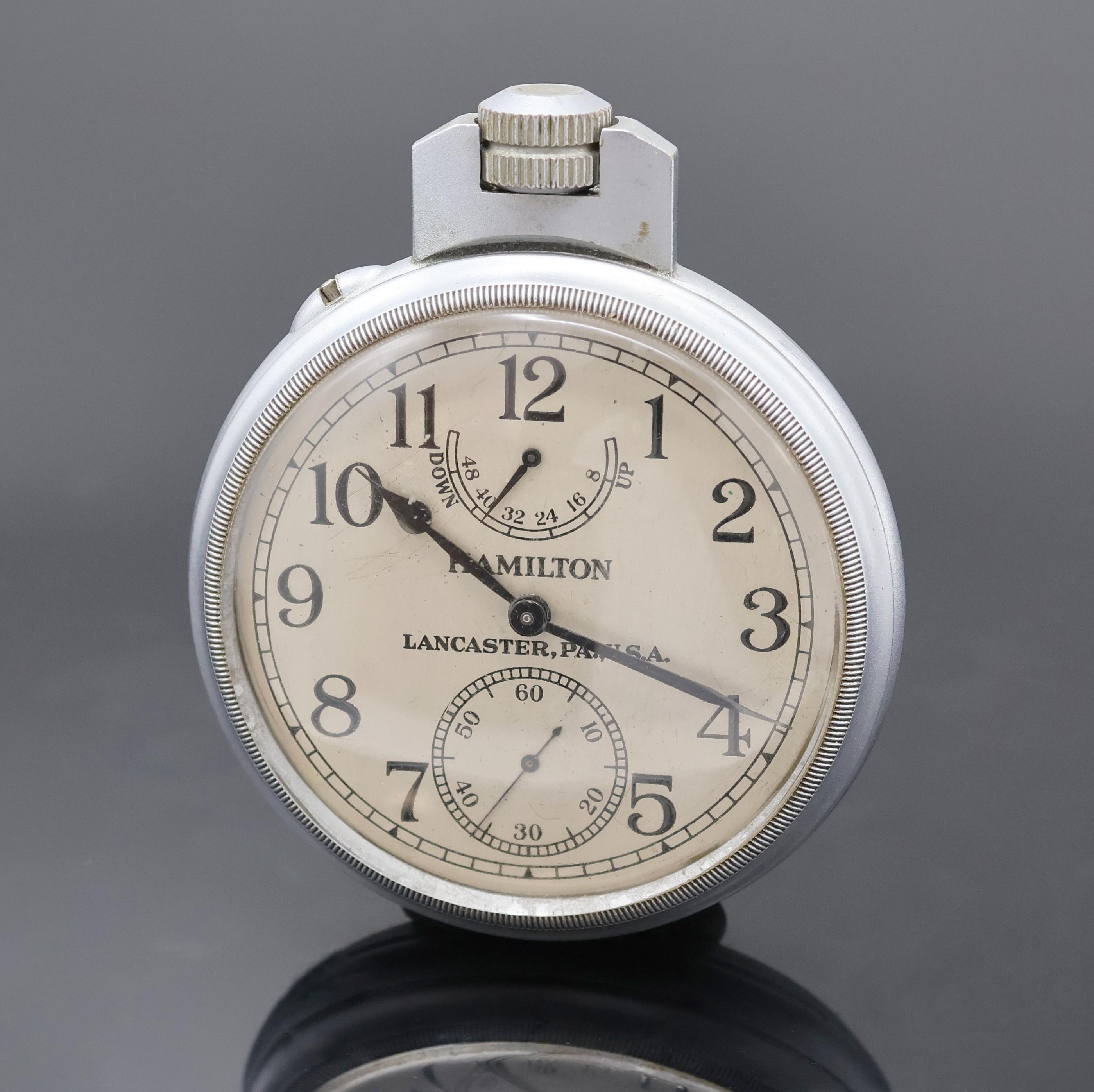 Boden verschr., silb. Zifferbl. m. arab. Zahlen, schwarze Birnenzeiger, Gangreserveanzeige