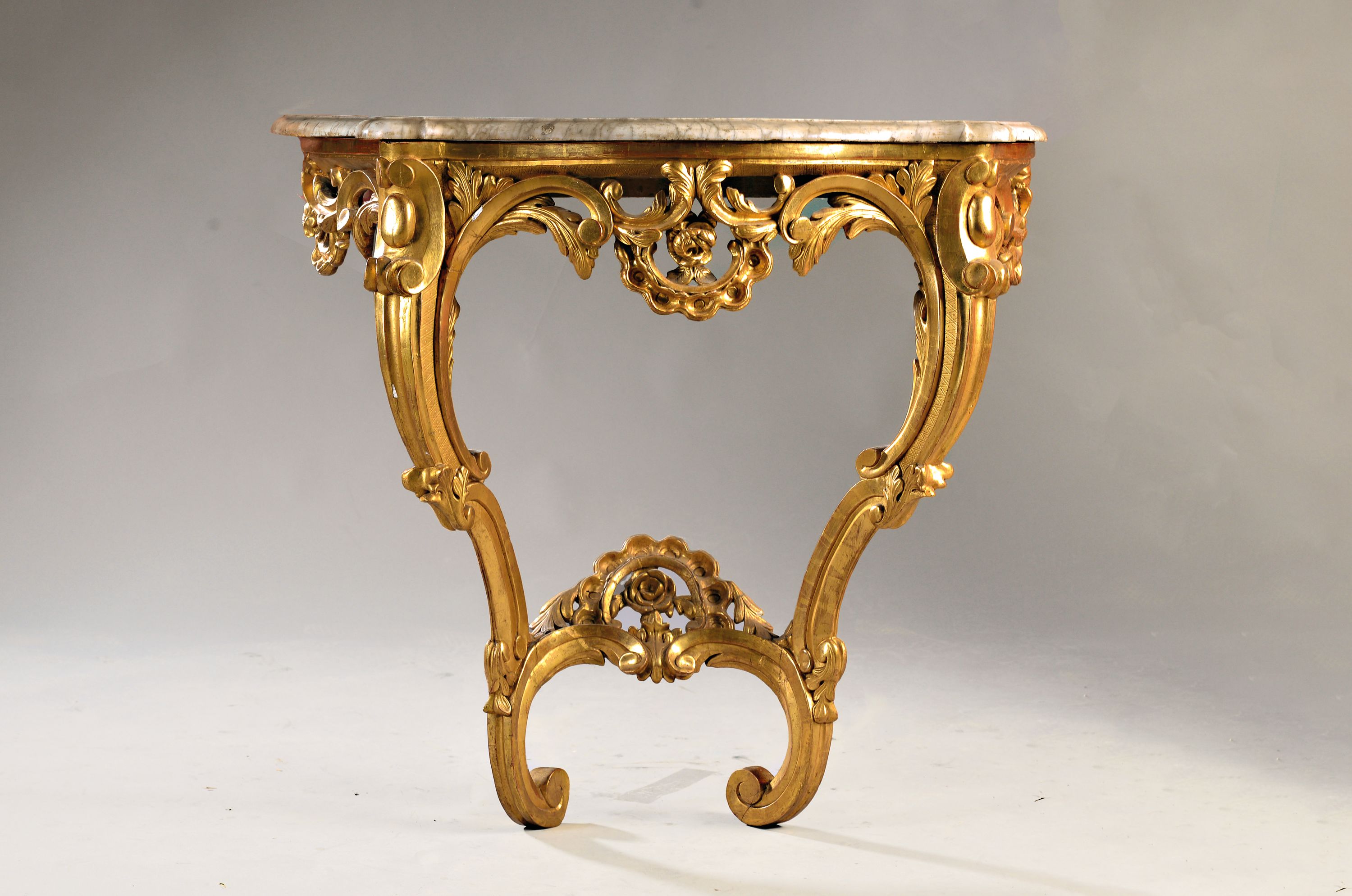 Wandkonsole, Barock, 18.Jh., mit Marmorplatte, Holz in gold gefaßt und aufwendig
