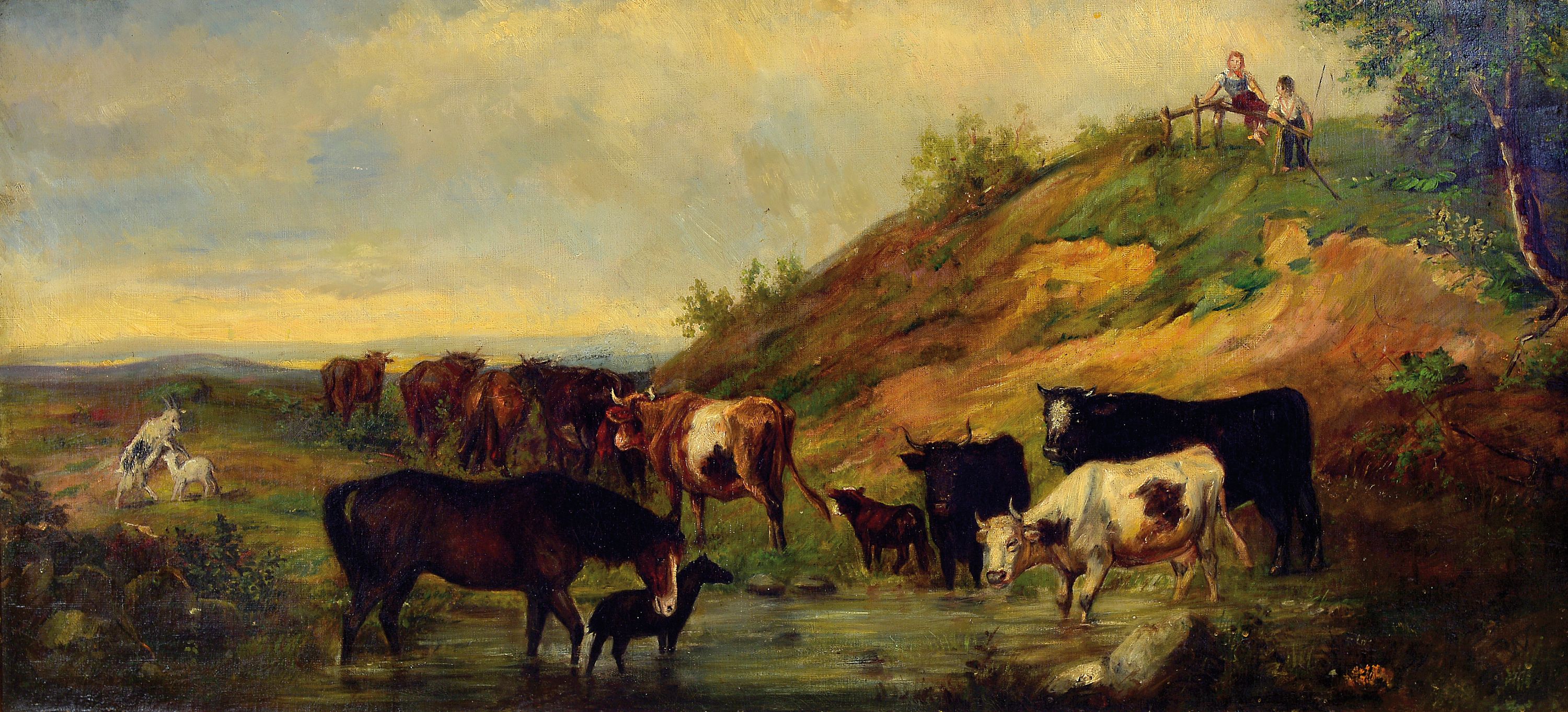 Monogrammist PW, datiert (19)82, Kühe, Pferd und Ziegen an der Tränke, oben die beiden Hütejungen, Öl/Lwd, rechts unten monogr. und dat., rest., ca. 53x117cm, R. ca. 62x126cm