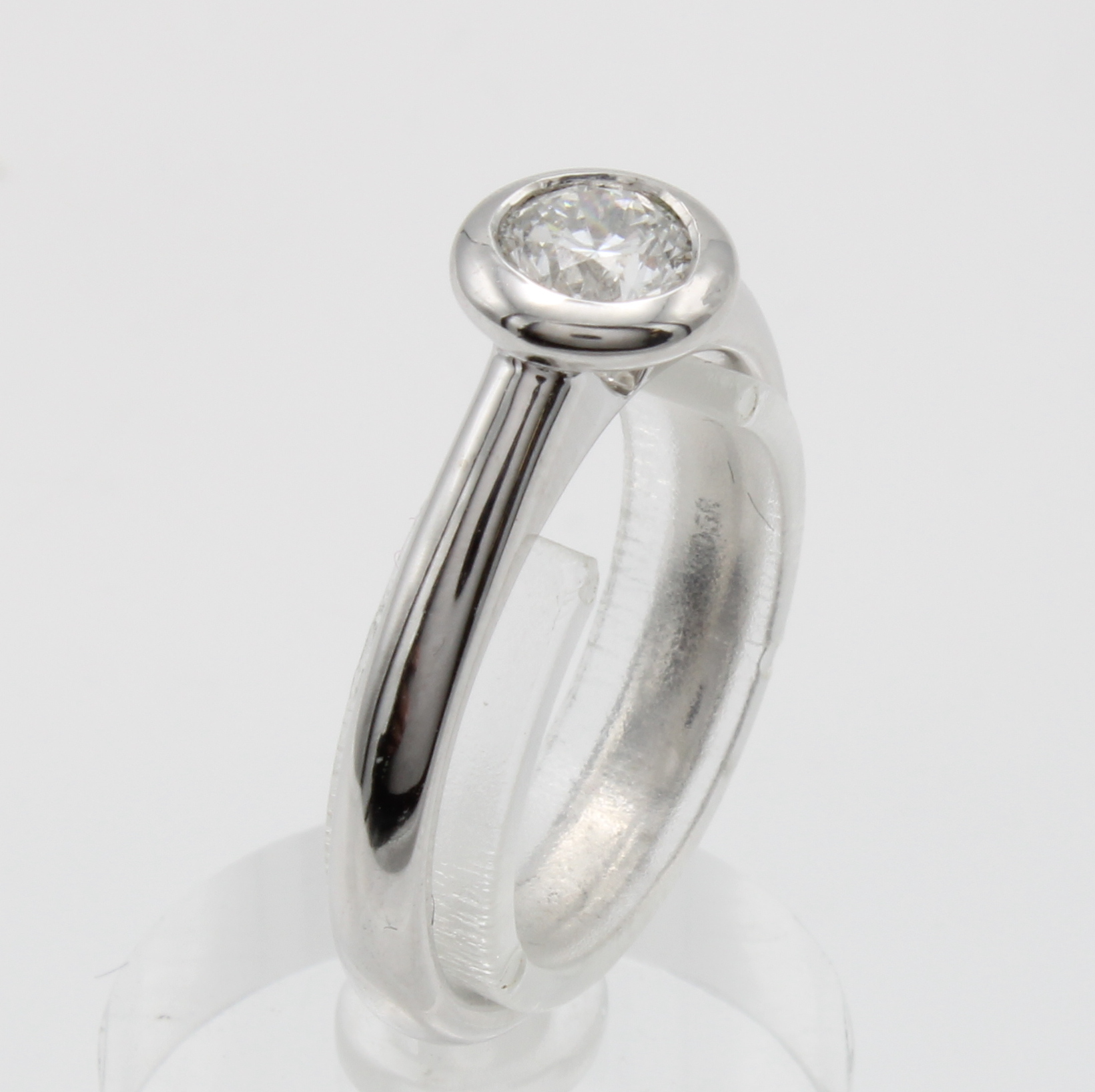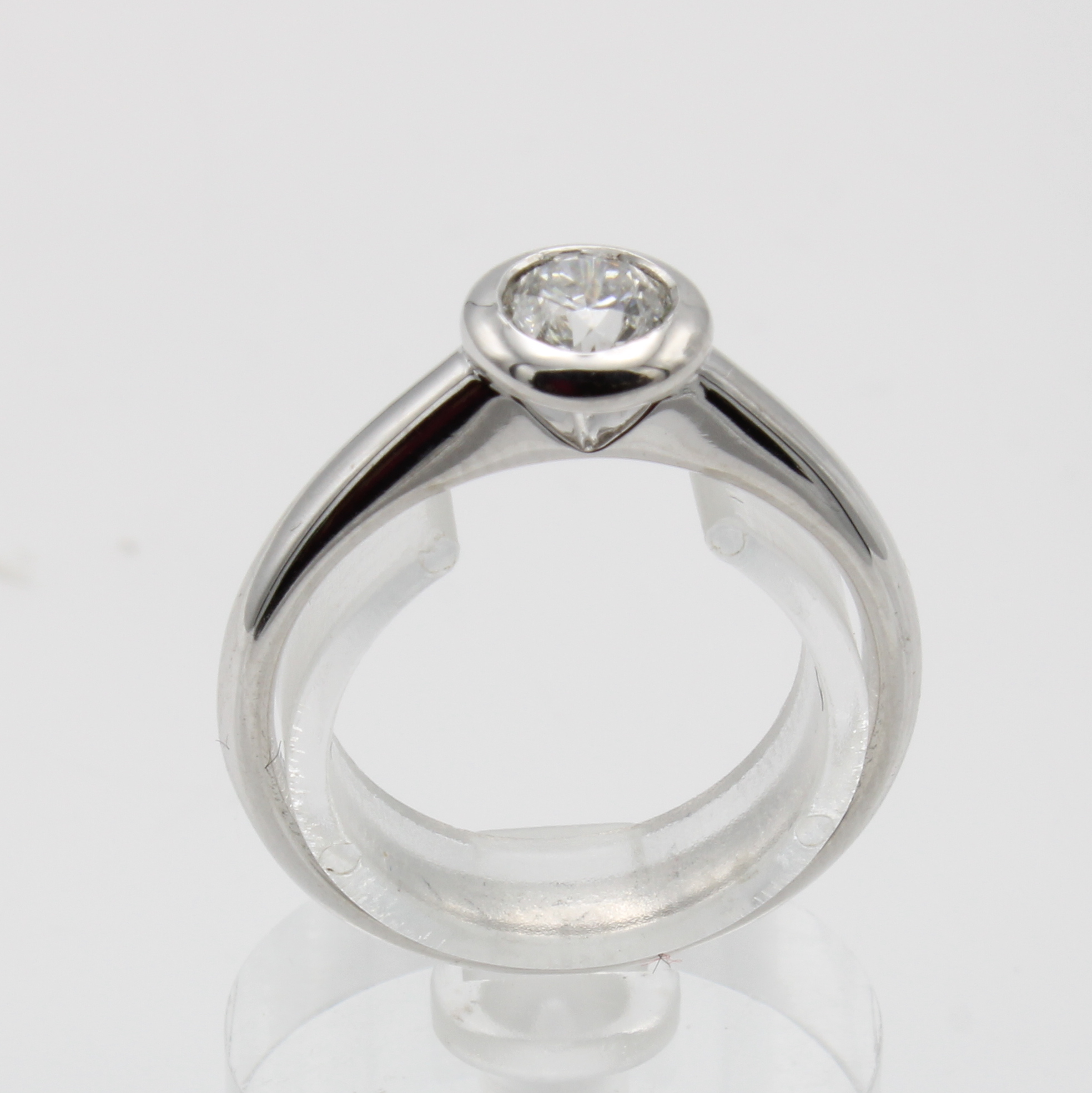 Ring mit Brillantsolitär, WG 750/000, Brill.0.50 ct feines Weiß/si, in Zargenfassung, RW ca. 54, Expertise liegt vor Schätzpreis: 3500, - EUR