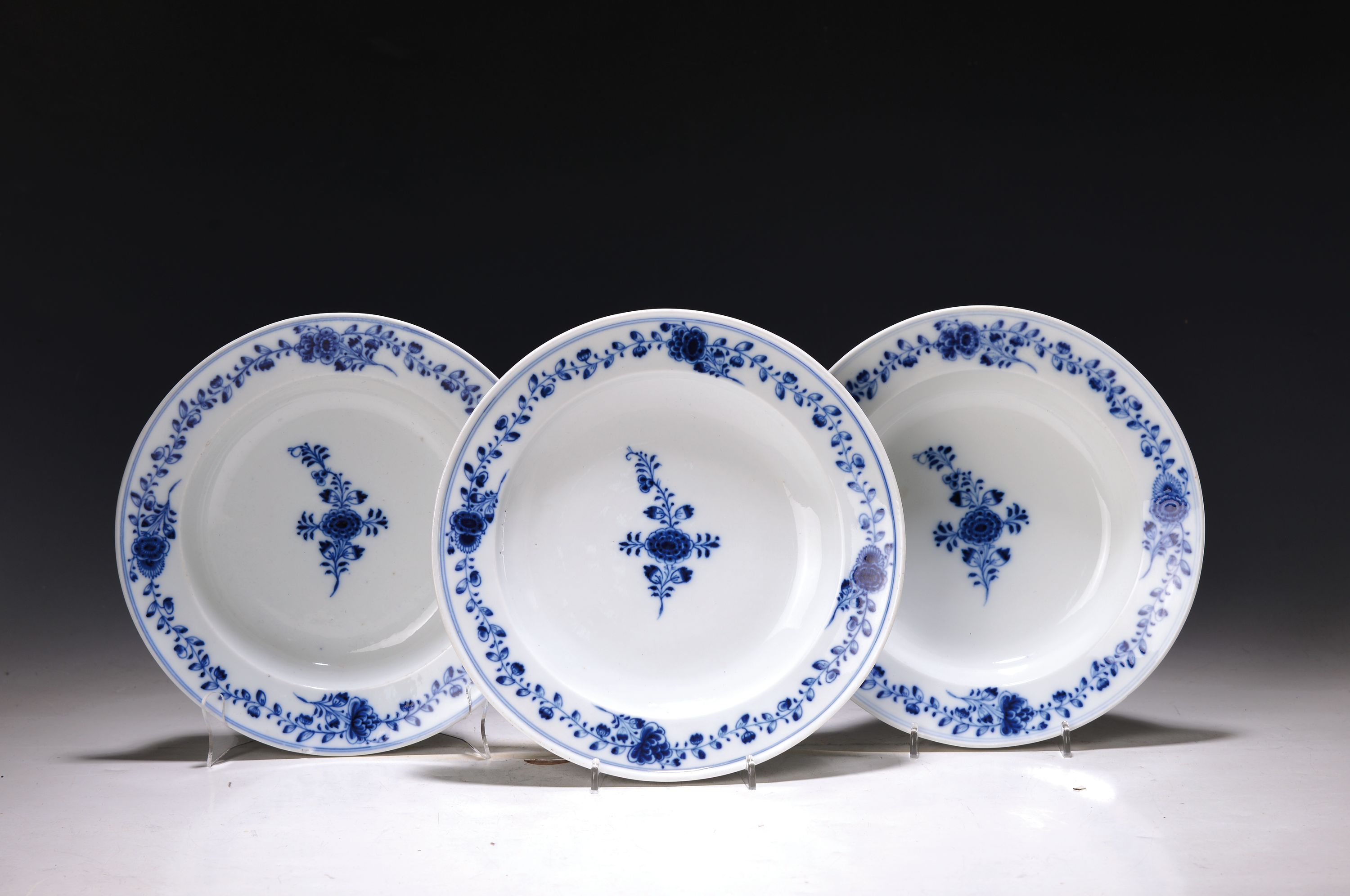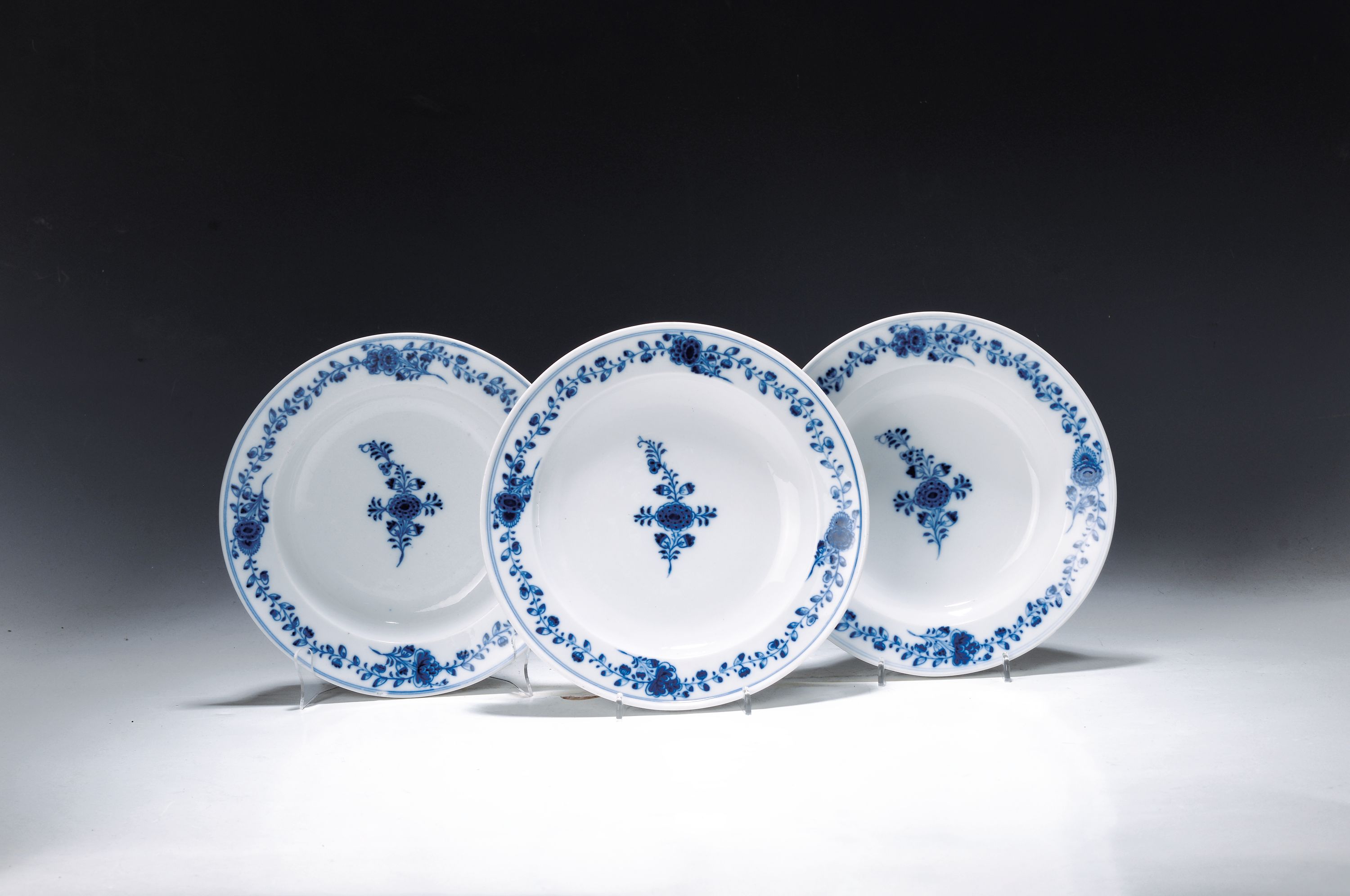 Drei Teller, Meissen, Marcolini, 1774-1814, indianische blaue Blumen unter Glasur,