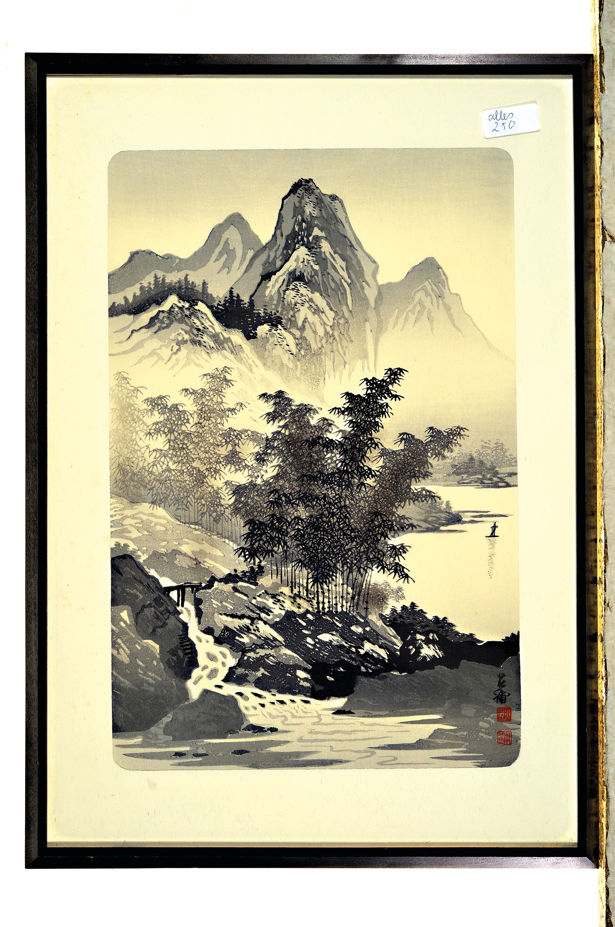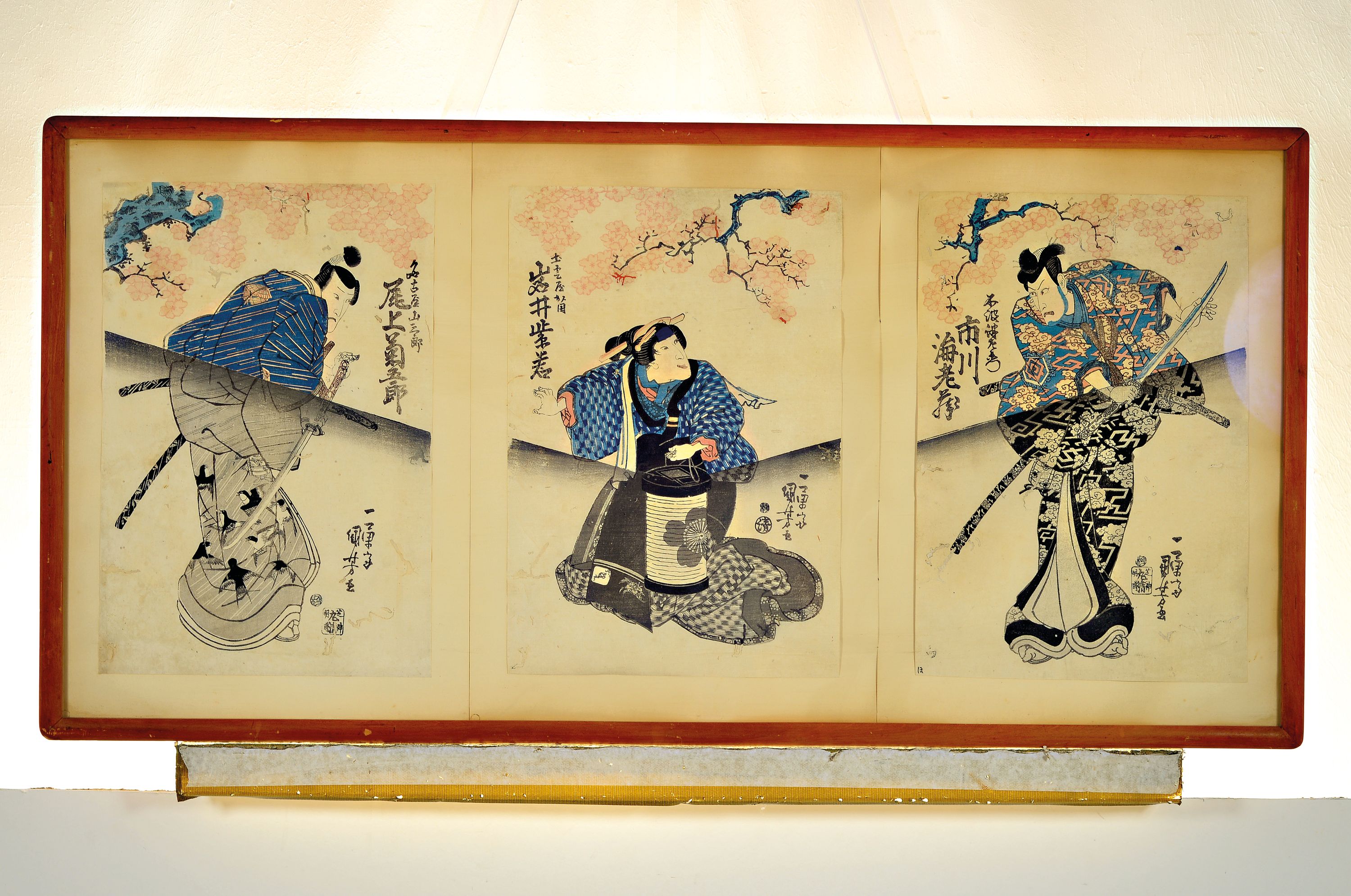 6 Holzschnitte, Japan, 19./20. Jh., Blätter teilweise mit Wurmfraß und Altersspuren,