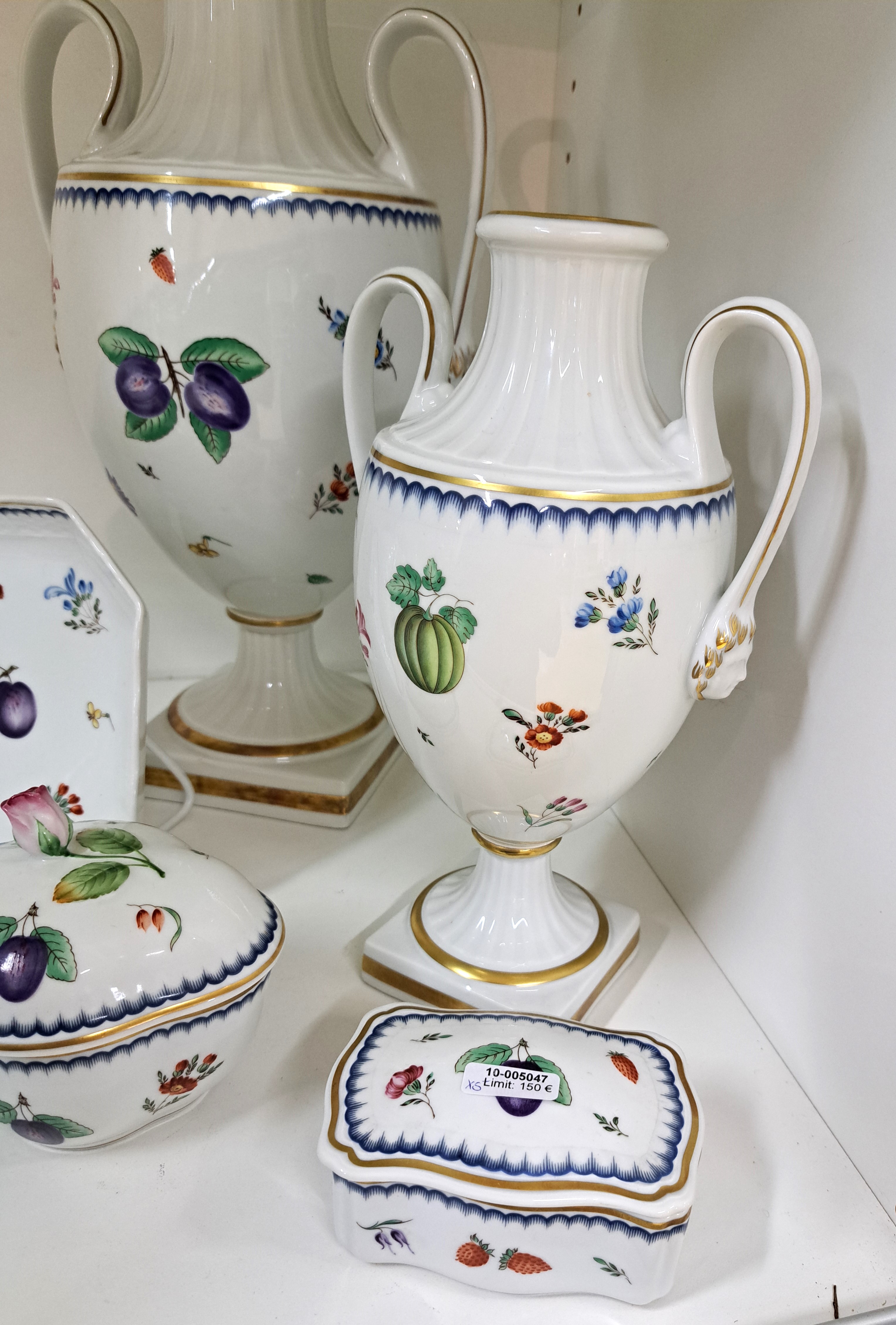 Hälfte 20. Jh., Blumen und Obstdekor, Goldränder, Vasen H. 26/36 cm, Deckeldose