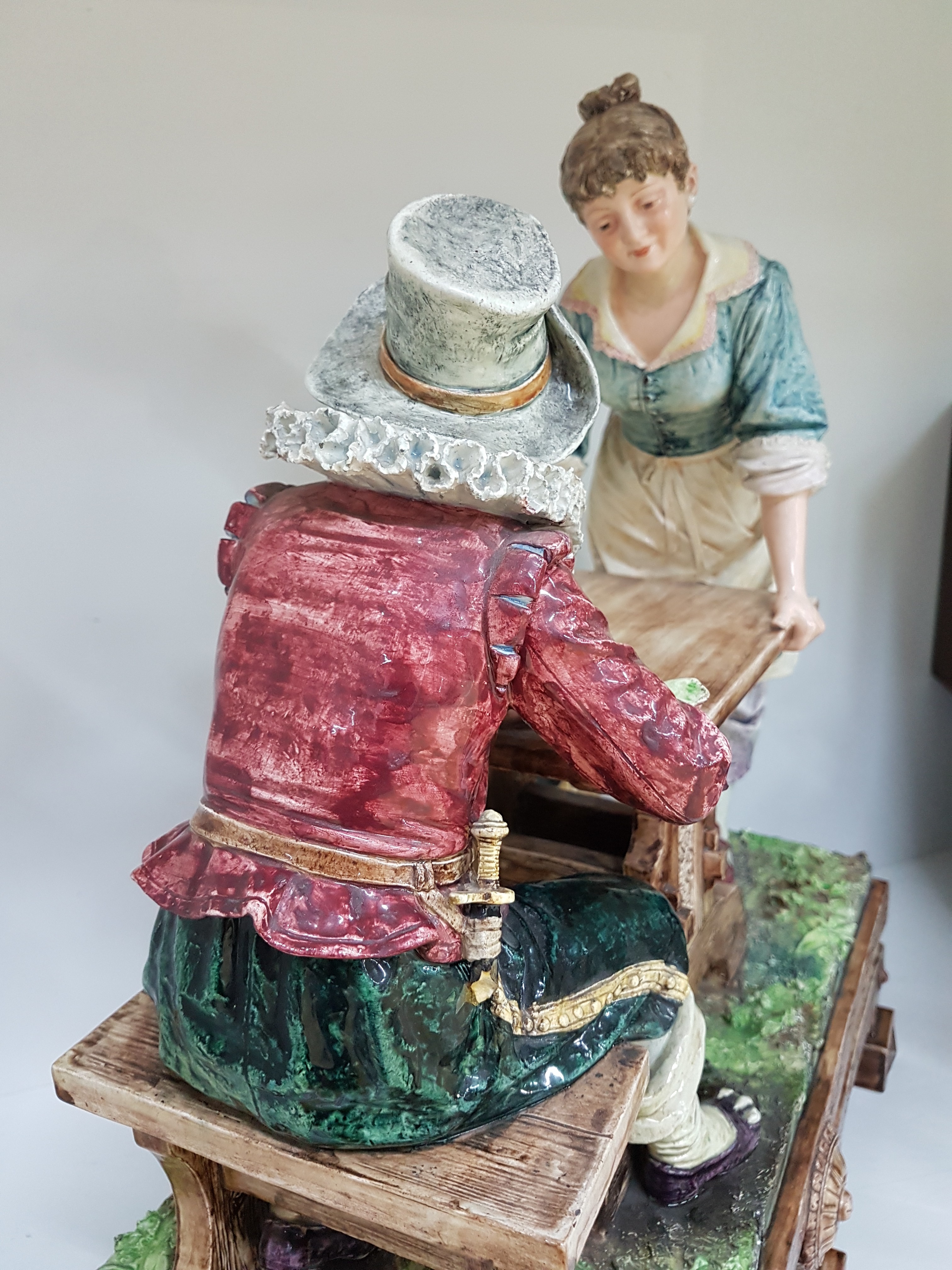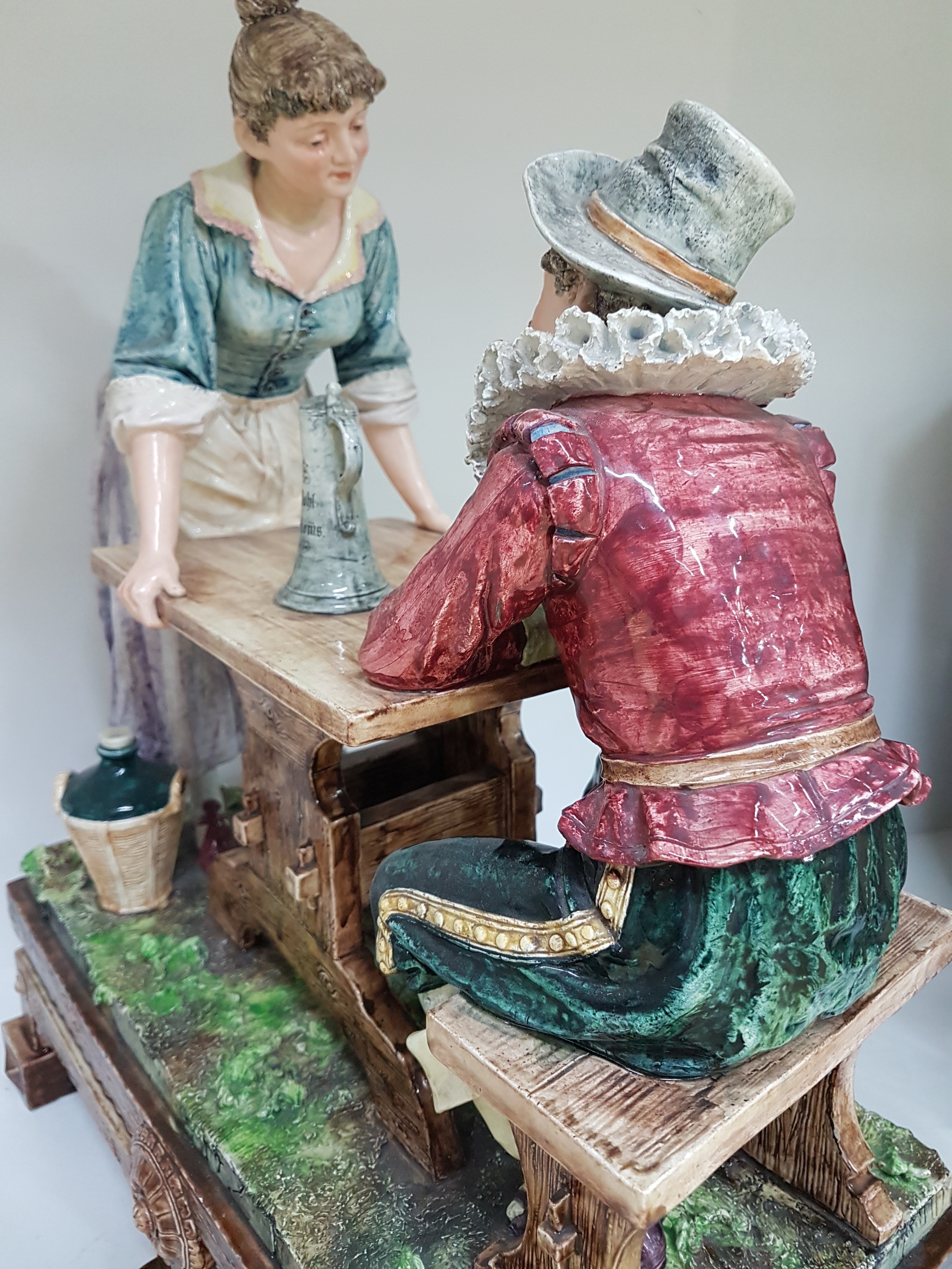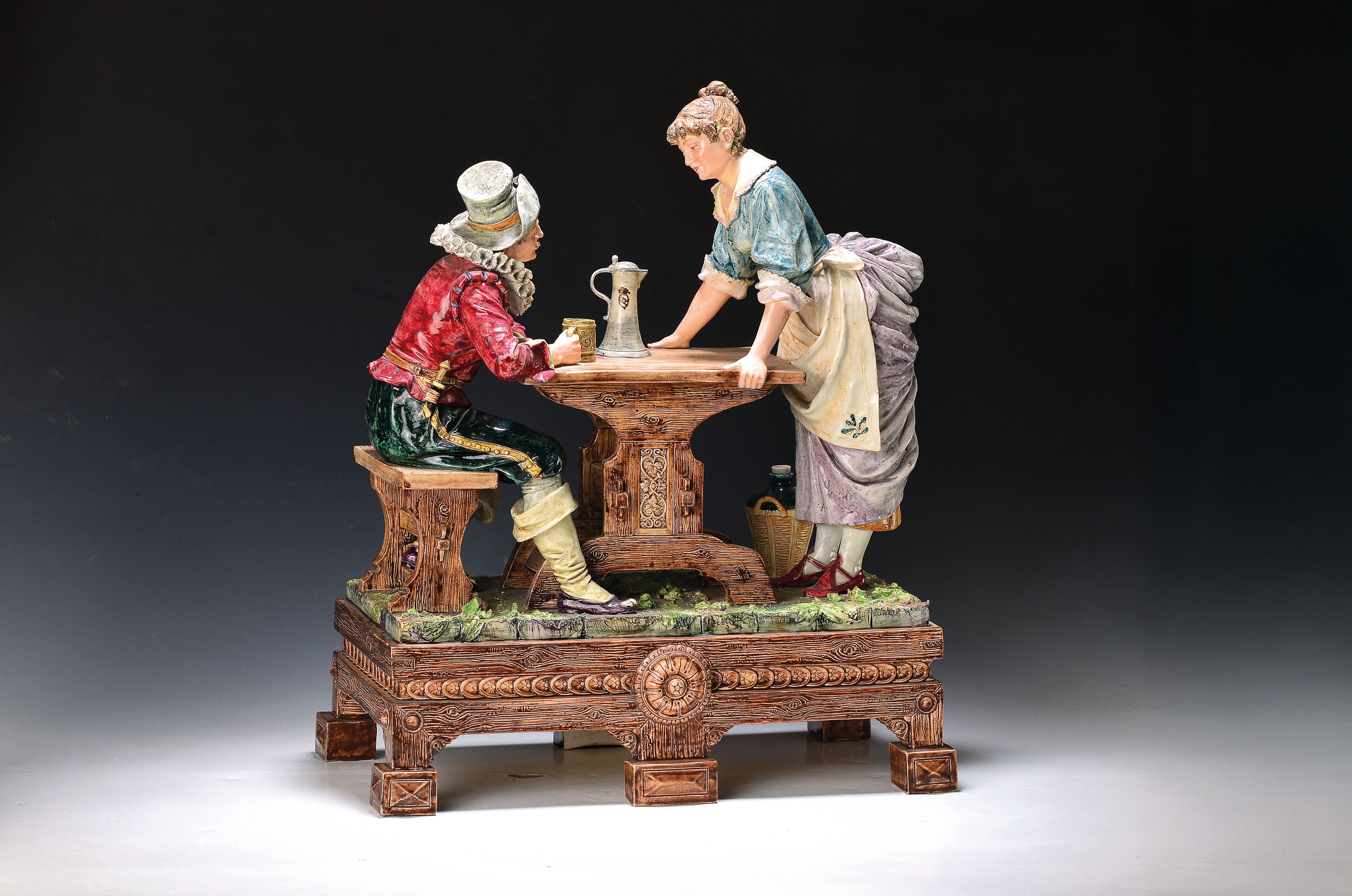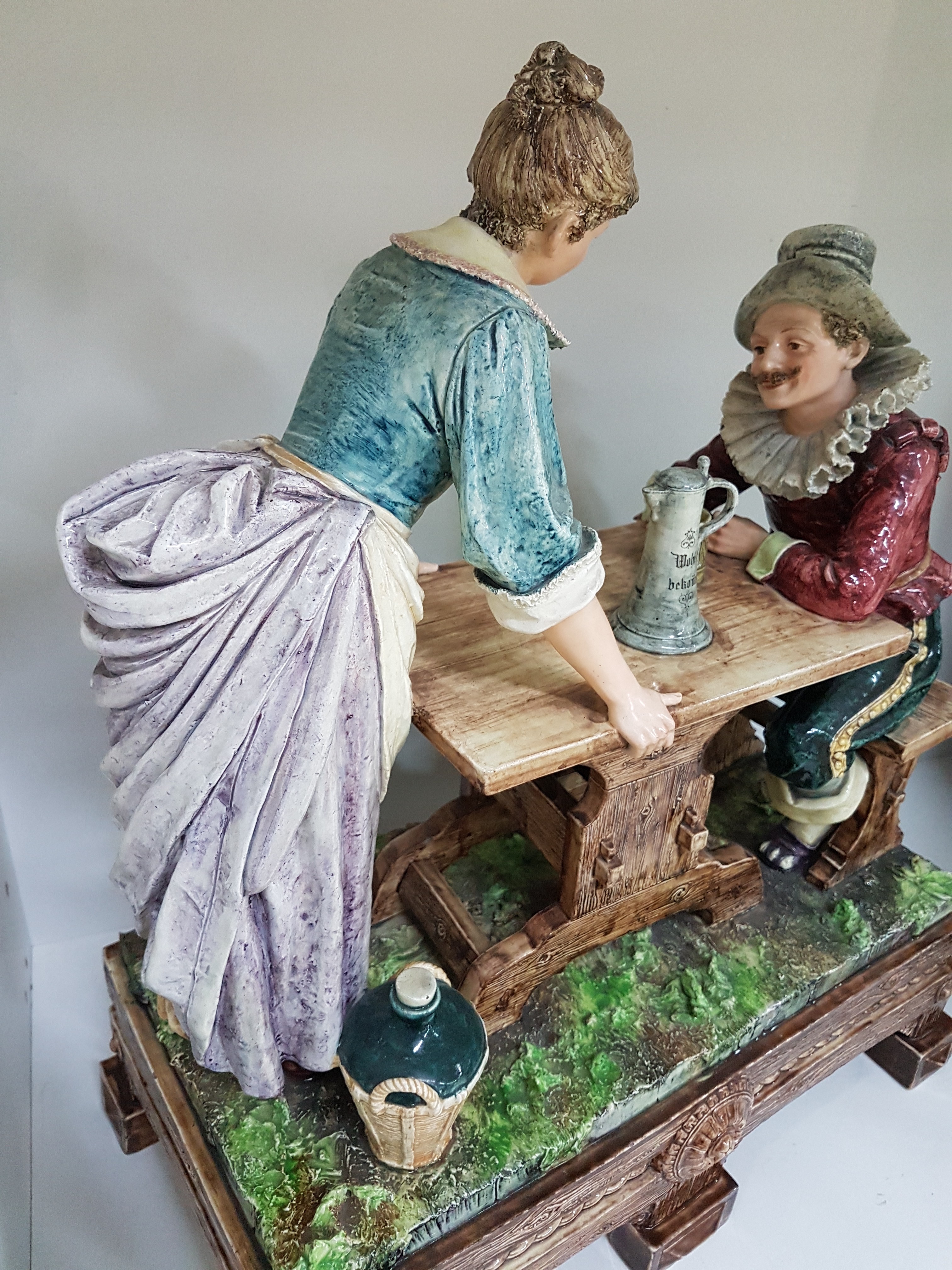 Große Keramikgruppe/Figurengruppe, wohl Wilhelm Schiller Bodenbach, um 1900, Wirtshausgruppe, vollplastische Darstellung, altersbedingt bestoßen, Unterseite mit Finger großer Bestoßung und Haarriss, ca. 54 x 45 x 23.5 cm, am Boden gemarkt gesetzlich geschützt 1227