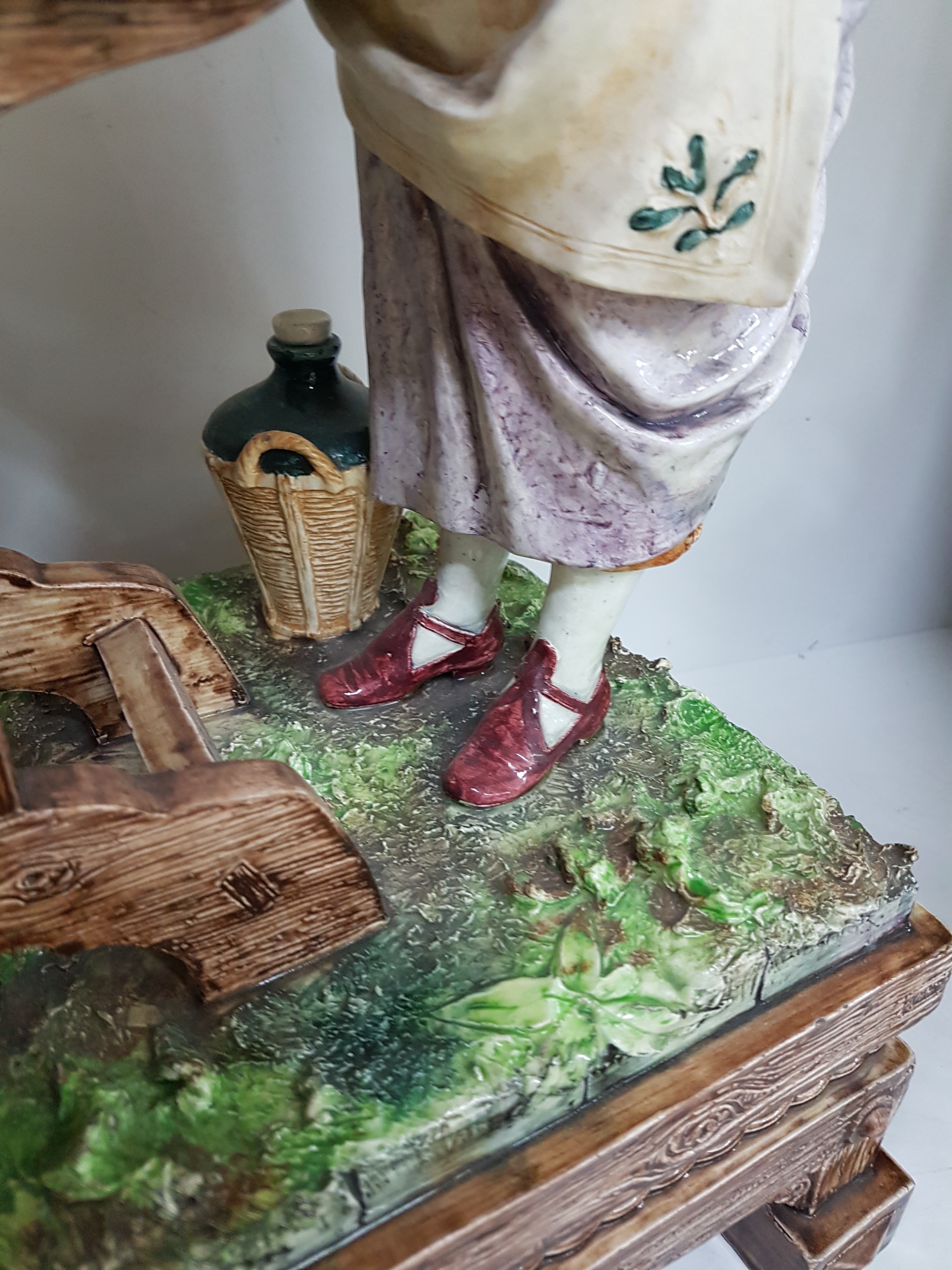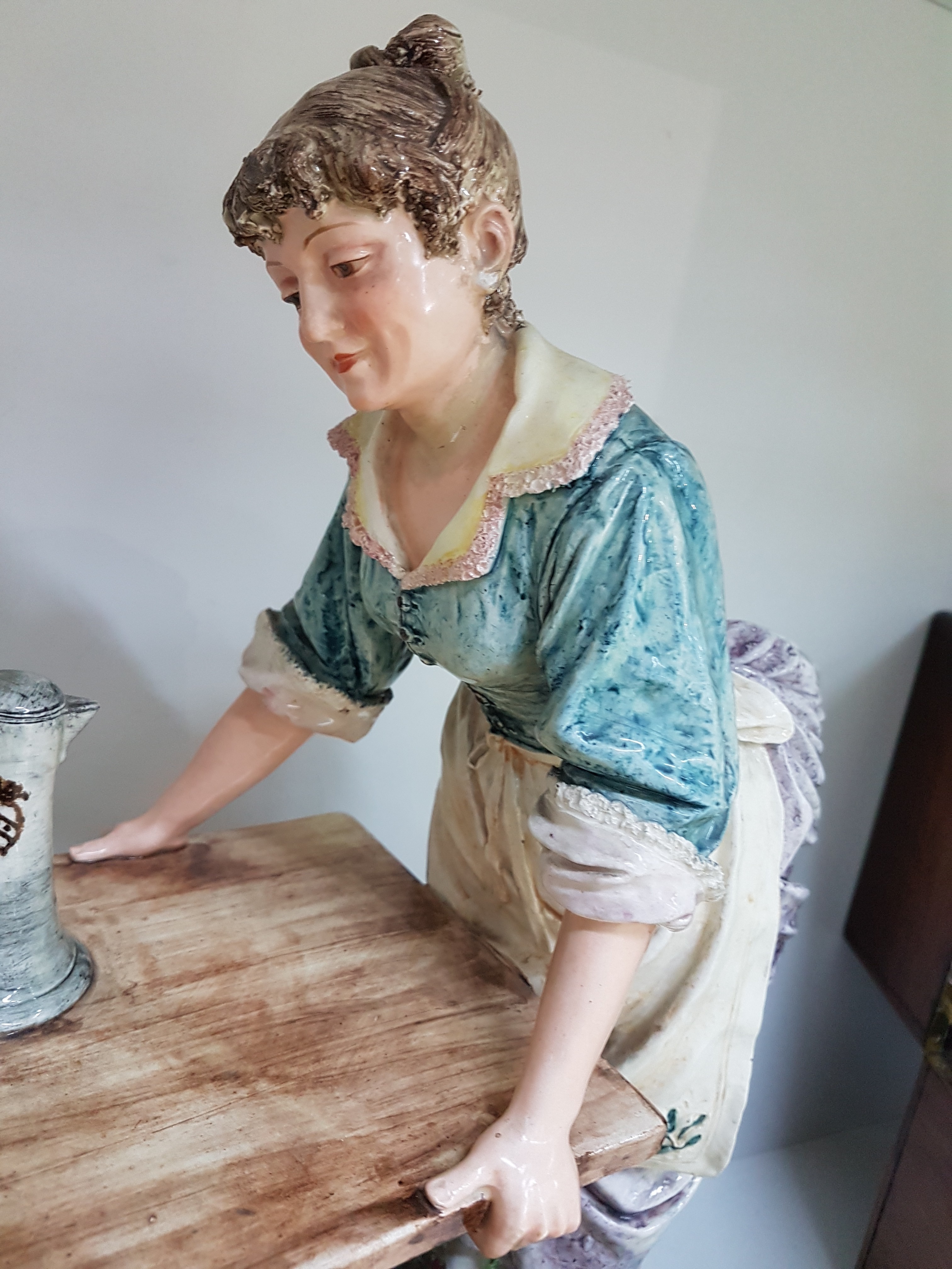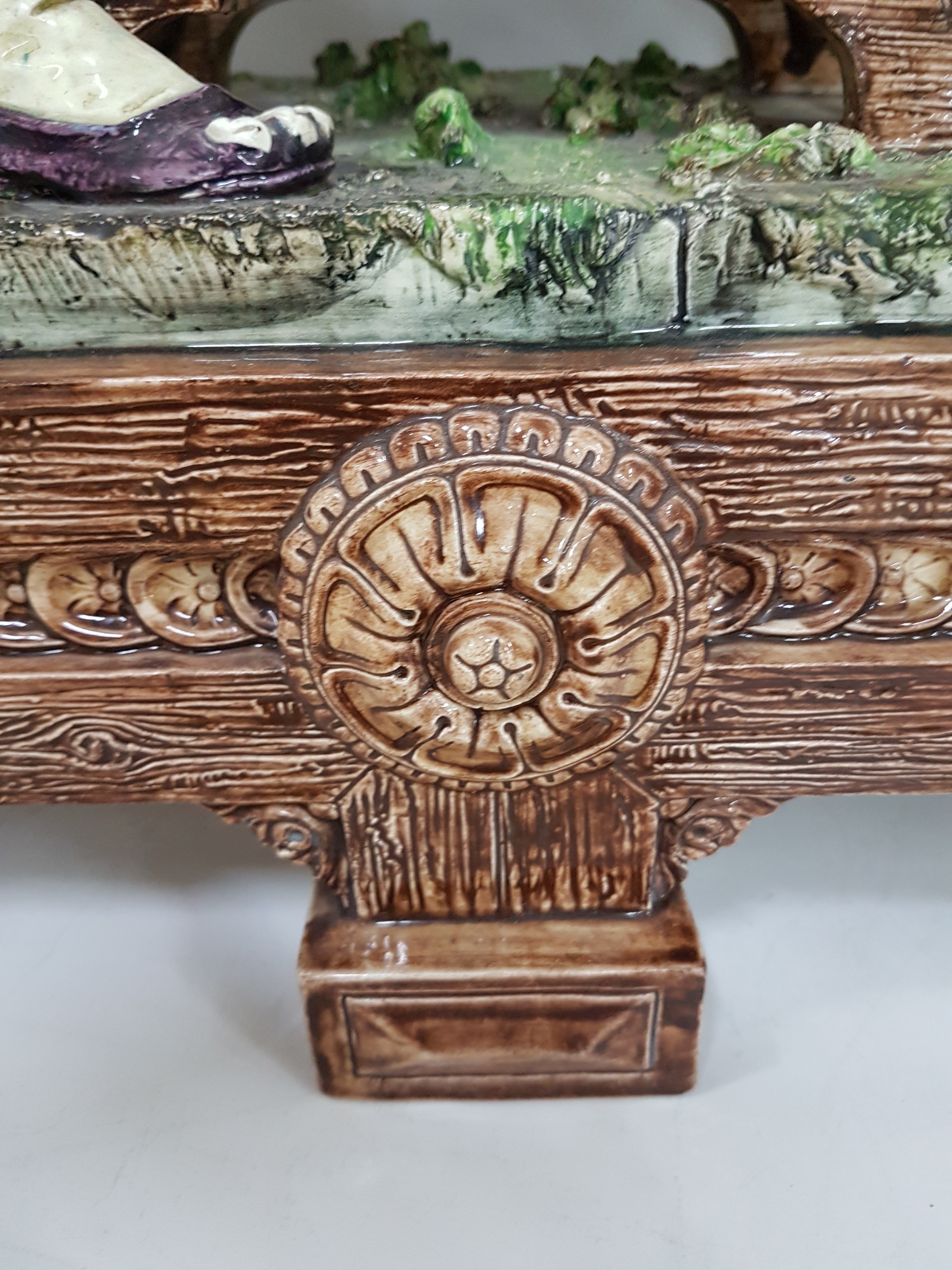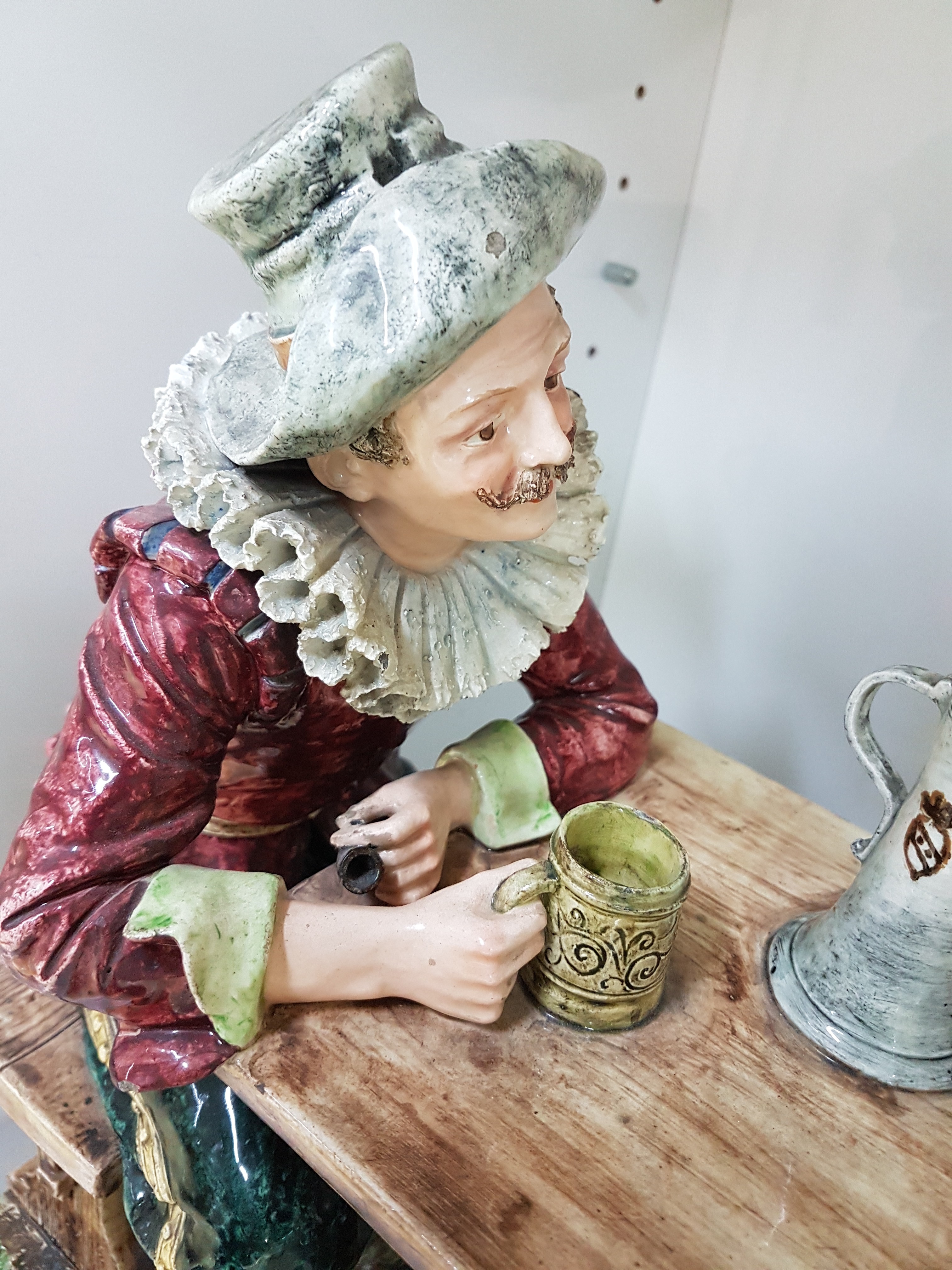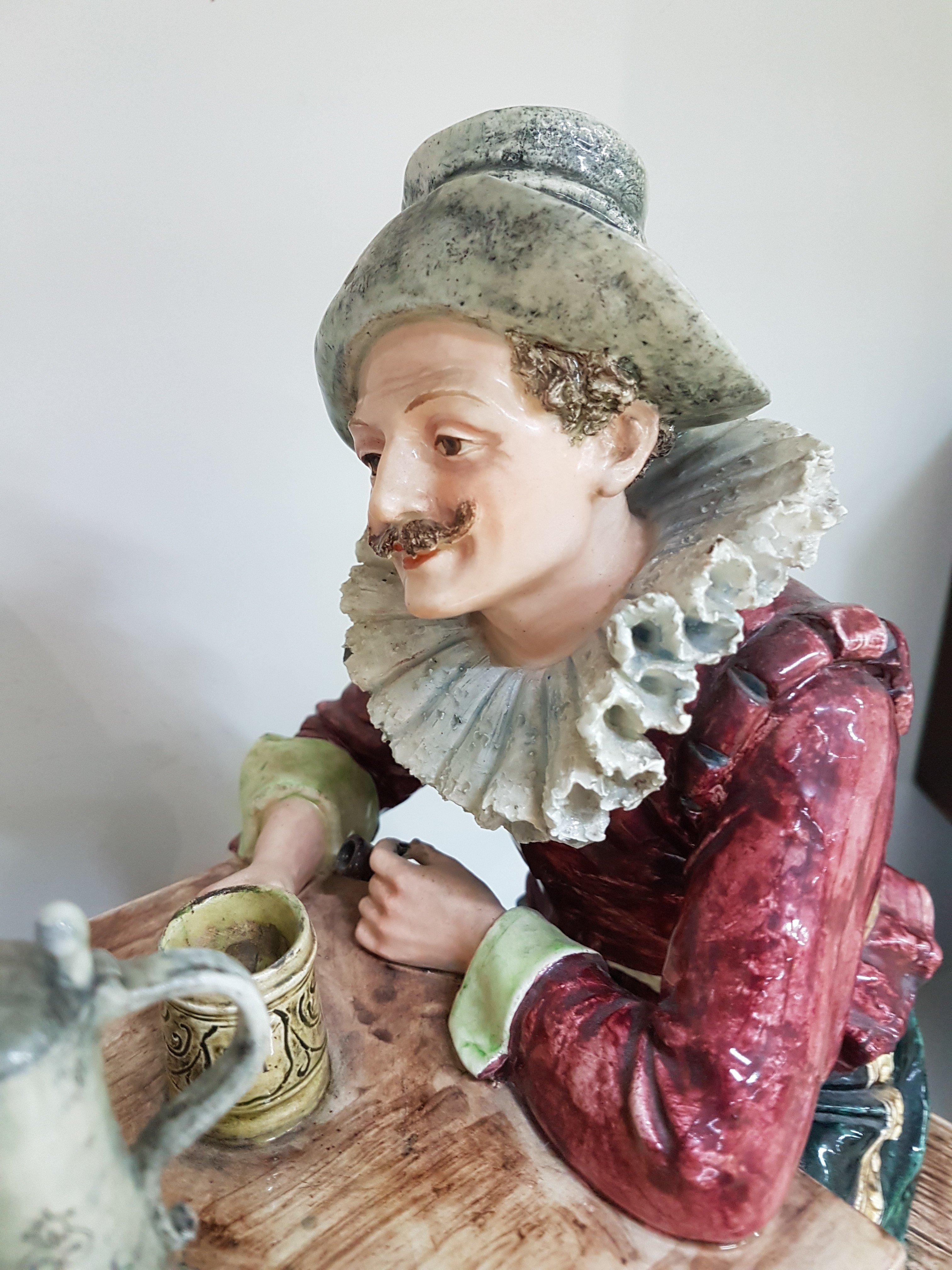 Große Keramikgruppe/Figurengruppe, wohl Wilhelm Schiller Bodenbach, um 1900, Wirtshausgruppe, vollplastische Darstellung, altersbedingt bestoßen, Unterseite mit Finger großer Bestoßung und Haarriss, ca. 54 x 45 x 23.5 cm, am Boden gemarkt gesetzlich geschützt 1227