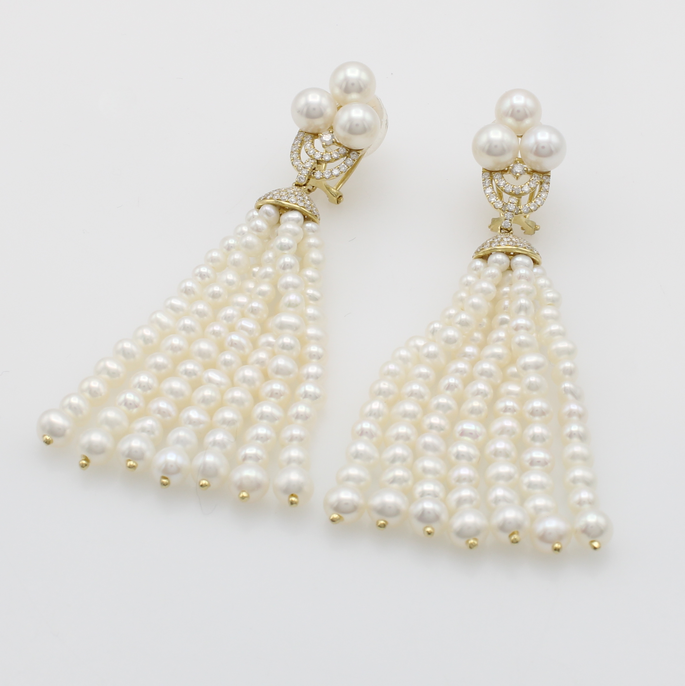 Paar Ohrstecker "Quasten" mit Süßwasserzucht- perlen und Brillanten, GG 750/000, 212 kl. u. 6 große, weiße Perlen, D. ca. 3.4-6.5 mm, 156 Brill. zus. ca. 0.86 ct Weiß/si, gepol- sterte Clips, Schätzpreis EUR 3750.-
