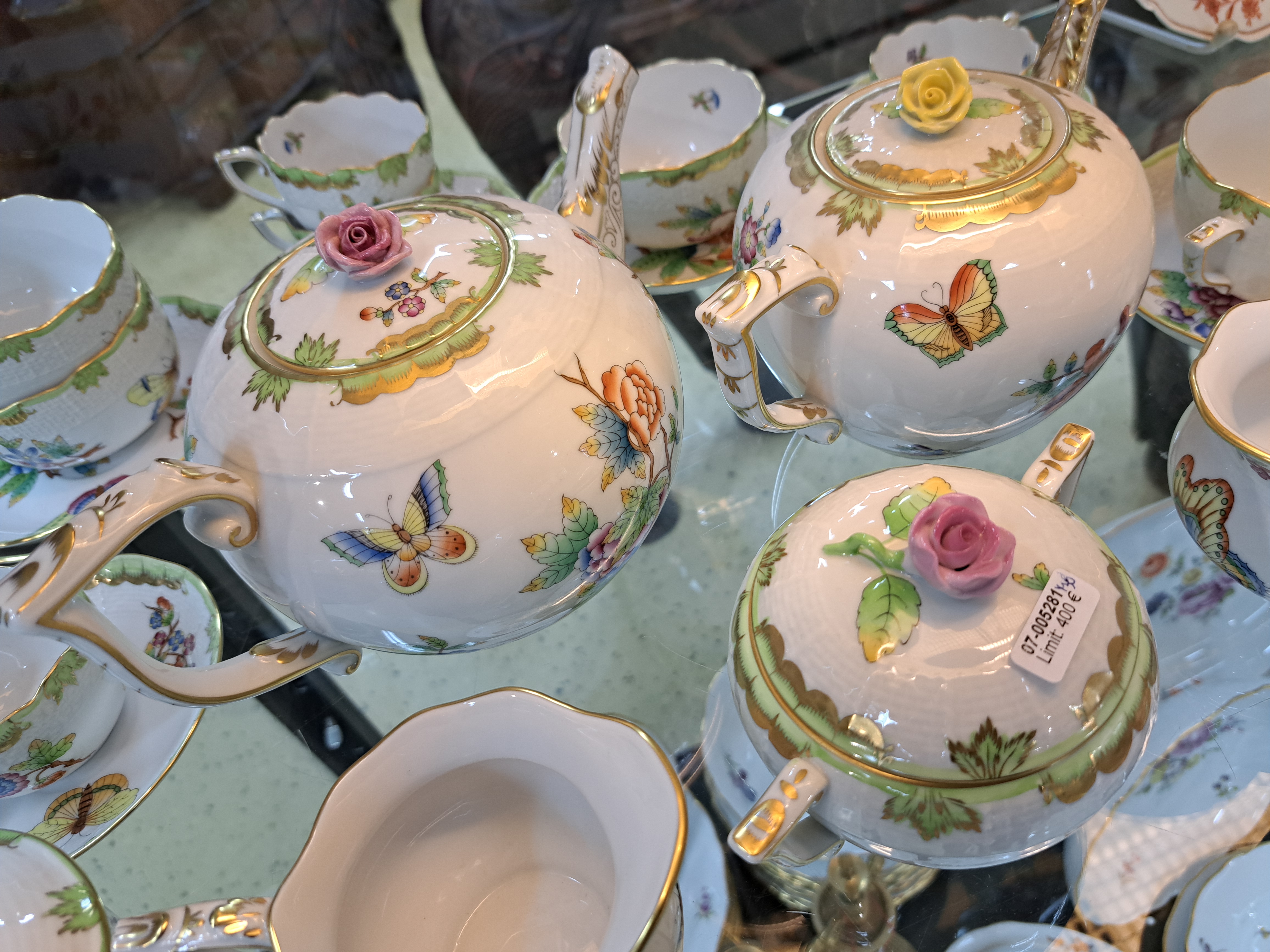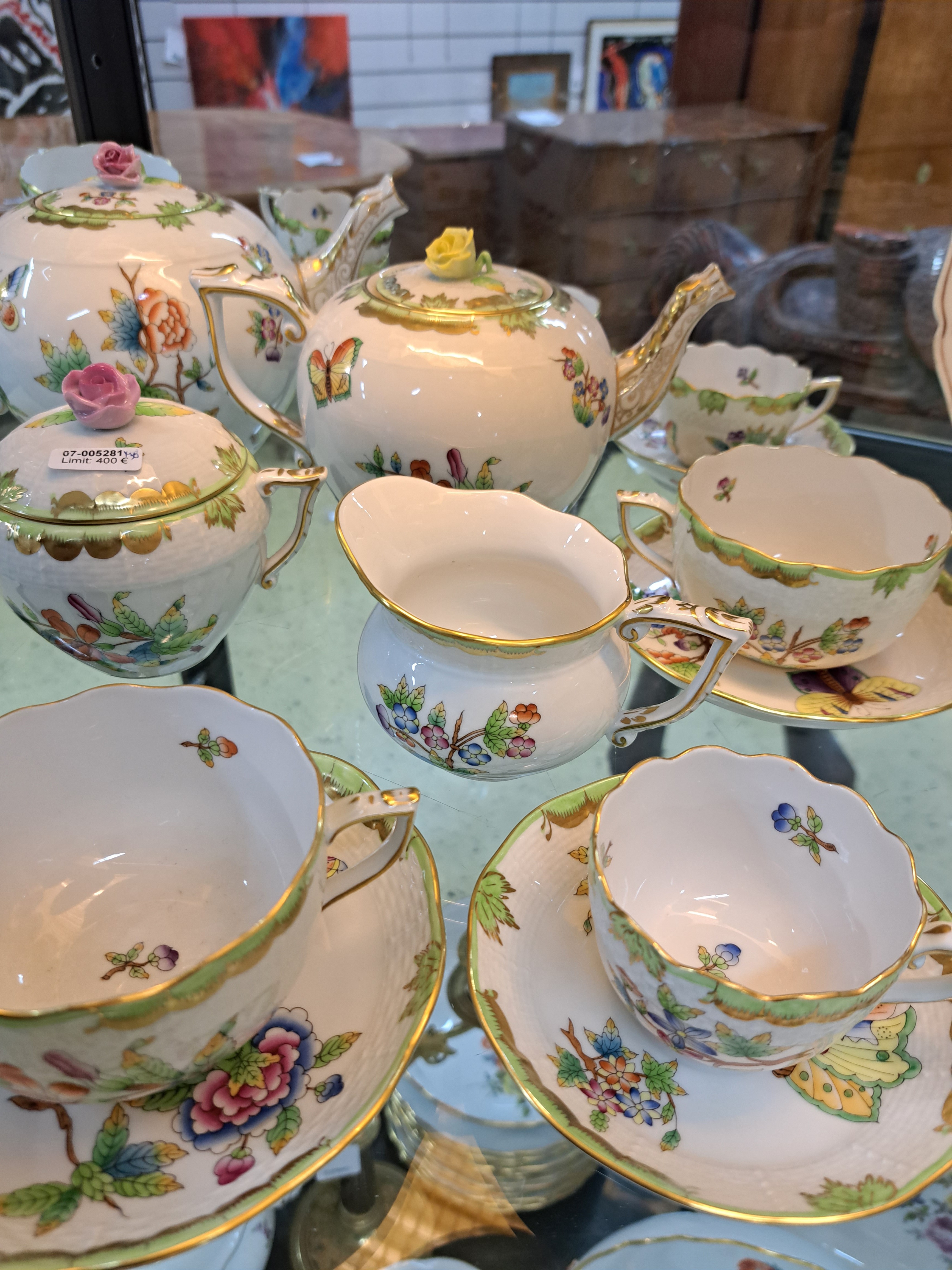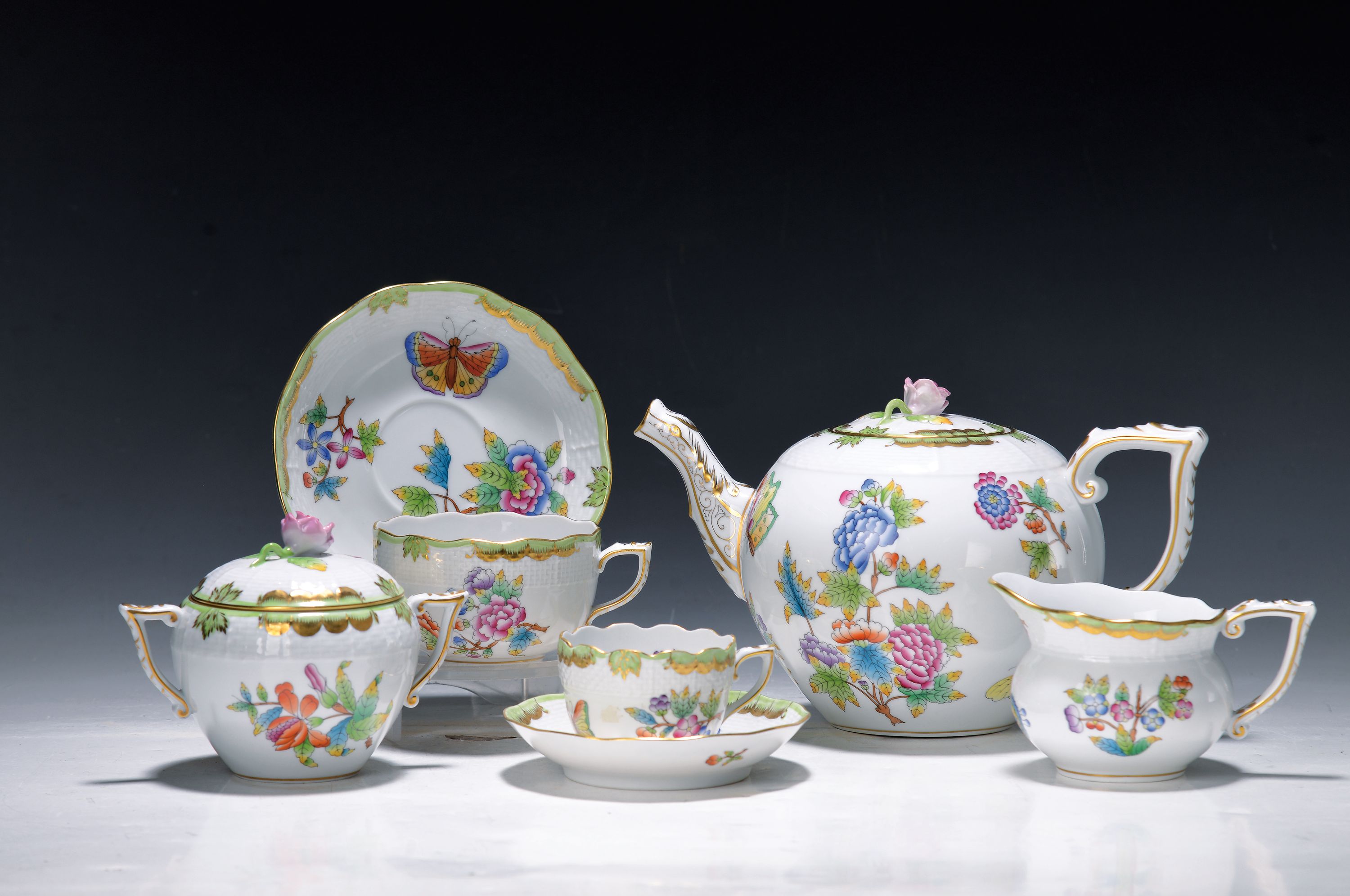 Teeservice, Herend Ungarn, Dekor Viktoria, kleine und große Teekanne, zwei Milchkännchen,