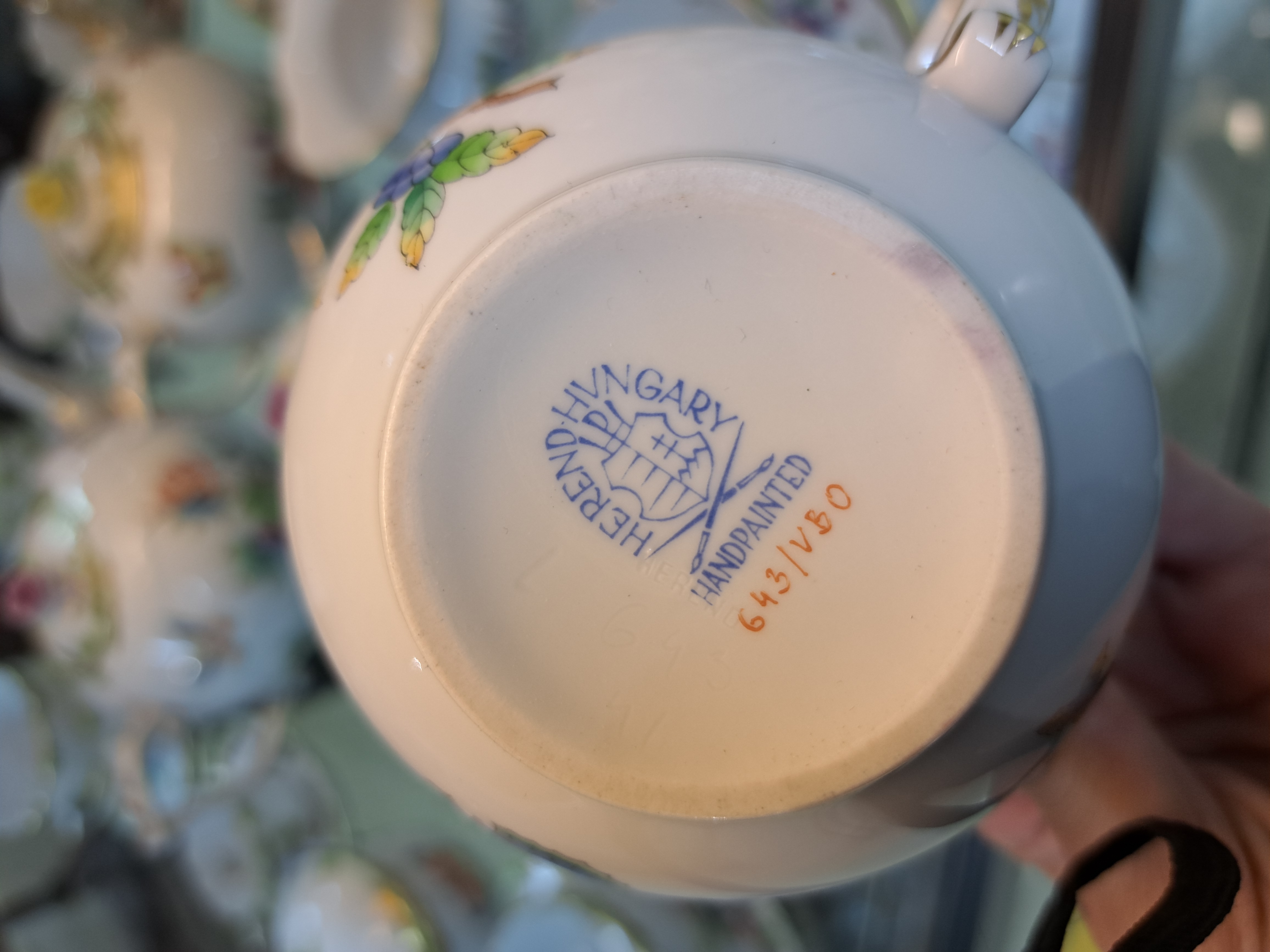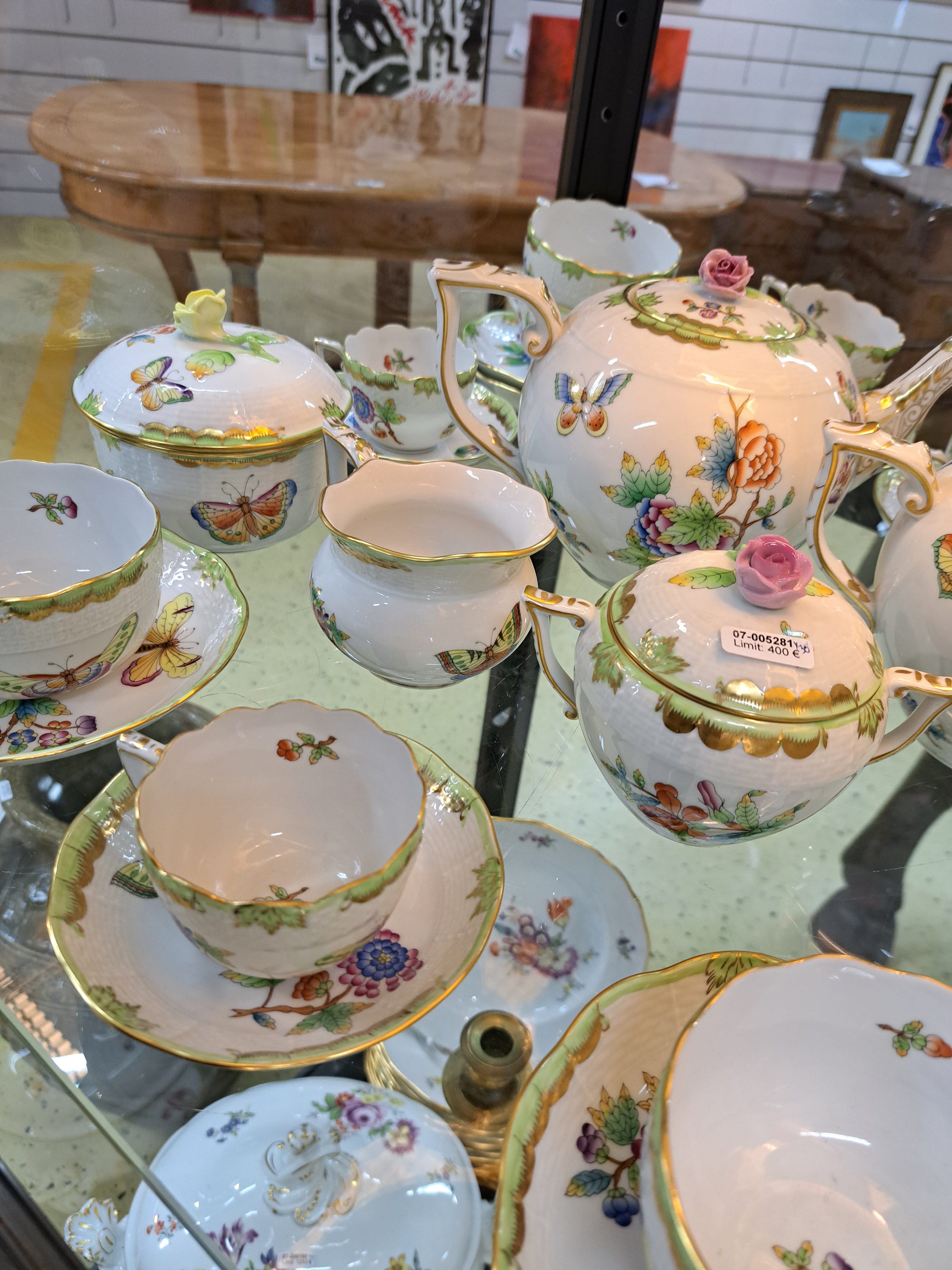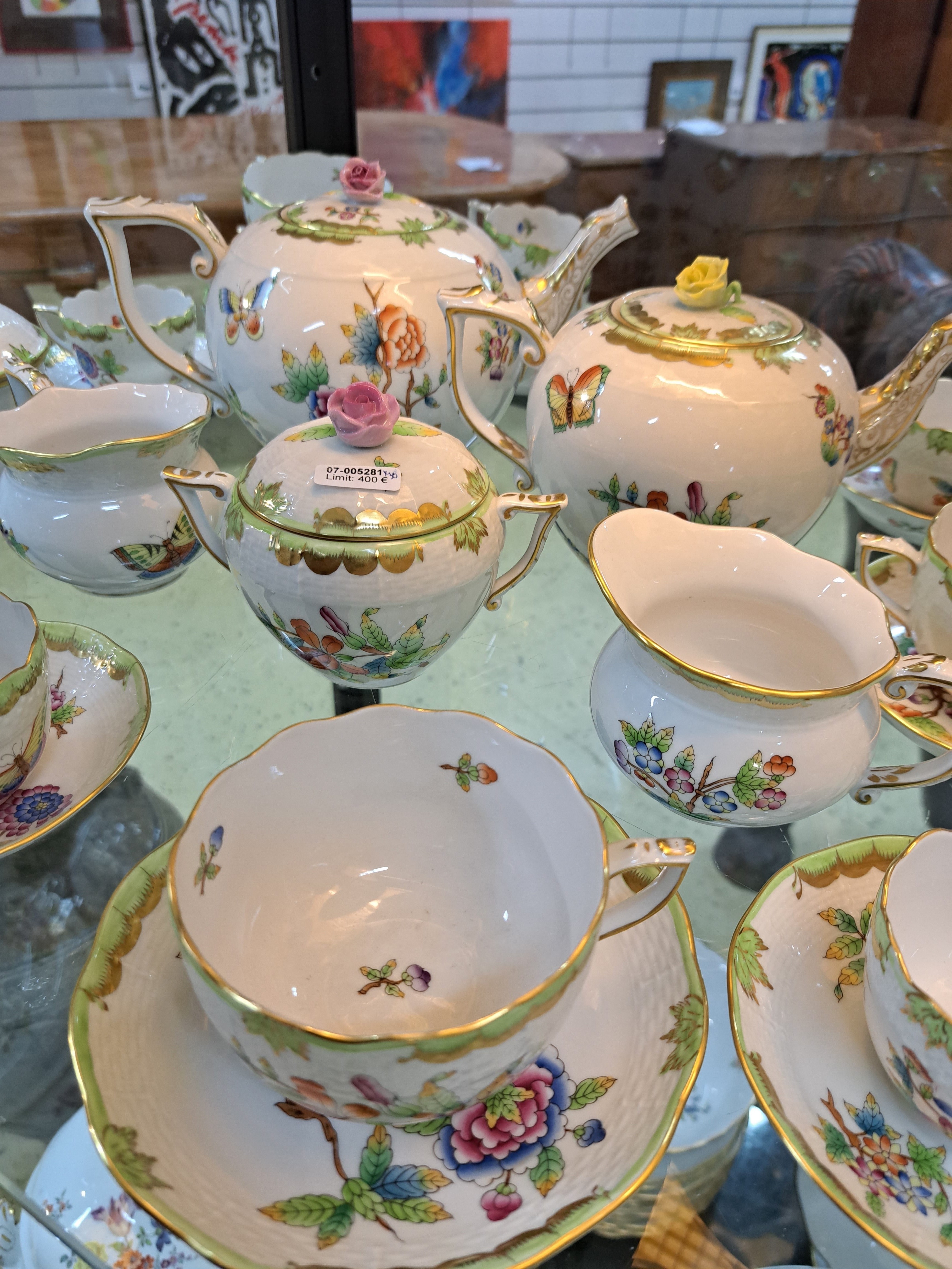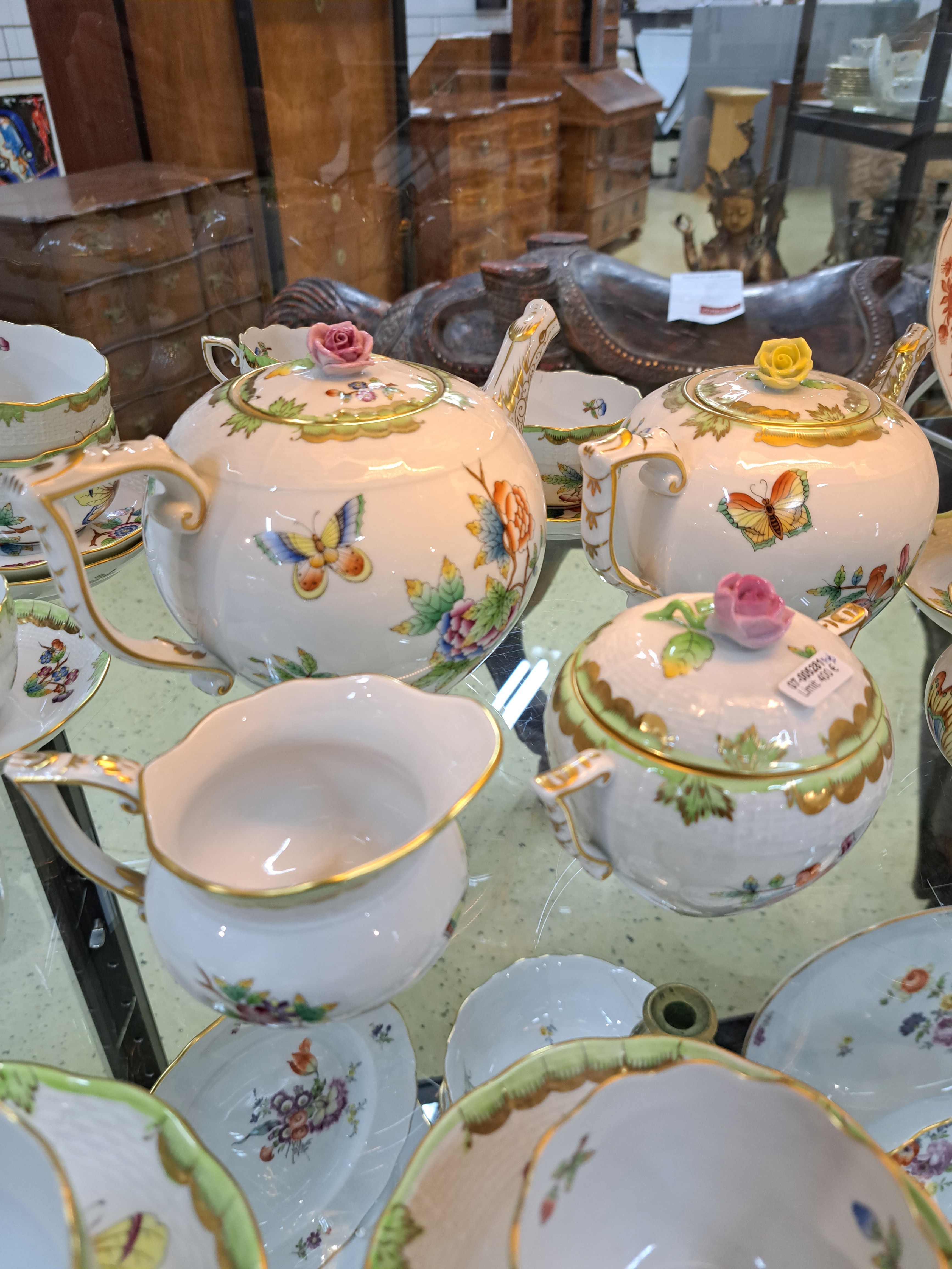 Teeservice, Herend Ungarn, Dekor Viktoria, kleine und große Teekanne, zwei Milchkännchen,