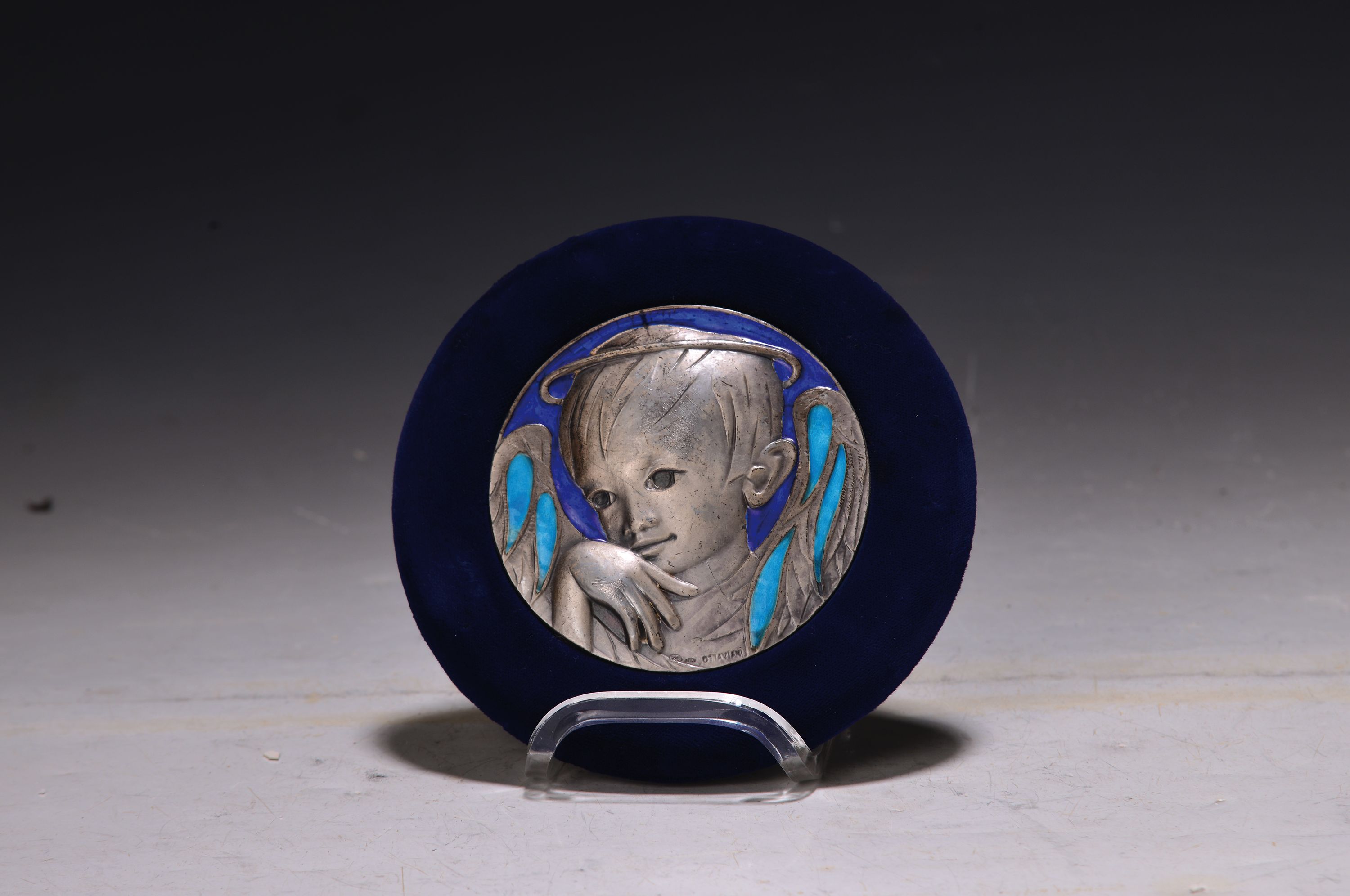 Silber-Plakette, Ottaviani, Macerata, Italien, 1960er-Jahre, 950er Silber, blauer