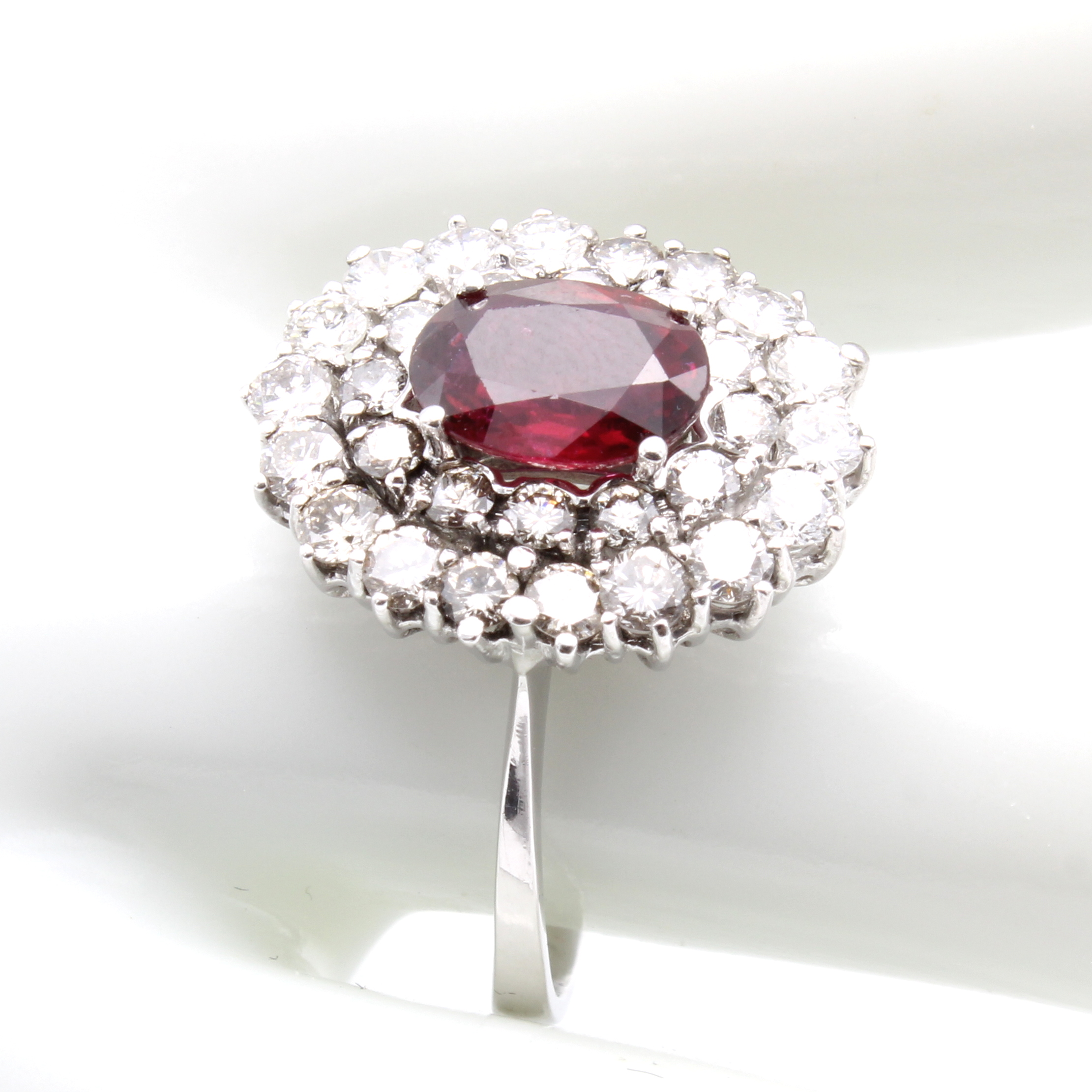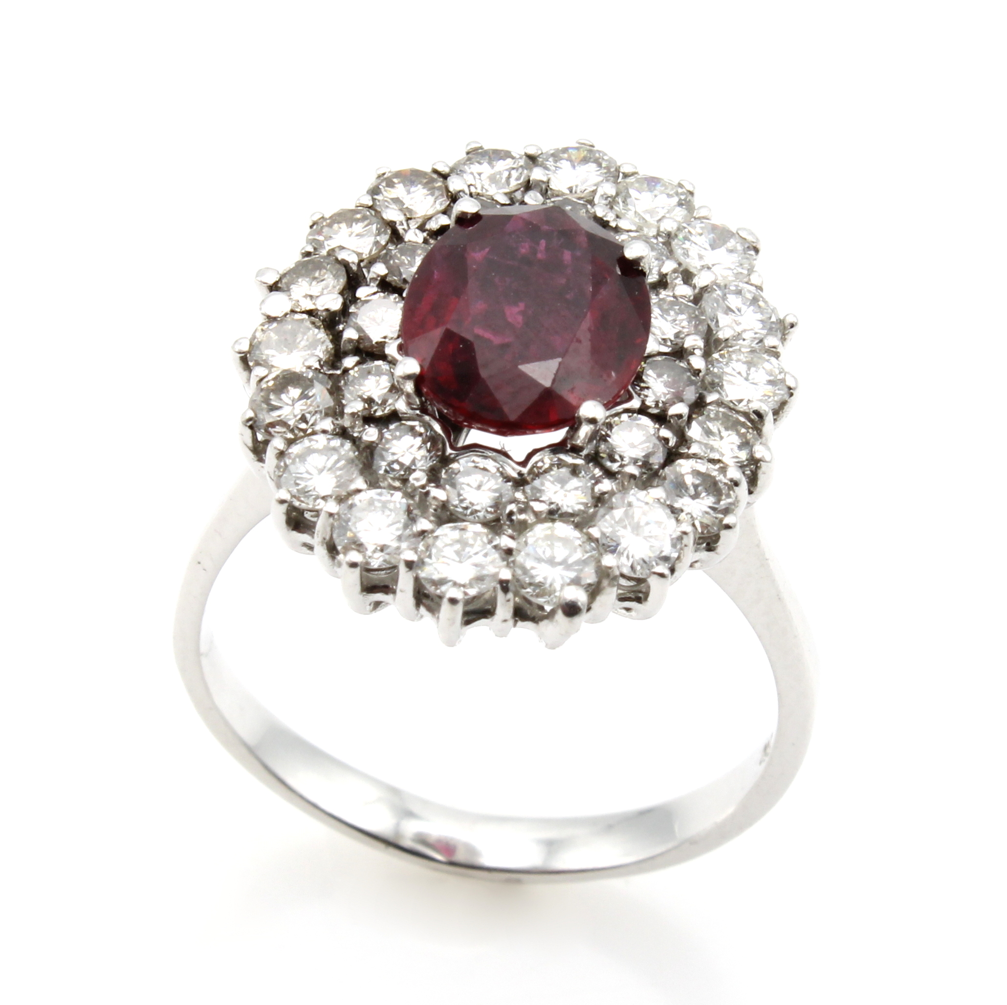 Ring mit Brillanten und Rubin, WG 750/000, ovaler Rubin ca. 2.5 ct von sehr guter Farbe, Brill. zus. ca. 1 ct Weiß-get.Weiß/p1, RW ca. 55 Schätzpreis: 9200, - EUR