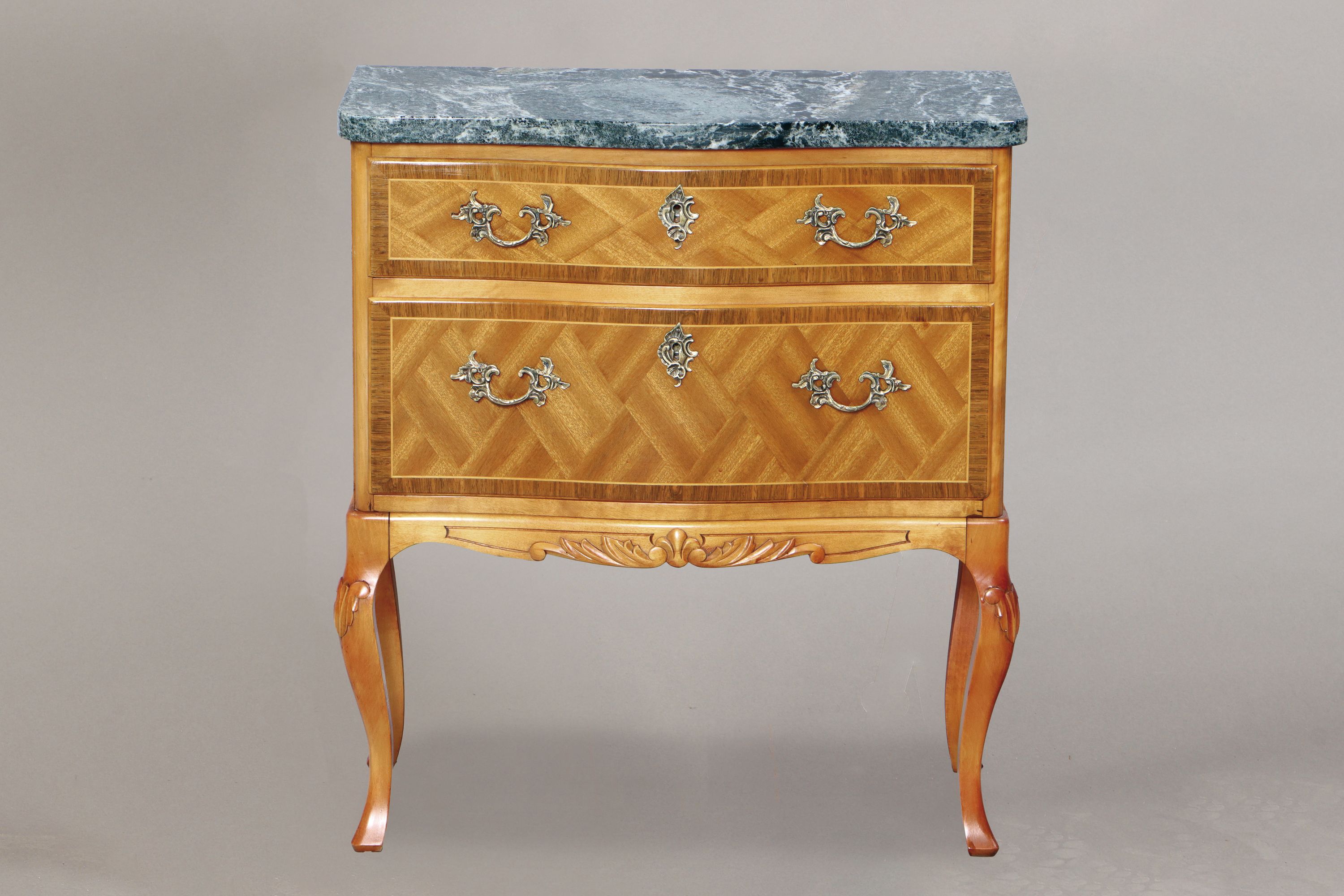 Kleine Barockstil-Kommode, fortgeschrittenes 20.Jh., Marmorplatte 2 Schubladen, Messingapplikationen,