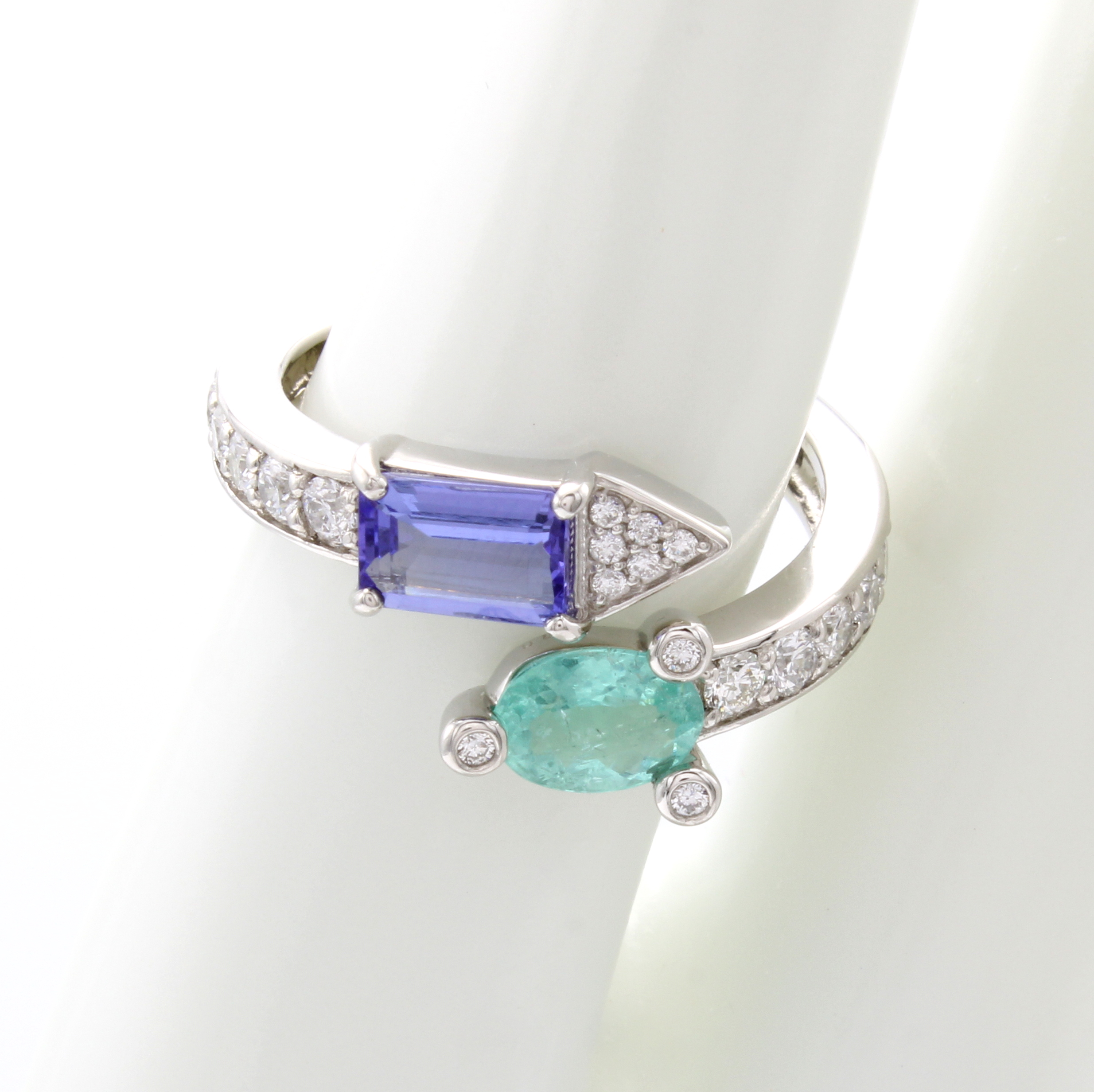 türkis-grüner, fac. Paraibaturmalin ca. 0.70 ct, Tansanitbaguette ca. 0.86 ct,
