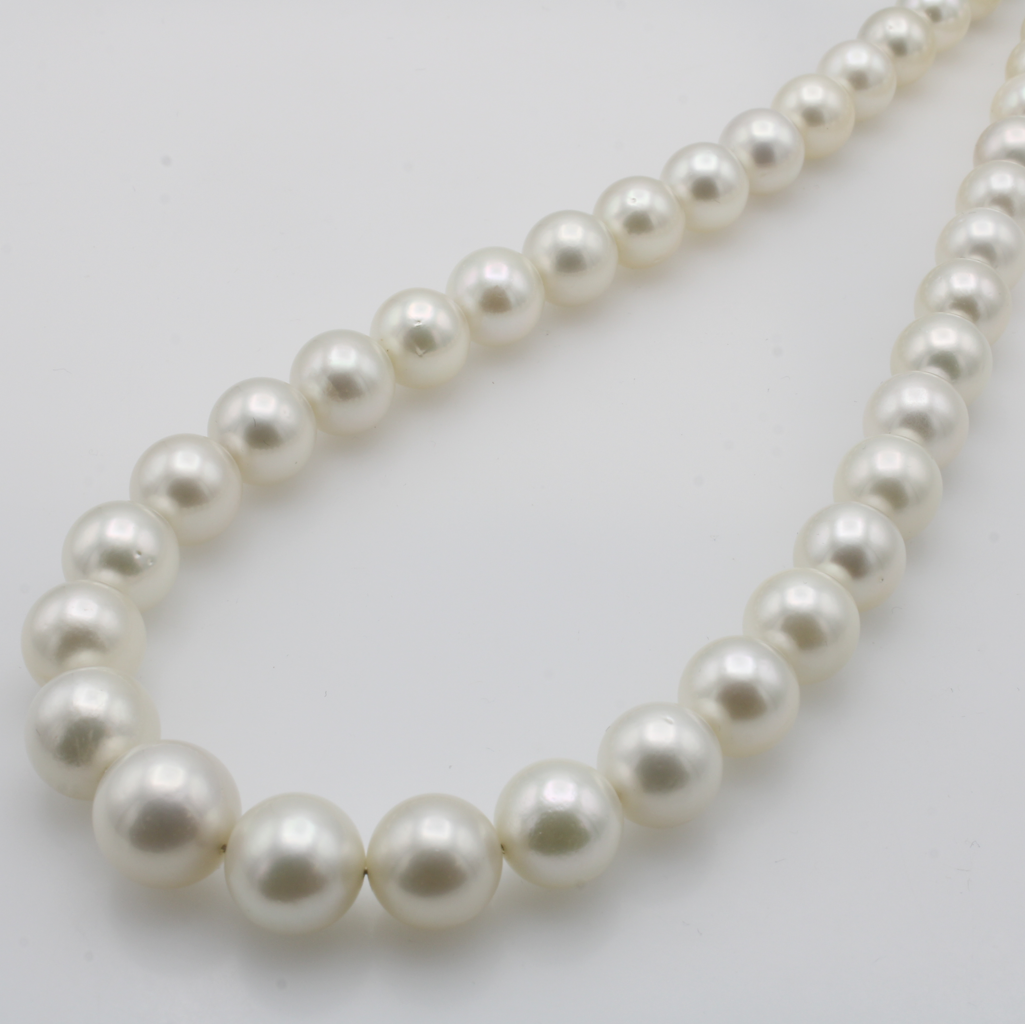 Südseeperlenstrang, im Verlauf gearb., weißePerlen ca. 10-13 mm, L. ca. 41.5 cm, Schätz- preis EUR 4000.-