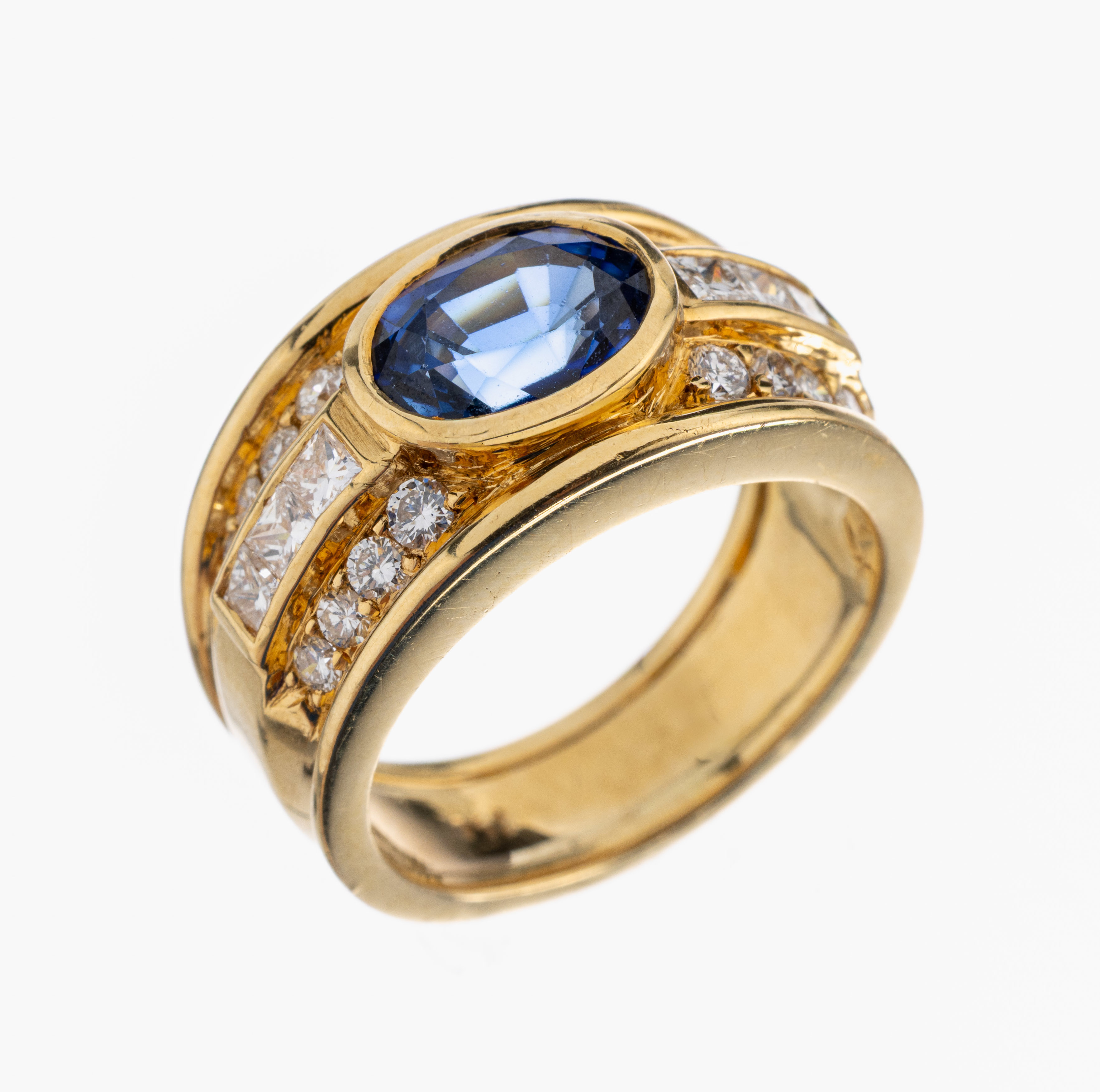 18 kt Gold Saphir-Diamant-Ring, GG 750/000,qualitätvolle Verarbeitung, mittig ovalfacett.Saphir