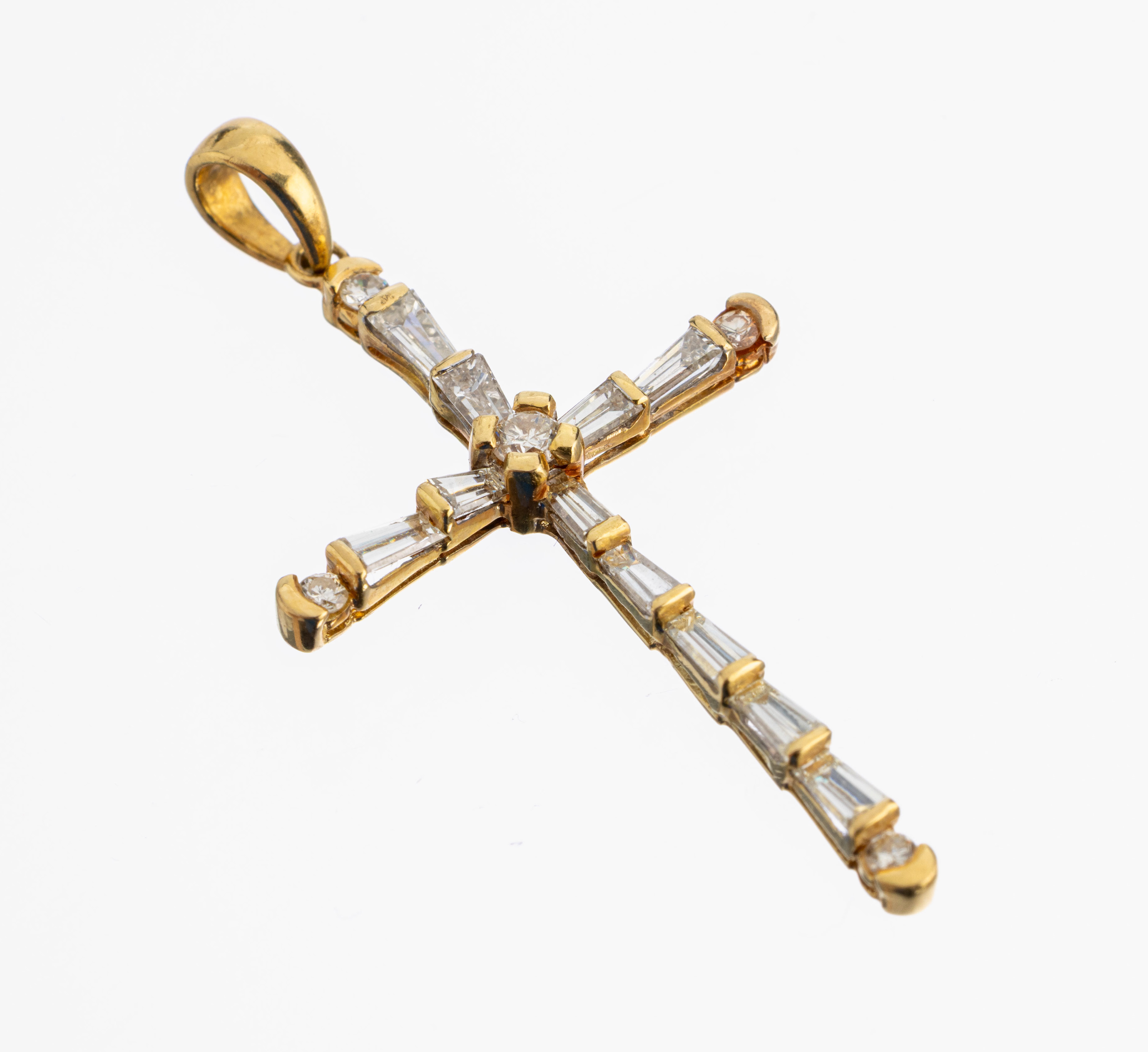 18 kt Gold Diamant-Kreuzanhänger, GG 750/000, 11 Diamant-Trapeze und 5 Brillanten zus. ca. 0.70 ct l.get.Weiß/vs-si, ca. 3.8 x 2cm, ca. 2.0 g