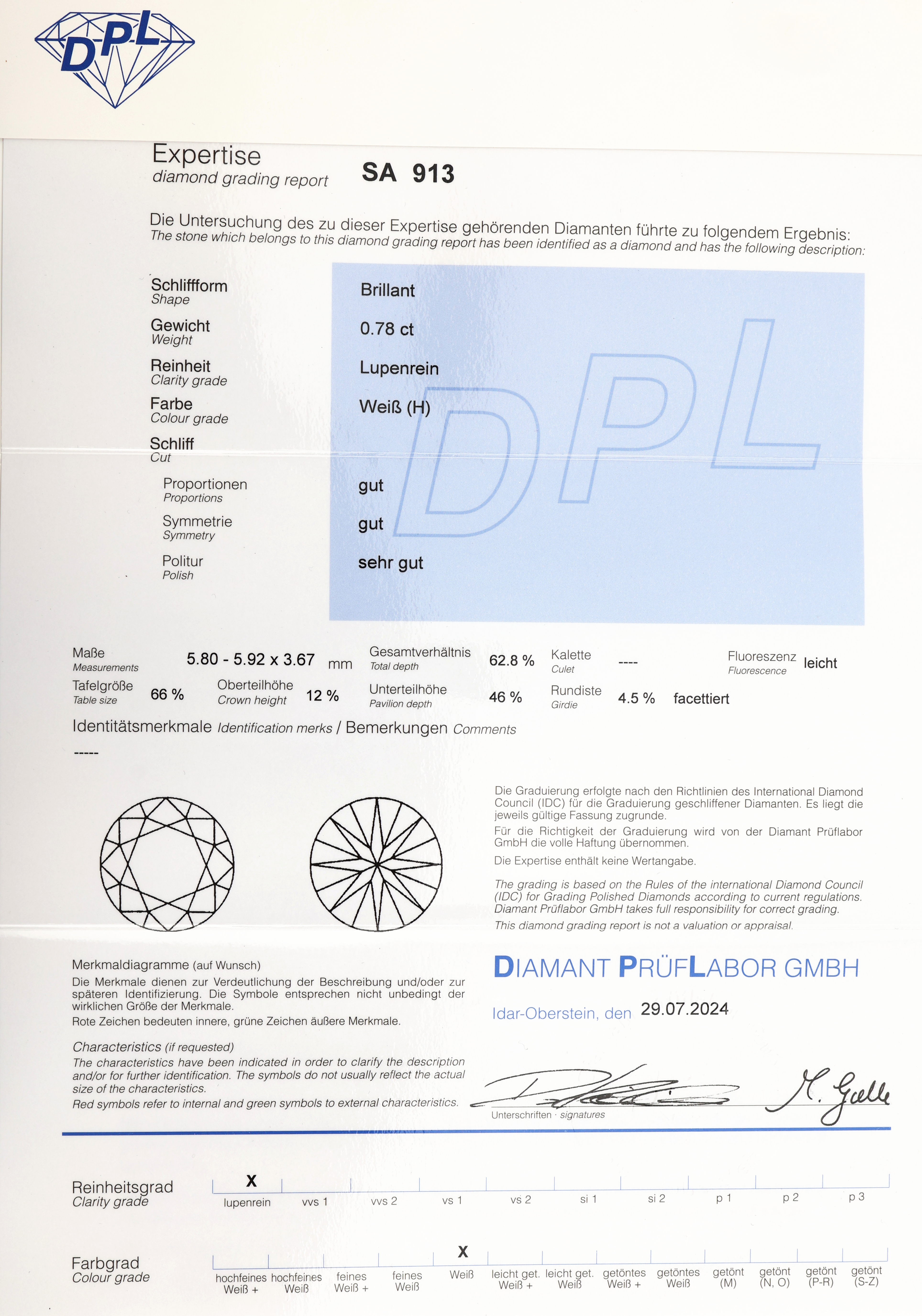 0.78 ct Weiß(H)/lr, umgeben von Brillanten zus. ca. 0.22 ct feines Weiß-Weiß/vs-si,