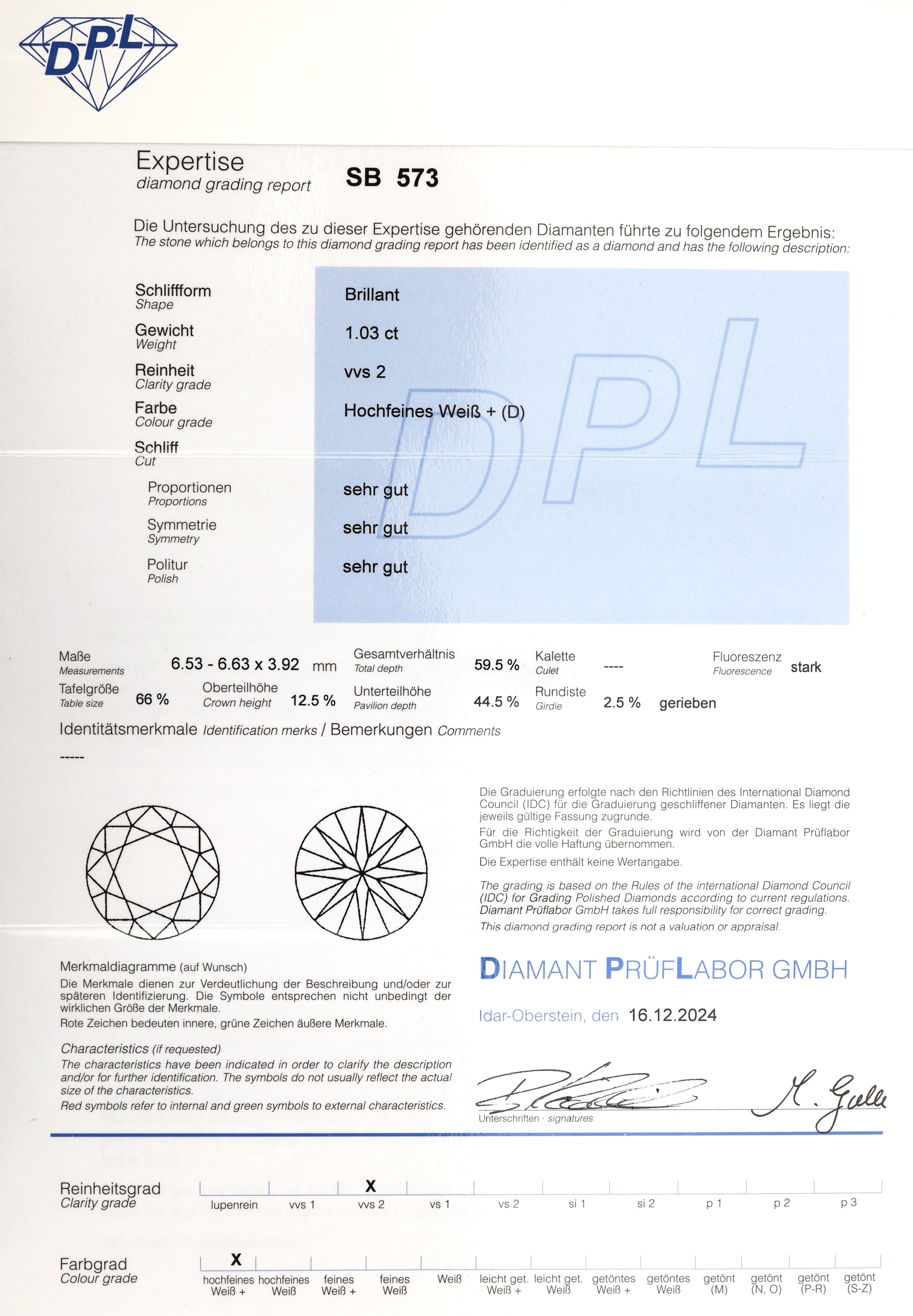 zus. ca. 0.31 ct feines Weiß-Weiß/vs-si, RW 57, ca. 3.2g, DPL-Expertise für Mittelstein
