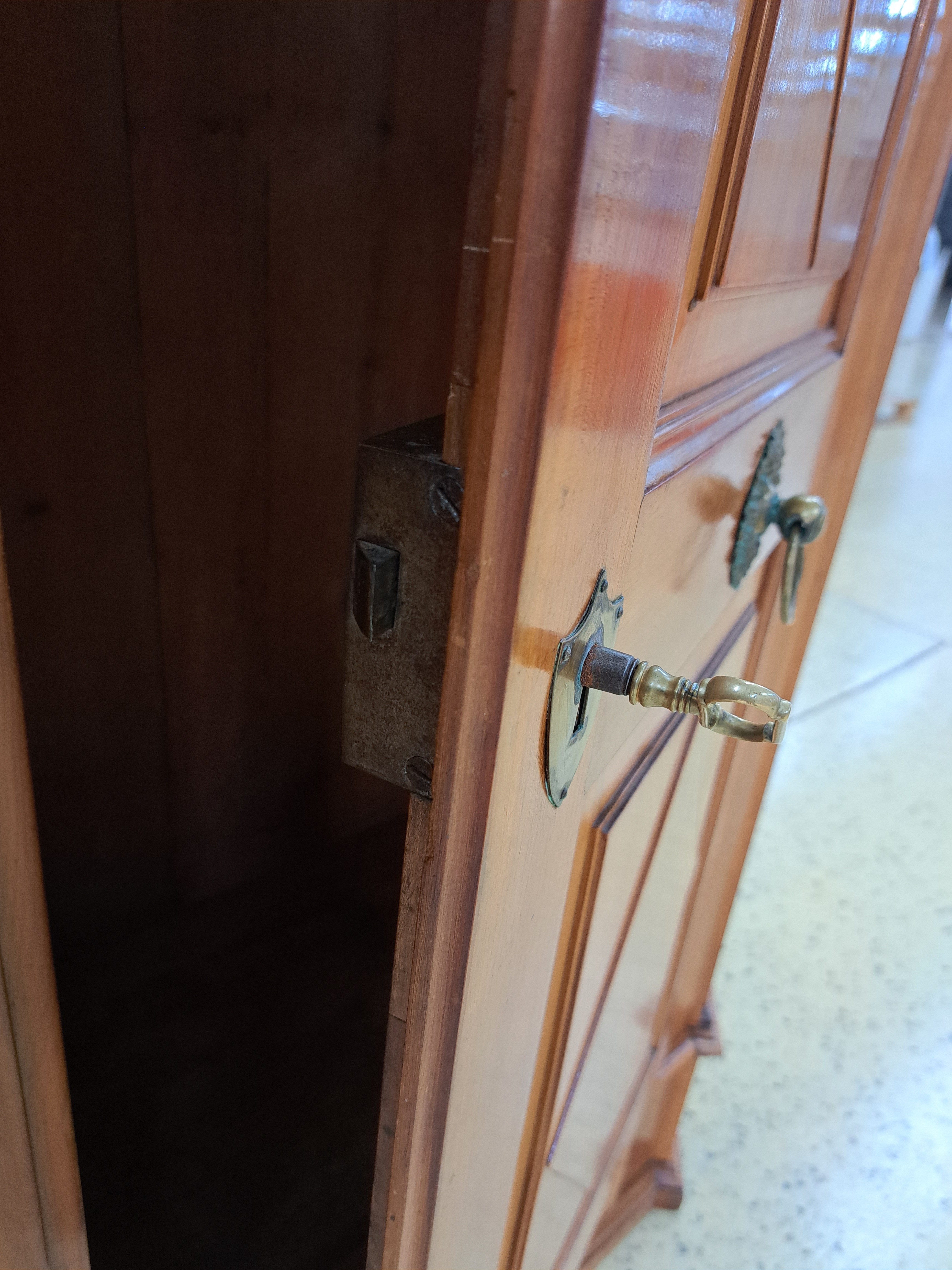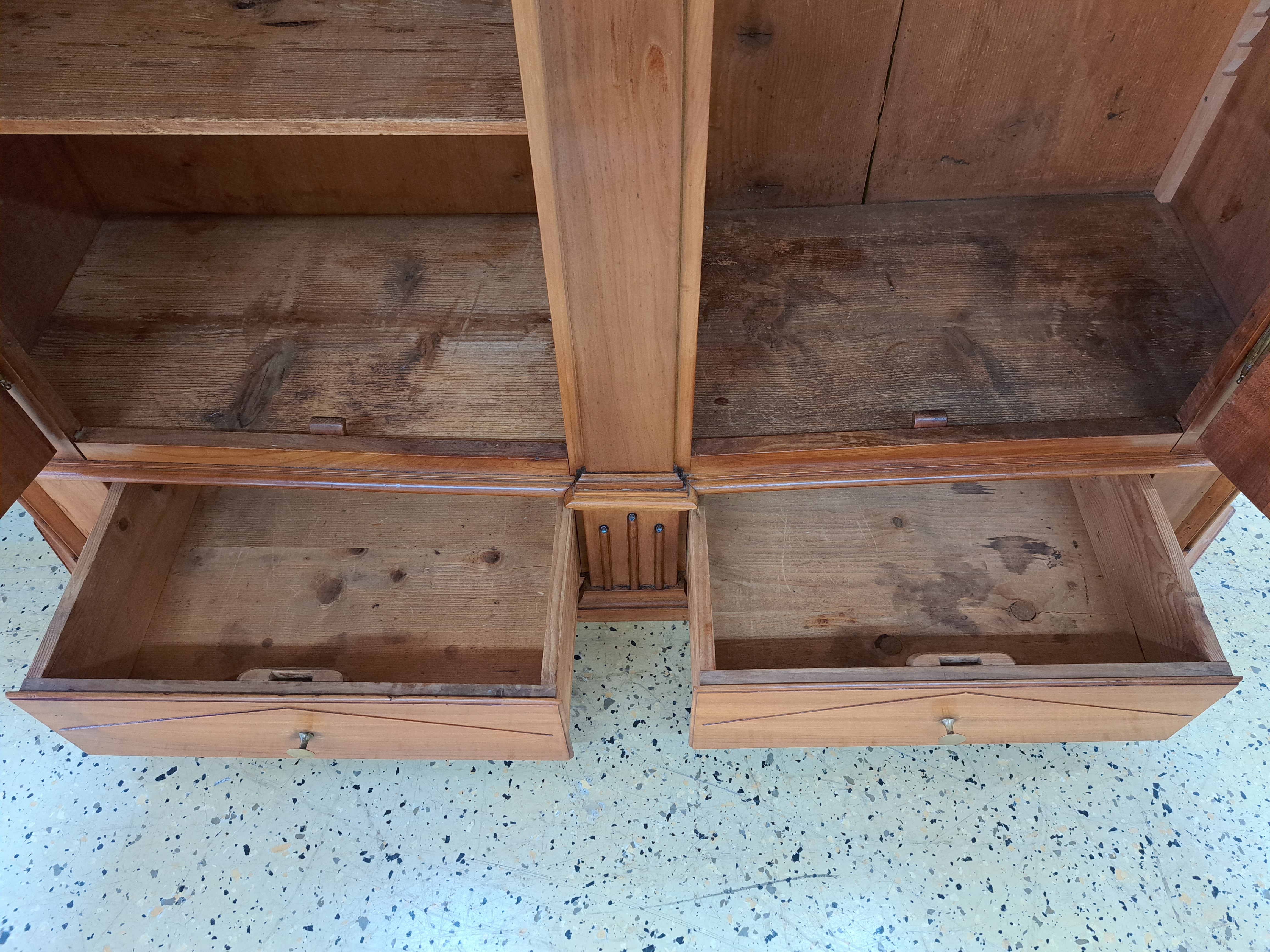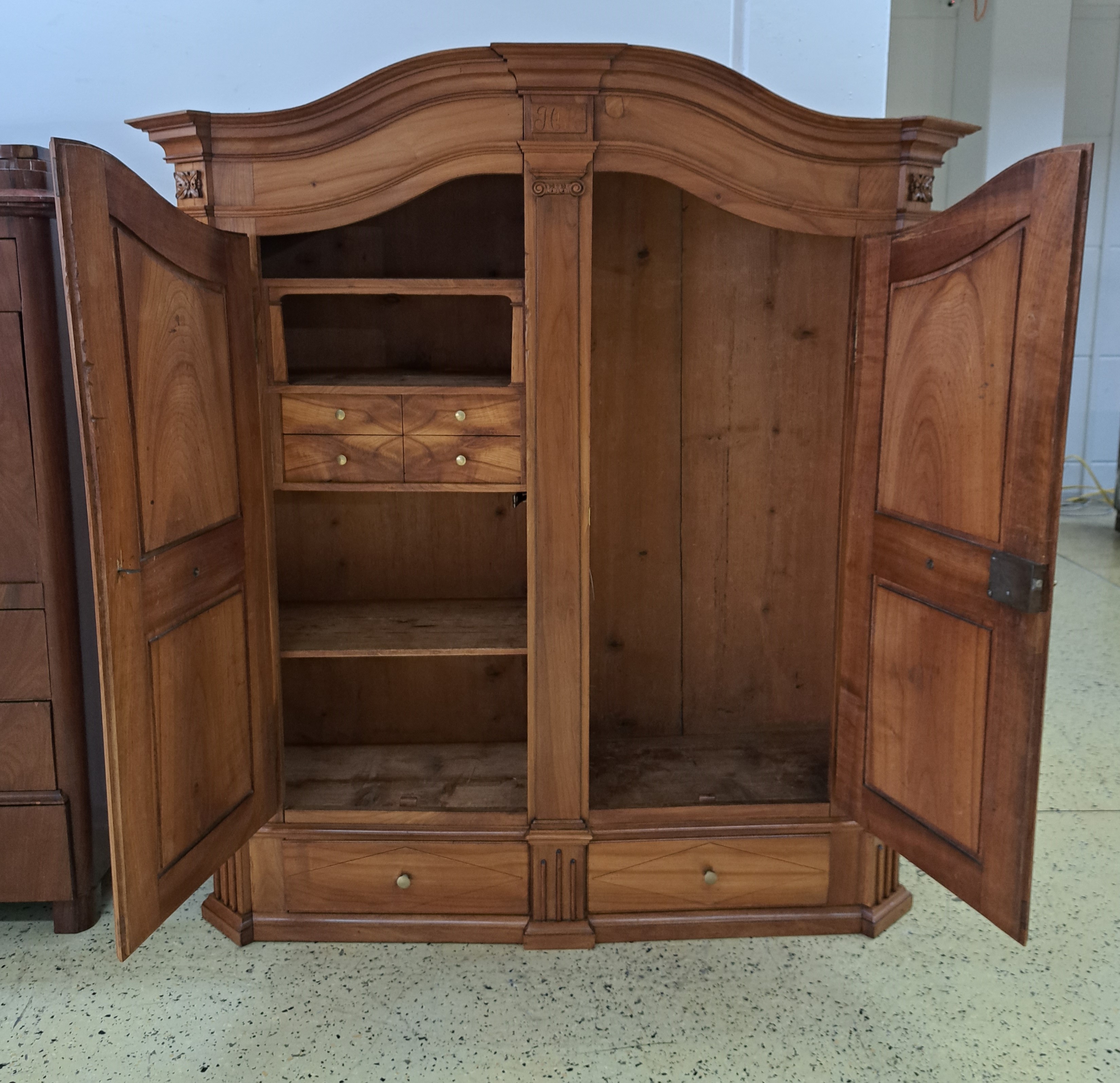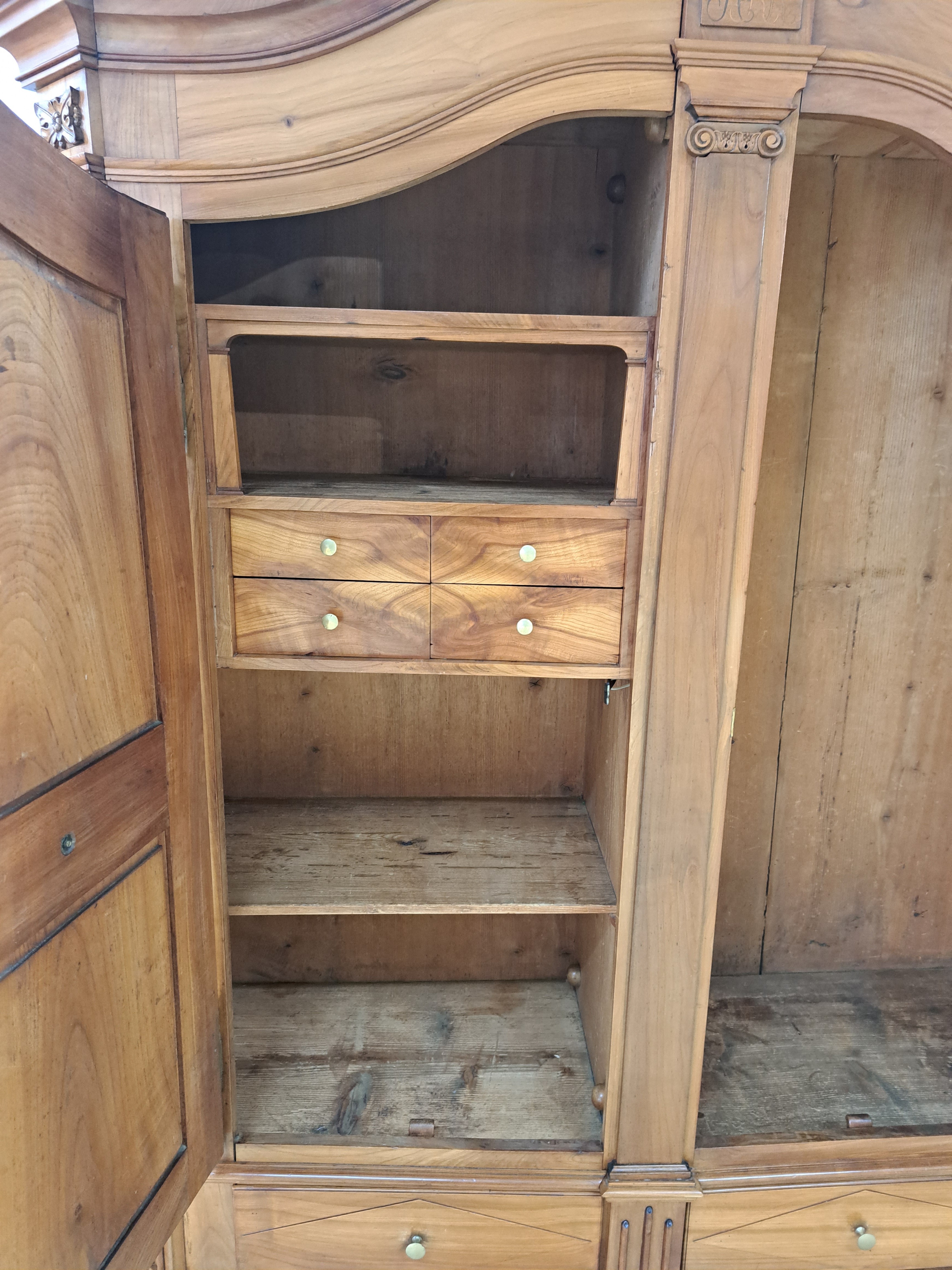 Bodenseeschrank, wohl Bregrenzerwald, um 1830, Kirschbaum massiv, zweitürig, Inneneinteilung Sekretär ähnlich, orig. Schloss Beschläge und Schlüssel, keine Füße ca. 176 x 166 x 54 cm; EZ 2