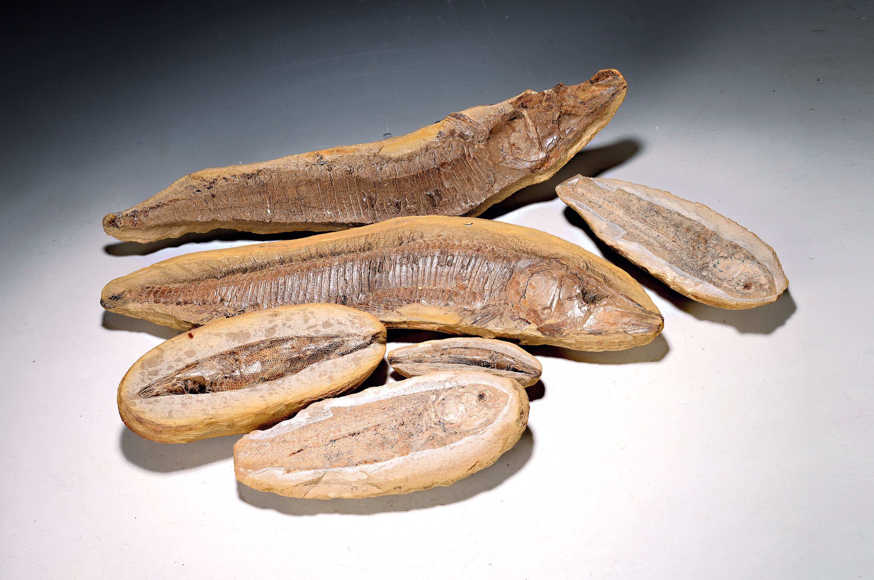Sechs Schlammfische, ca. 100 Mio Jahre alt, teilweise sichtbare Chitinhaut, dreimal