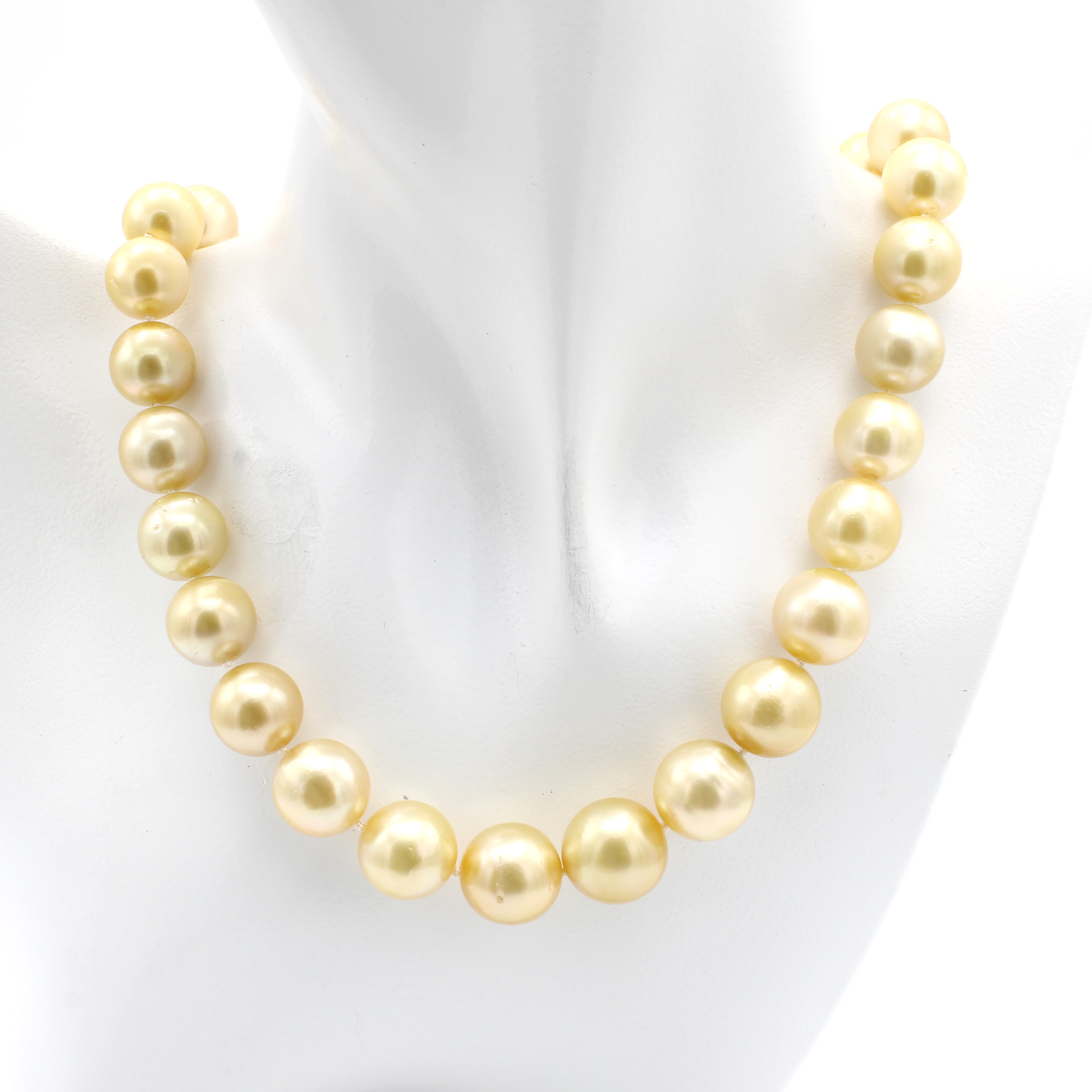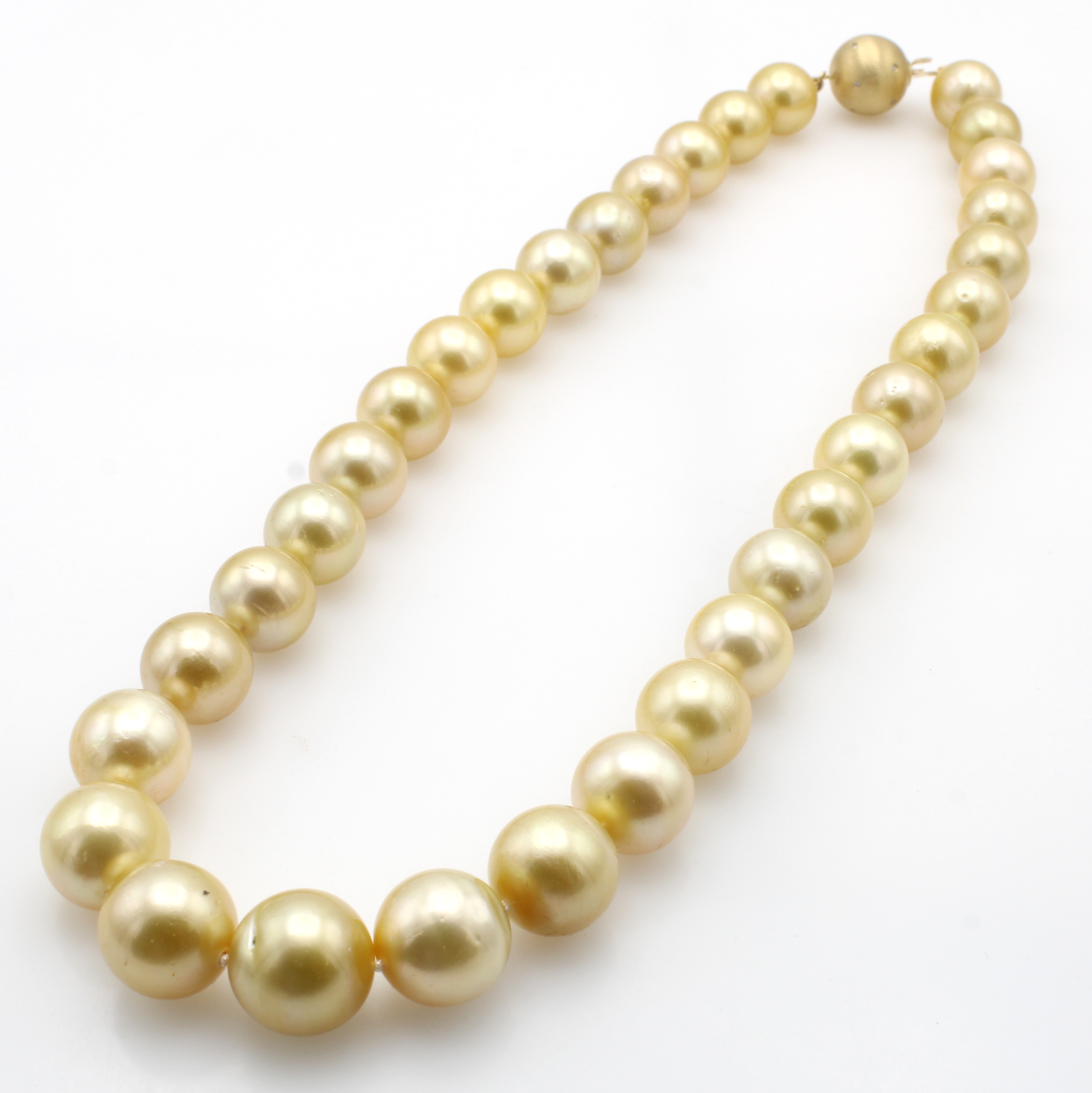 Collier aus Südseezuchtperlen und Brillanten, Kugelschl. GG 750/000 mattiert und besetzt mit Brillanten zus. ca. 0.06 ct Weiß/si, im Verlauf gearbeitete, champagnerfarbene Perlen v. schönem Lüster ca. 12-15 mm, sehr gleich- mäßige Farbe und Form, L. ca. 46 cm Schätzpreis: 14000, - EUR