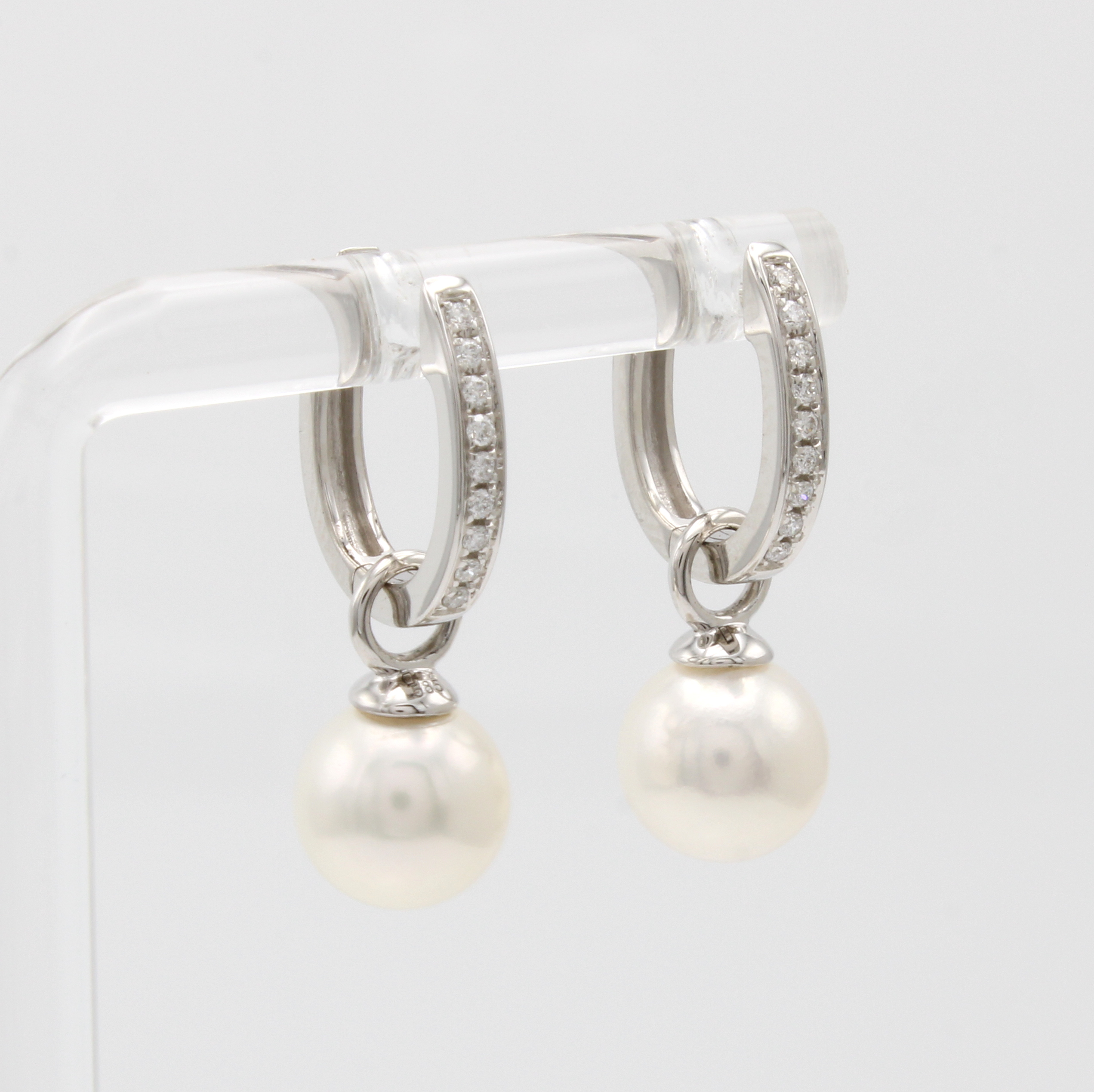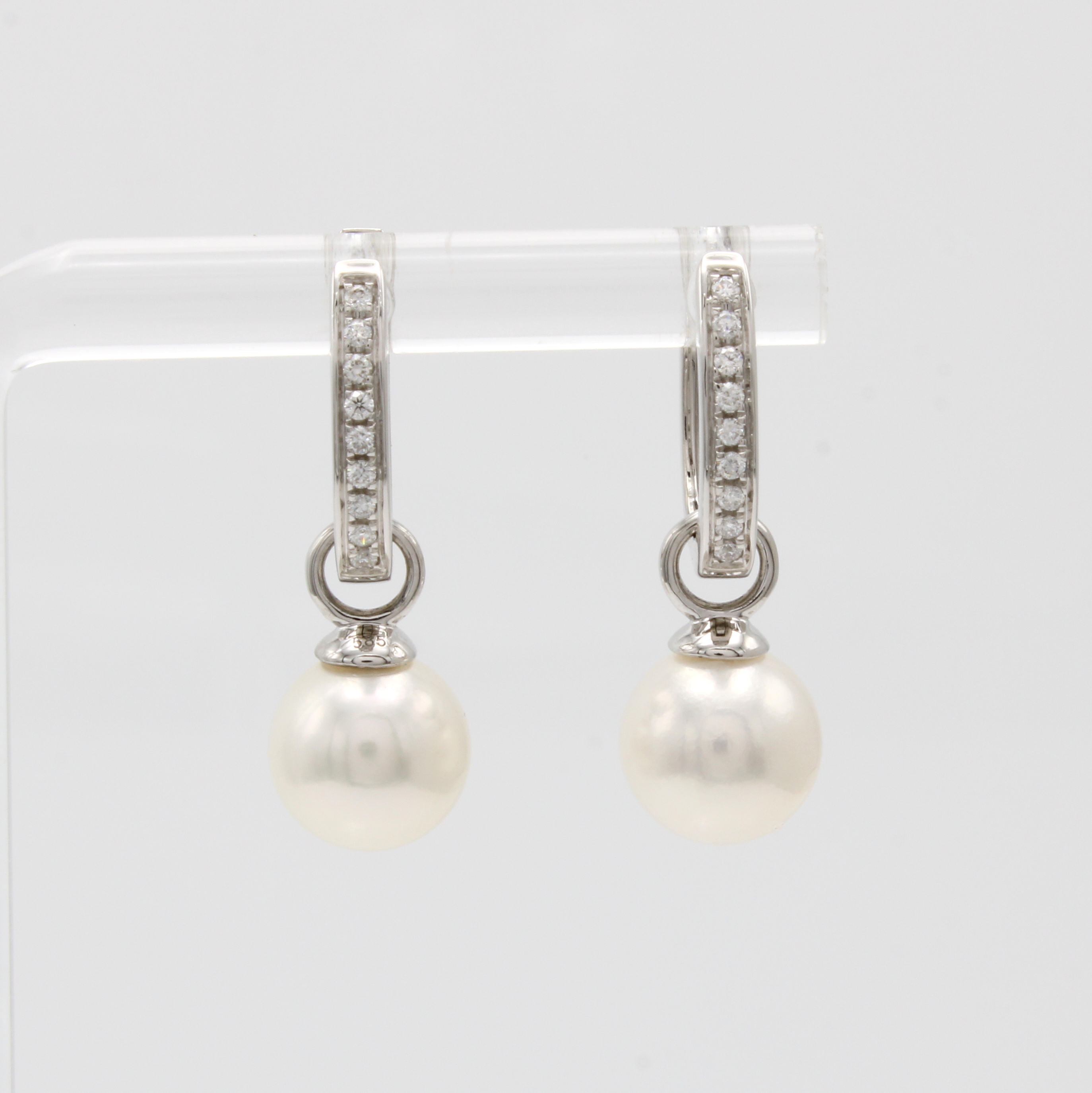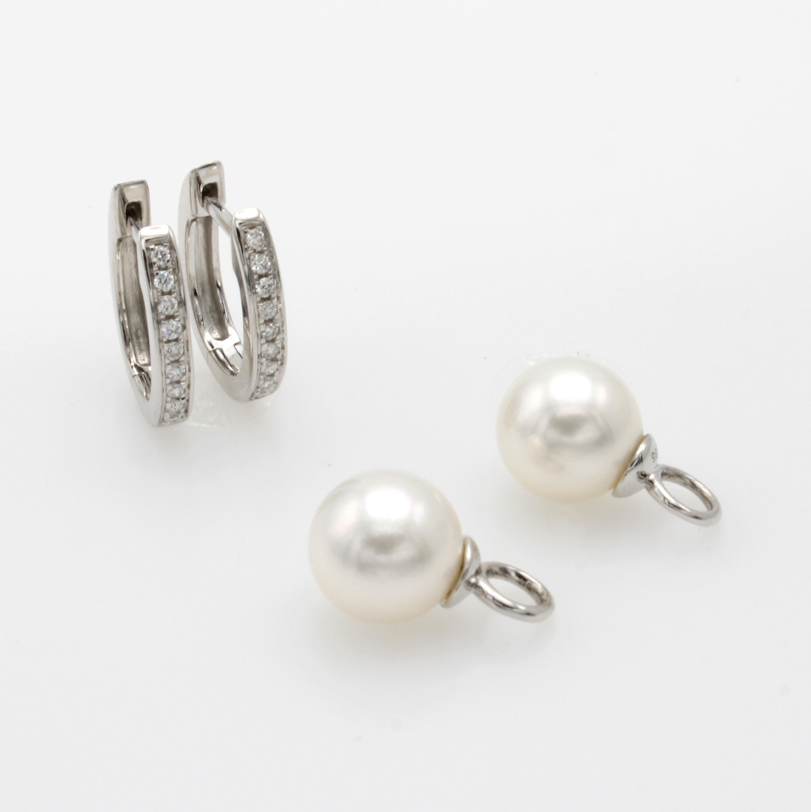 Paar Creolen mit Brillanten und Akoyazucht- perlen, WG 585/000, 18 Brill. zus. ca. 0.13 ct Weiß/si, runde, weiße Perlen ca. 8.5-9 mm (auch ohne Perlabhängungen tragbar) Schätzpreis: 2200, - EUR
