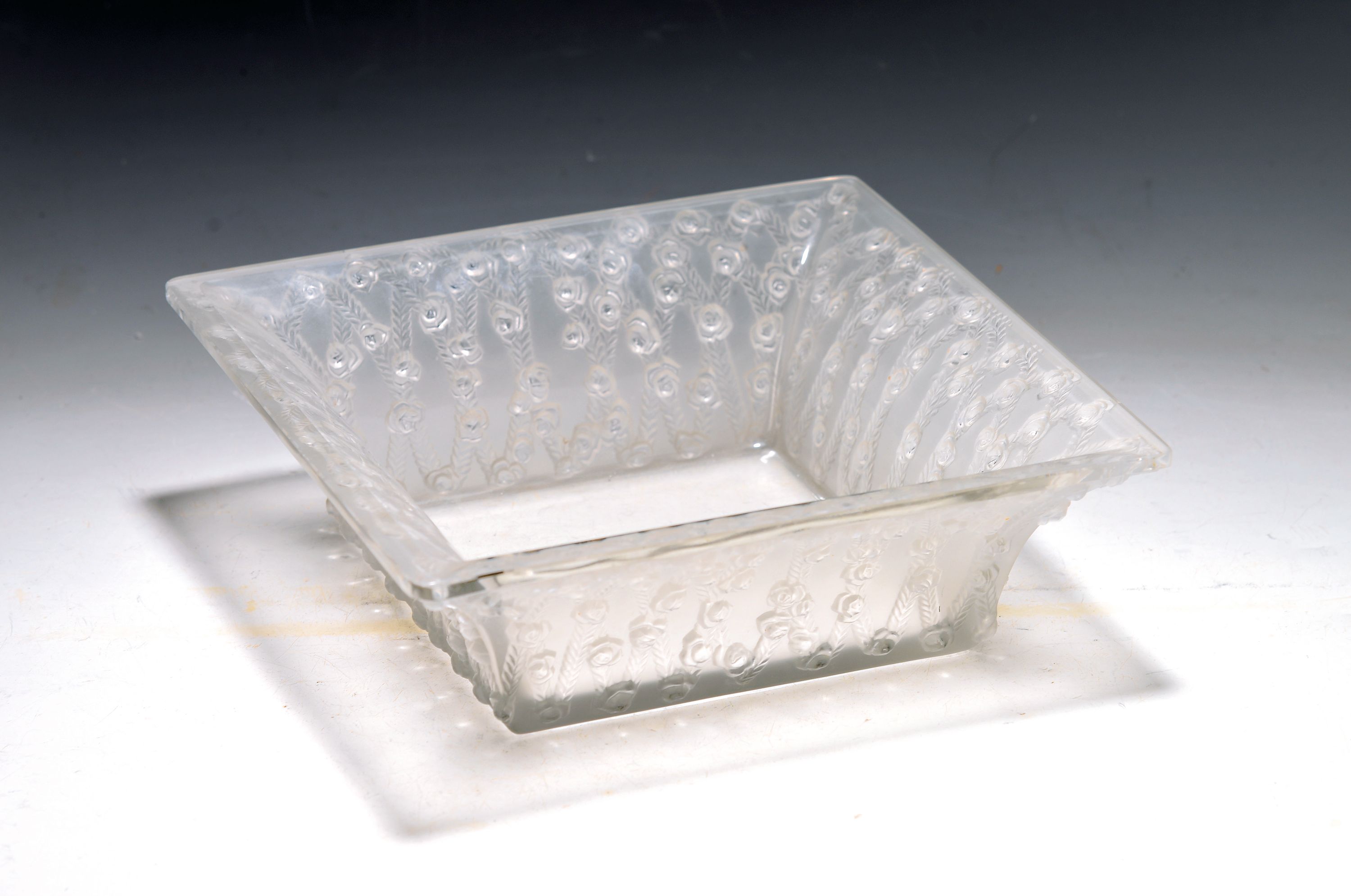 Quadratische Schale, "Roses", Rene Lalique, Entw. 1939, Ausformung bis 1951, farbloses