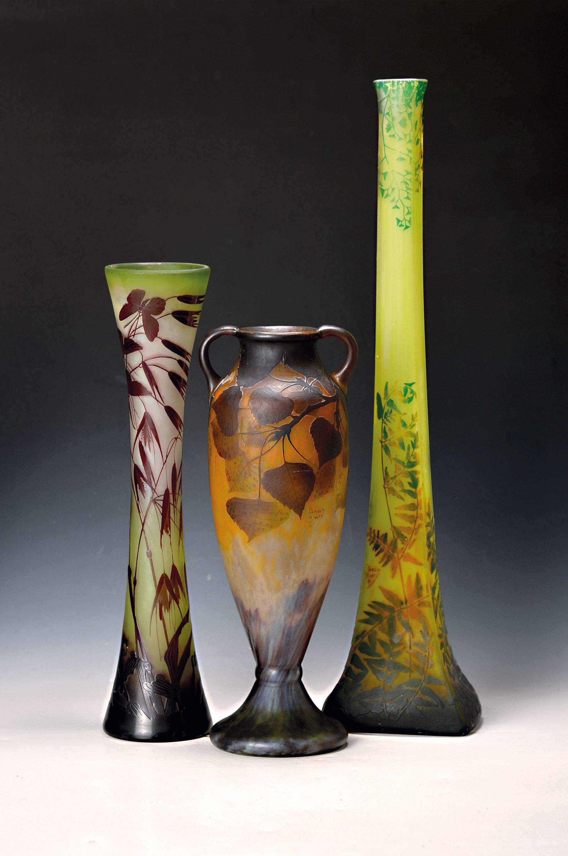 grün und braun überfangen, geschnitten, geschliffen und geätzt, umlaufender Farn-Dekor,