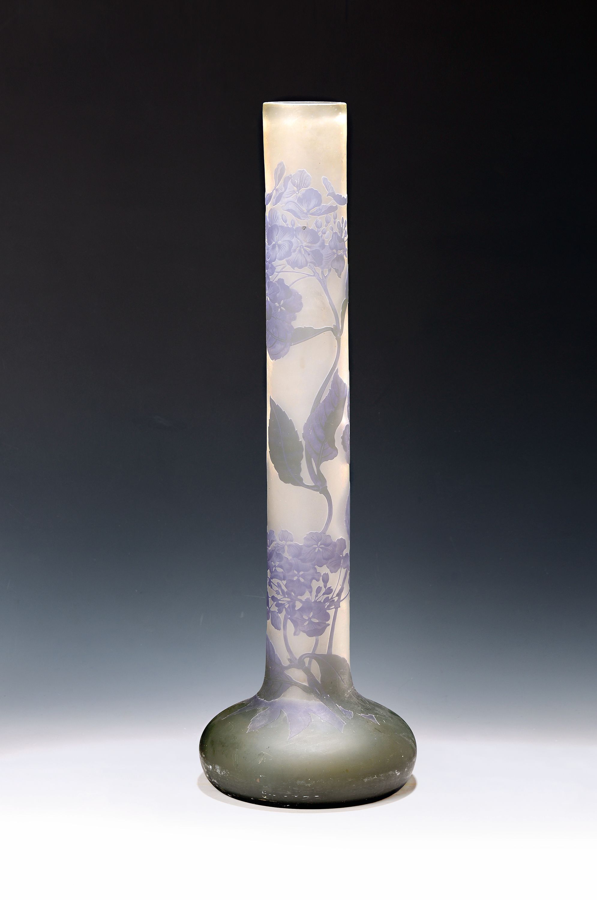 Besonders große Langhalsvase, Gallé, um 1920, Hortensien-Dekor, farbloses Schichtglas