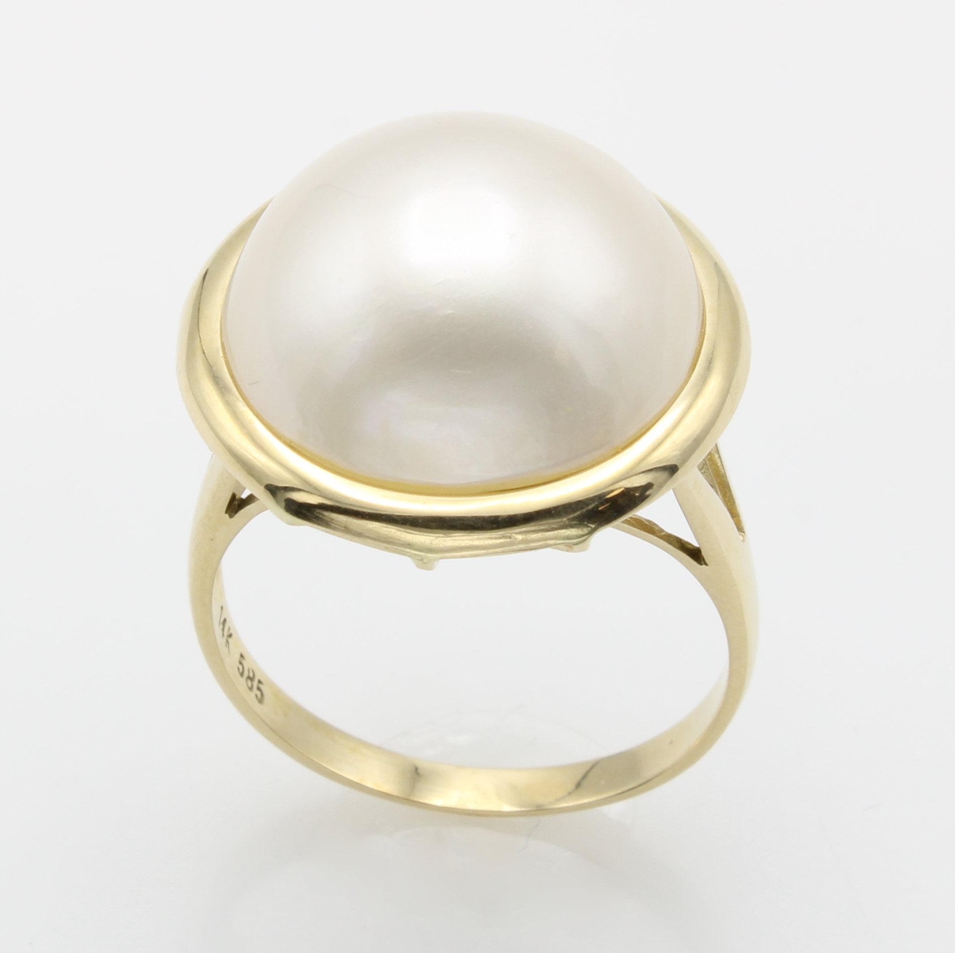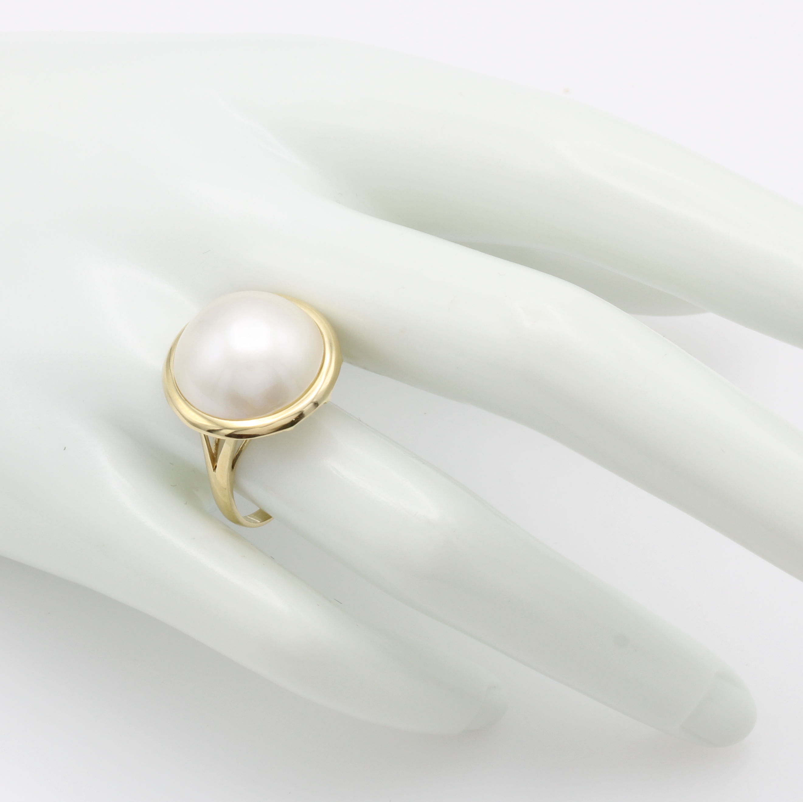 Ring mit Mabeperle, GG 585/000, weiße Perle in glatter Fassung ca. 15 mm, RW ca. 56 Schätzpreis: 850, - EUR