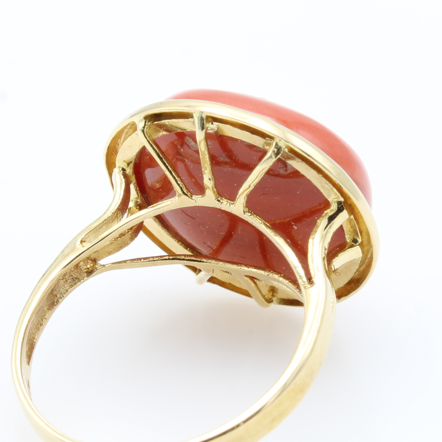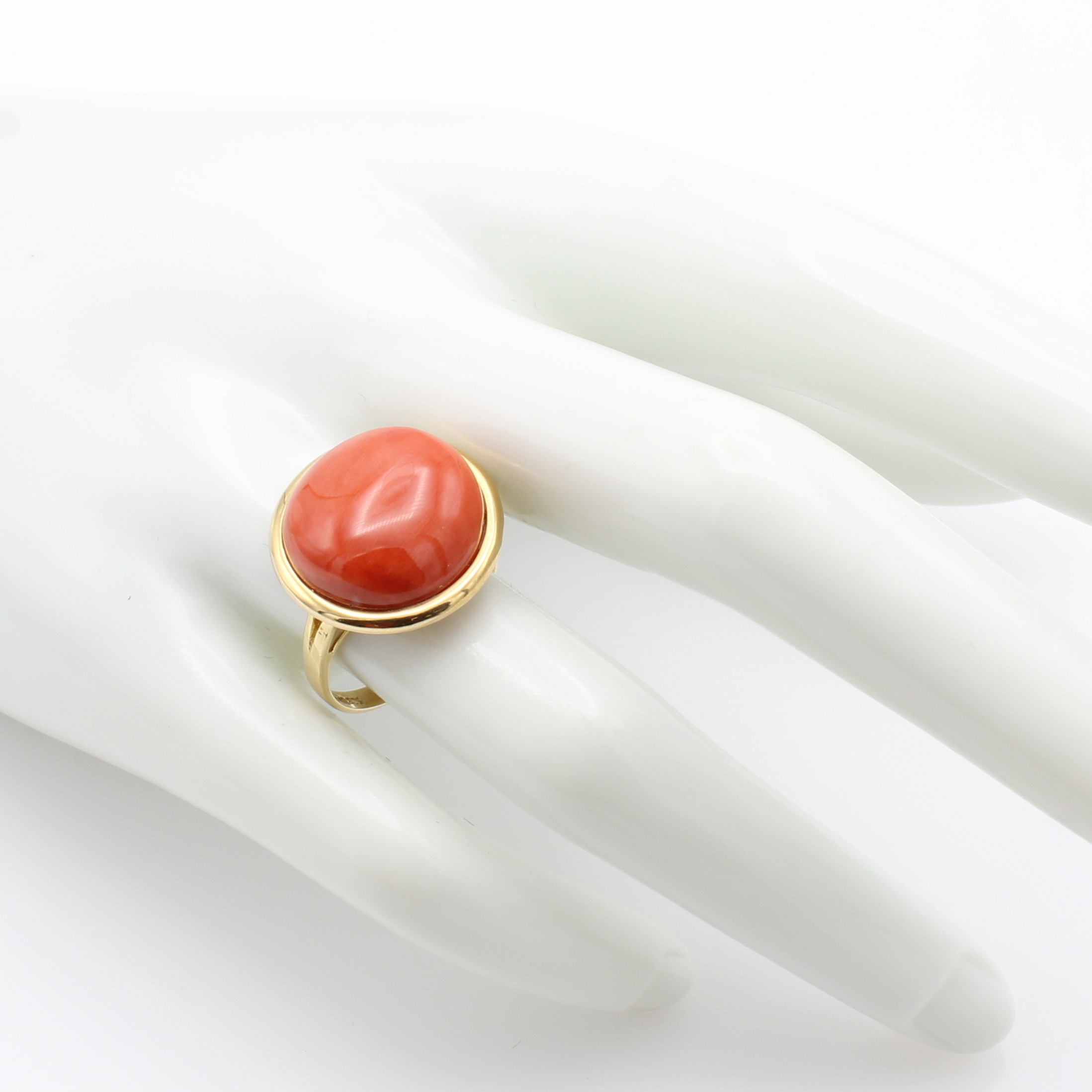 Ring mit Koralle, GG 585/000, bouttonf. Koralle ca. 16 mm in glatter Fassung, RW ca. 56, Versand nur innerhalb der EU Schätzpreis: 1580, - EUR