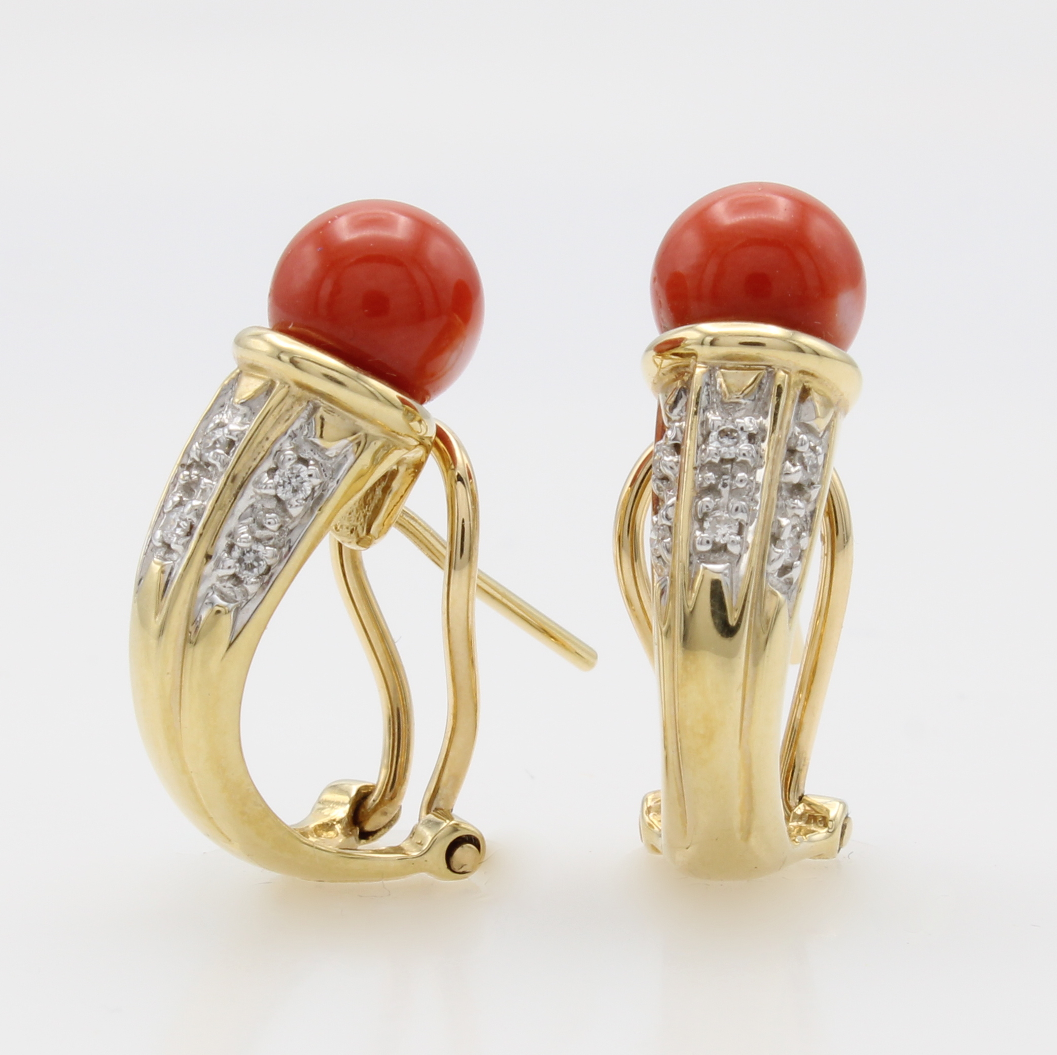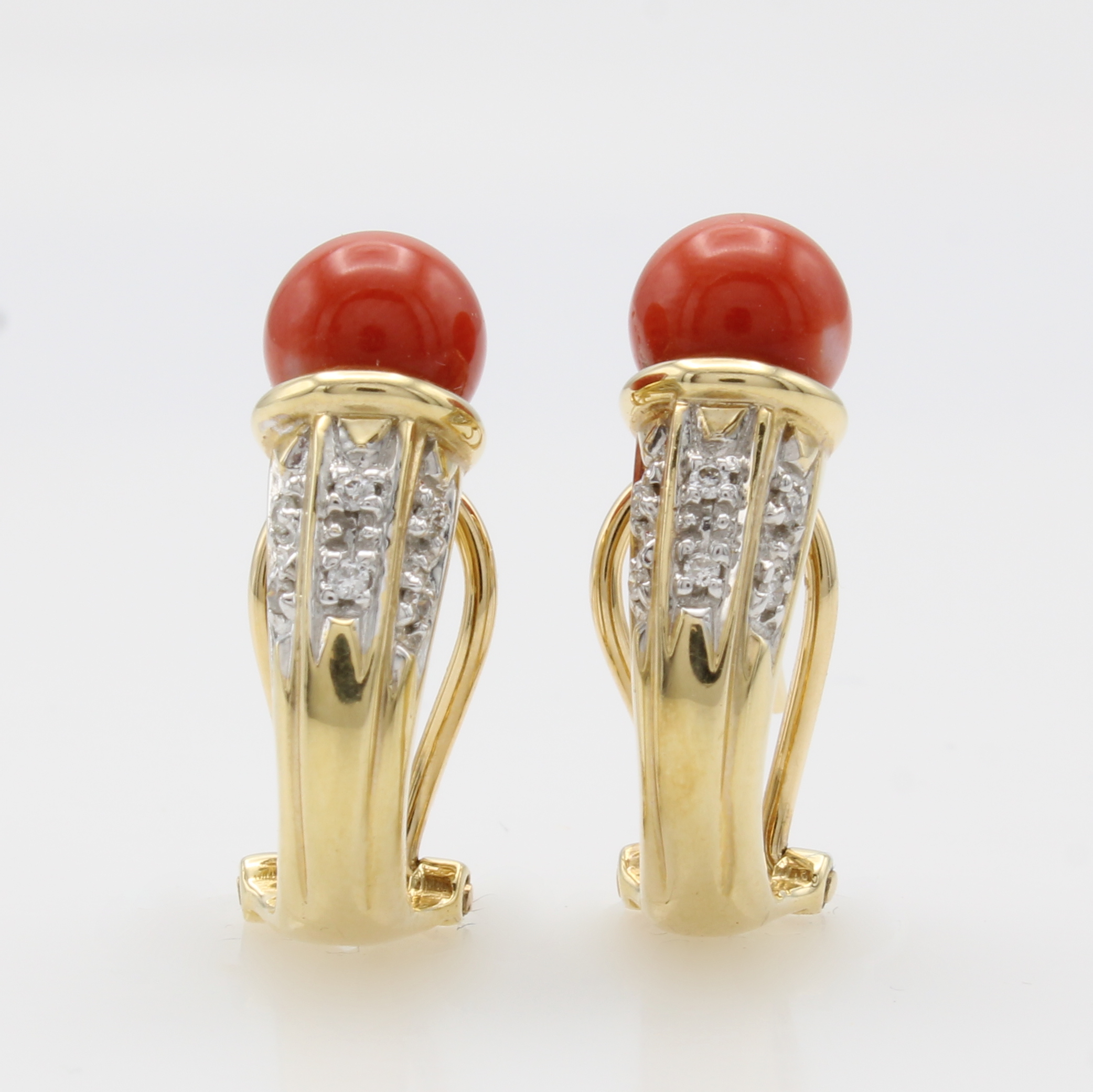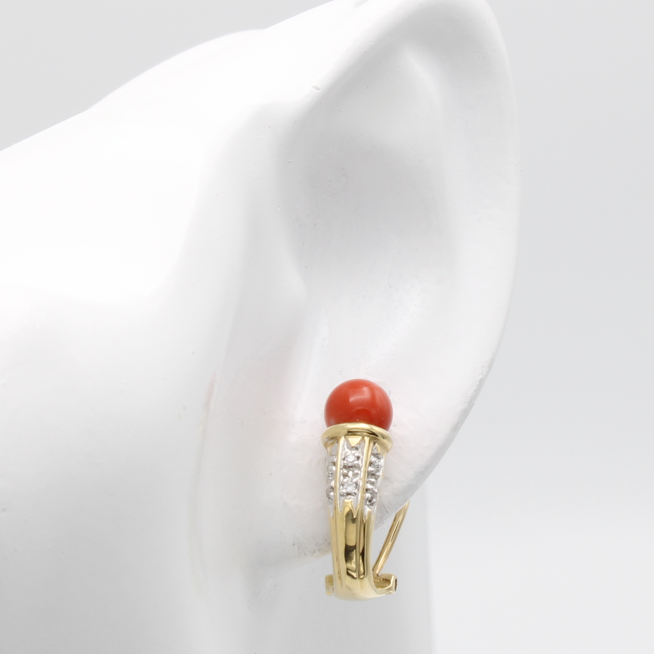 Paar Steckcreolen mit Korallen und Brillanten, GG 585/000, 2 Korallkugeln, D. ca. 6 mm, Brill. zus. ca. 0.12 ct Weiß/si, m. Clipbrisur, Versand nur innerhalb der EU Schätzpreis: 1000, - EUR