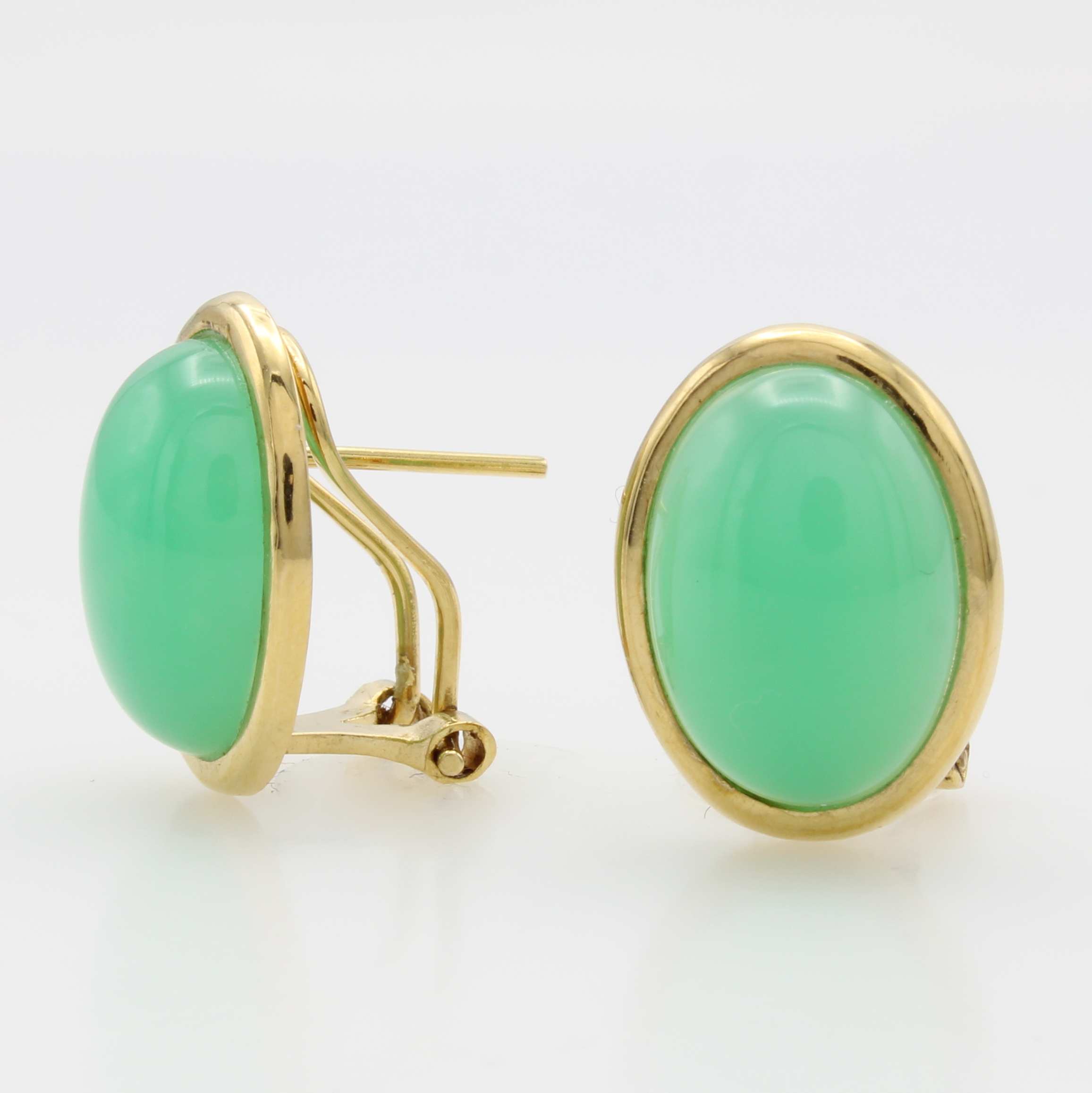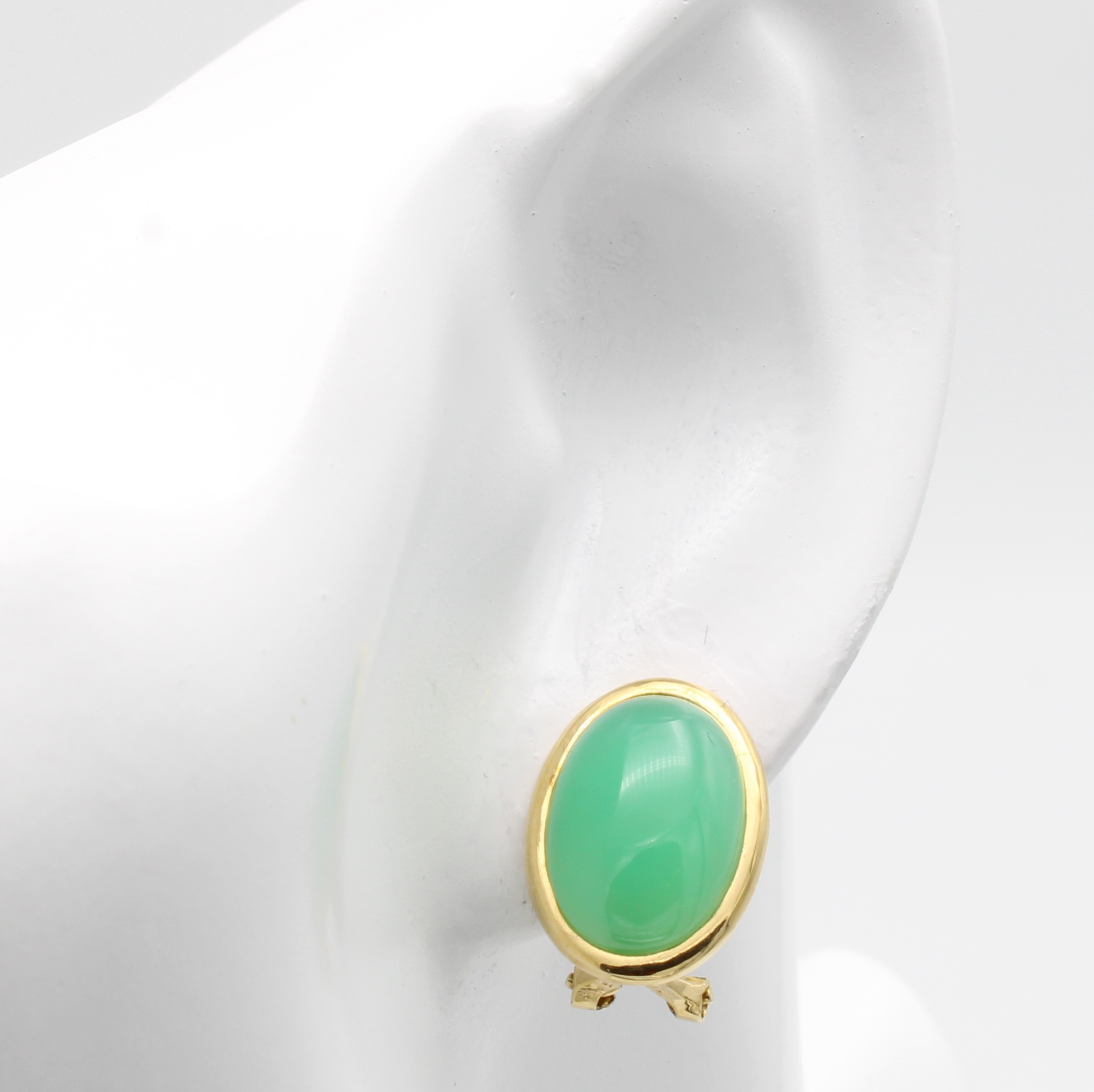 Paar Ohrstecker mit Chrysoprasen, GG 585/000, 2 ovale Chrysoprase in glatter Fassung, M. ca. 14x10 mm, m. Clipbrisur Schätzpreis: 1450, - EUR