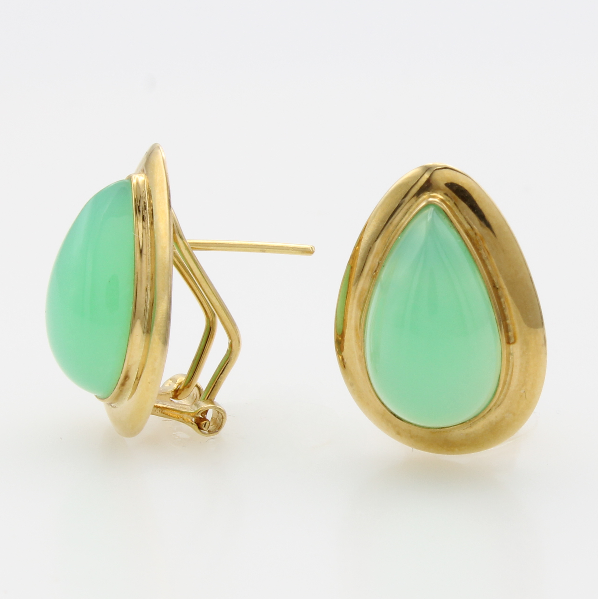 Paar Ohrstecker mit Chrysoprasen, GG 585/000, 2 tropfenf. Chrysoprase, M. ca. 13x8 mm, m. Clipbrisur Schätzpreis: 750, - EUR