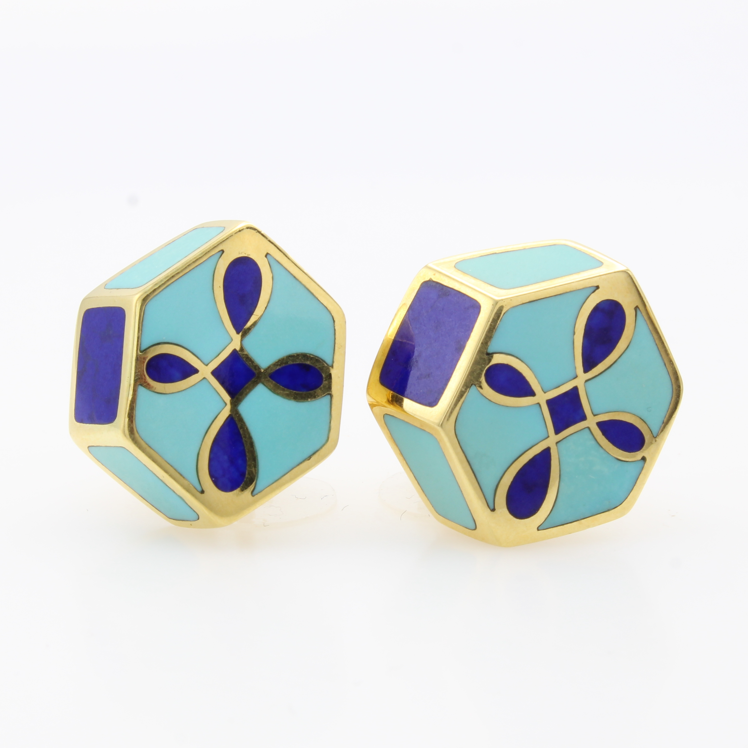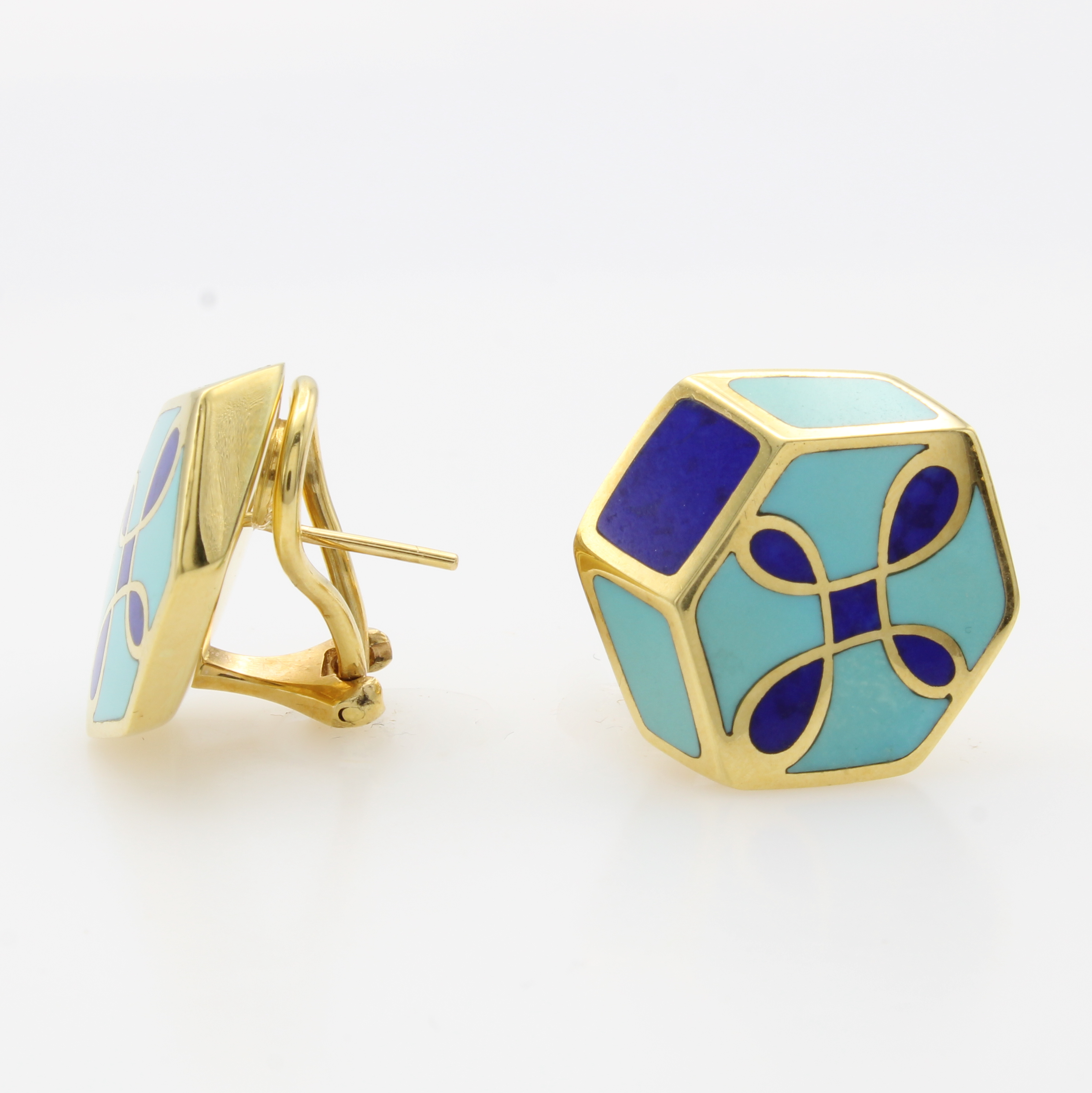Paar Ohrstecker mit Lapislazuli und Türkisen, GG 750/000, abgeschrägt gearb., mit Clipbrisur Schätzpreis: 1600, - EUR