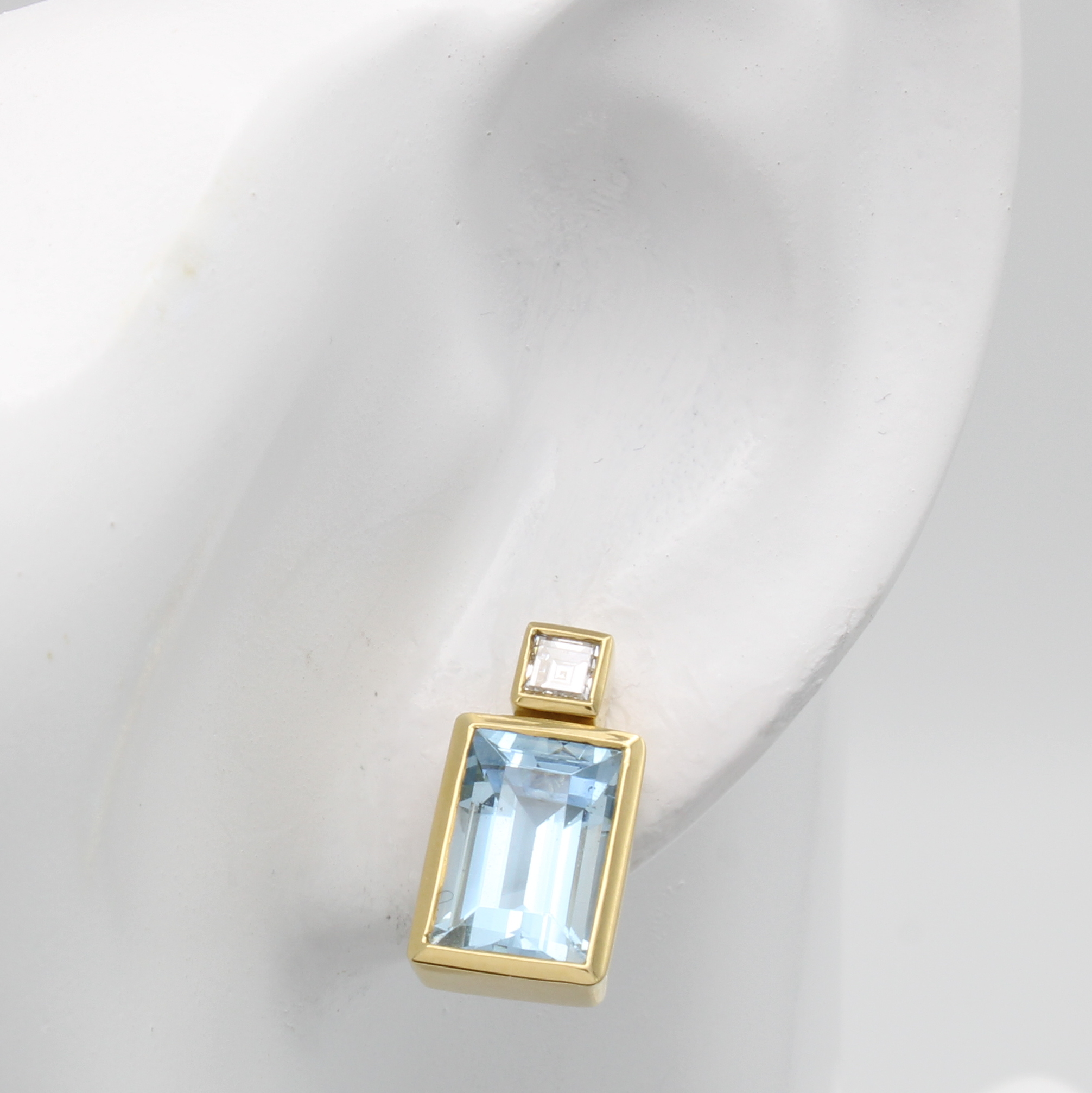 Paar Ohrstecker mit Aquamarinen und Diamanten, GG 750/000, 2 rechteckige Aquam. zus. ca. 6.2 ct, 2 carréef. Diam. zus. ca. 0.34 ct hochfeines Weiß/vs-si Schätzpreis: 5860, - EUR