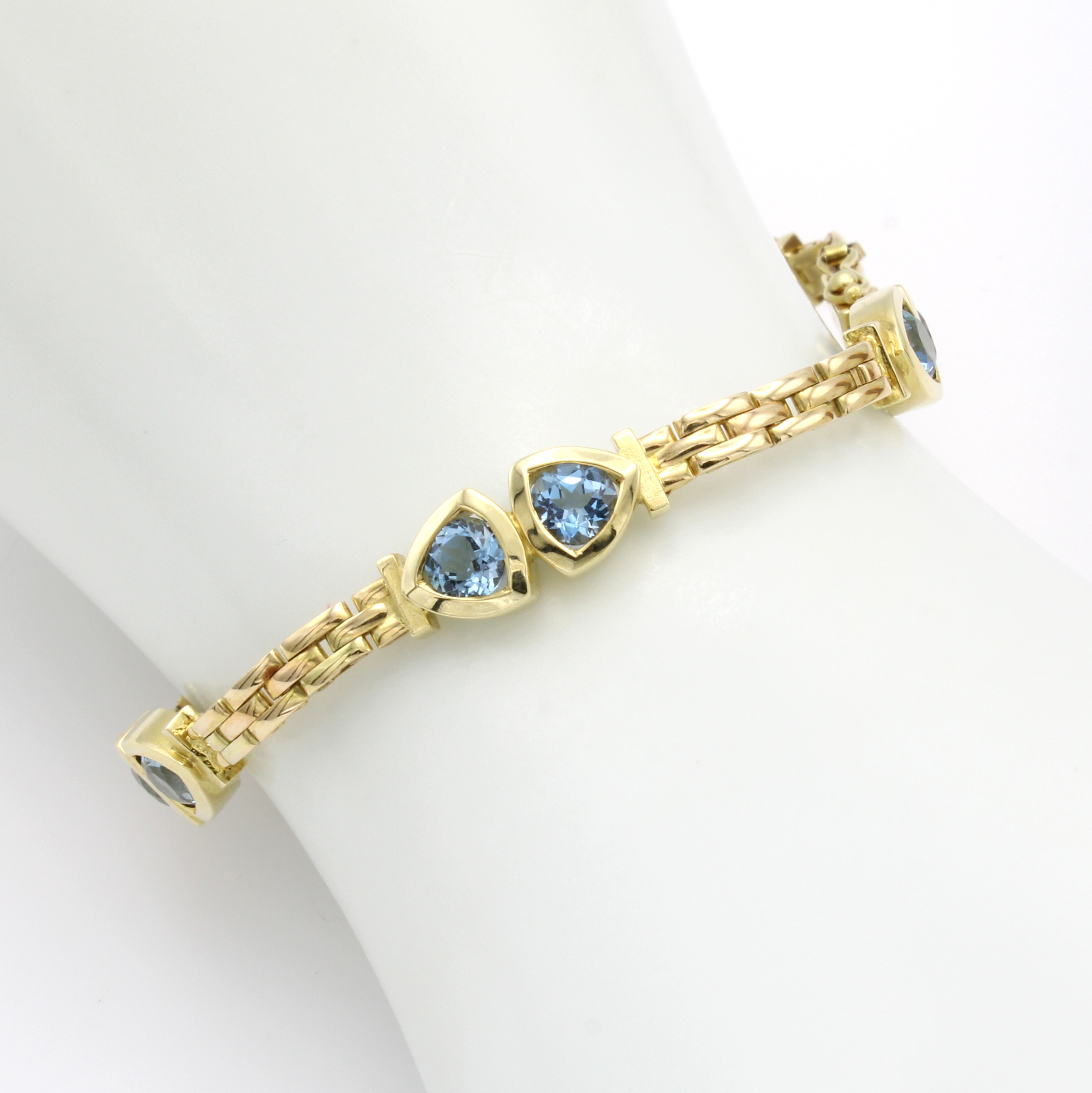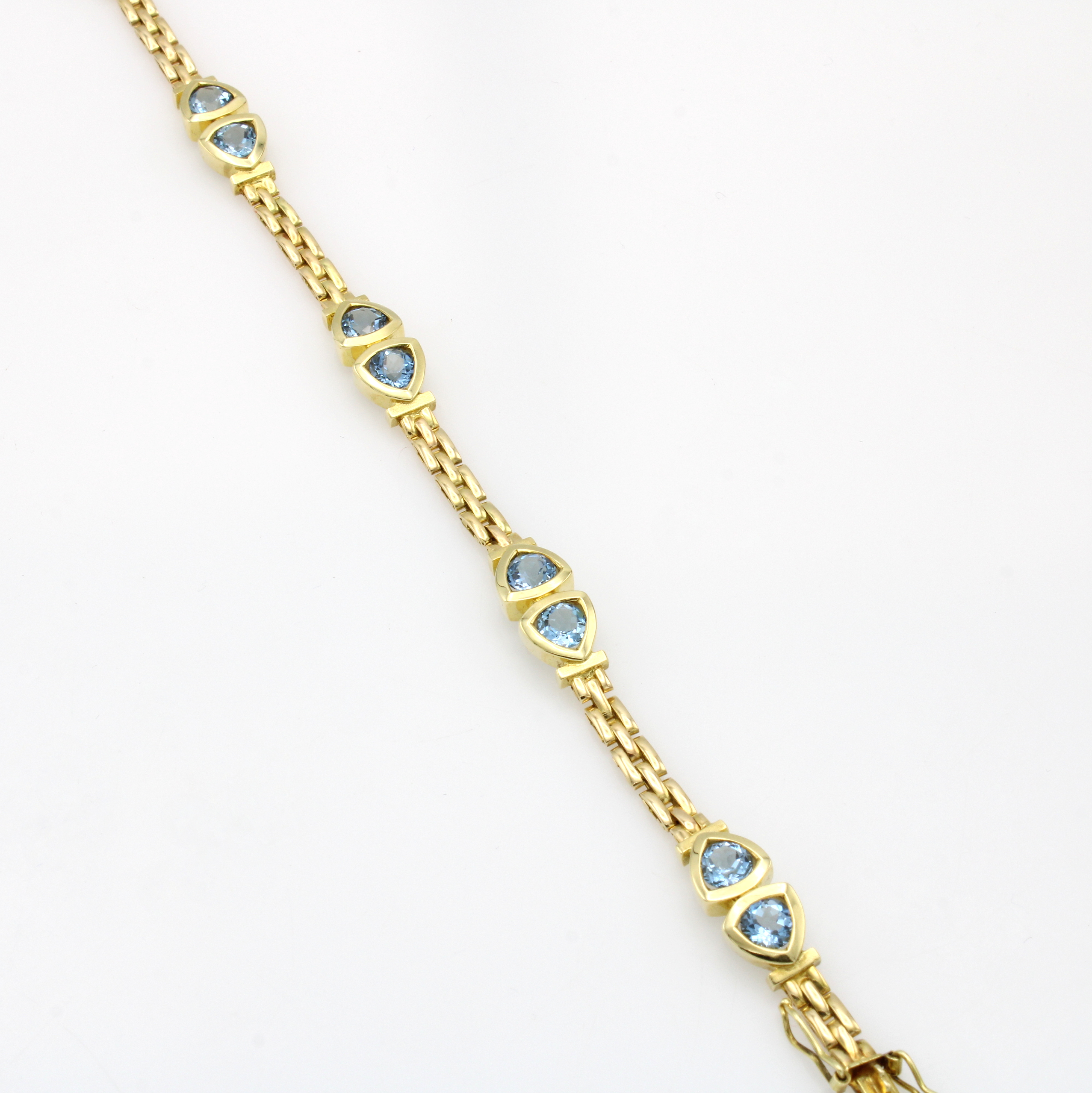 Backsteinarmband mit Aquamarinen, GG 585/000, 10 Aquam. in dreieckigen Fassungen zus. ca. 4.2 ct, Kastenschl. m. doppelter Sicherheits- acht, L. ca. 19.5 cm Schätzpreis: 7000, - EUR