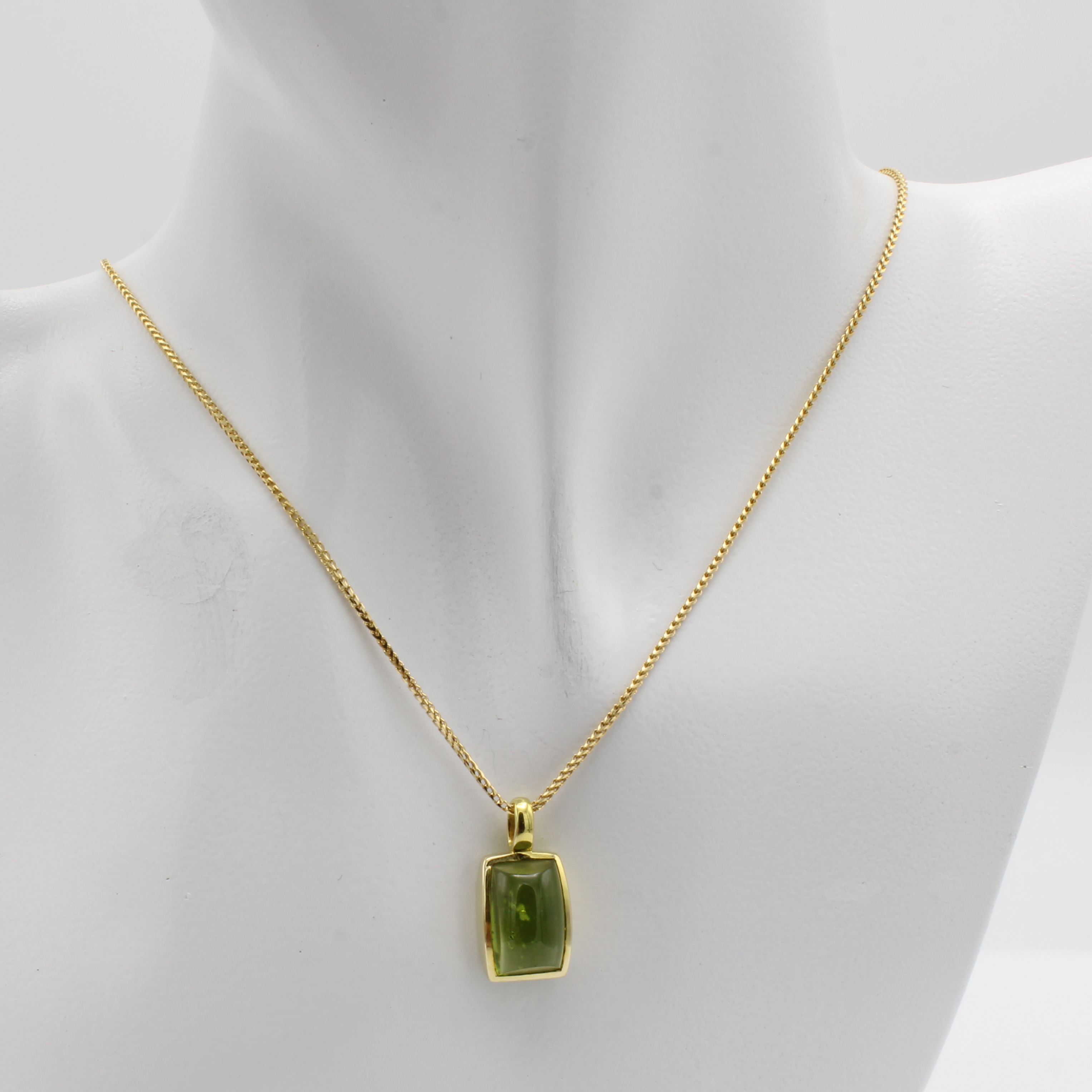 Anhänger mit Peridot an Kette, GG 585/000, rechteckiger Peridotcabochon ca. 6.4 ct, L. ca. 44.5 cm Schätzpreis: 2300, - EUR